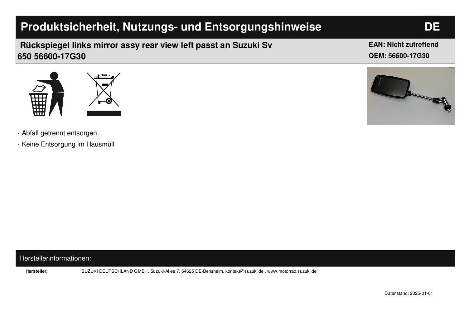 Rückspiegel links mirror assy rear view left passt an Suzuki Sv 650 56600-17G30