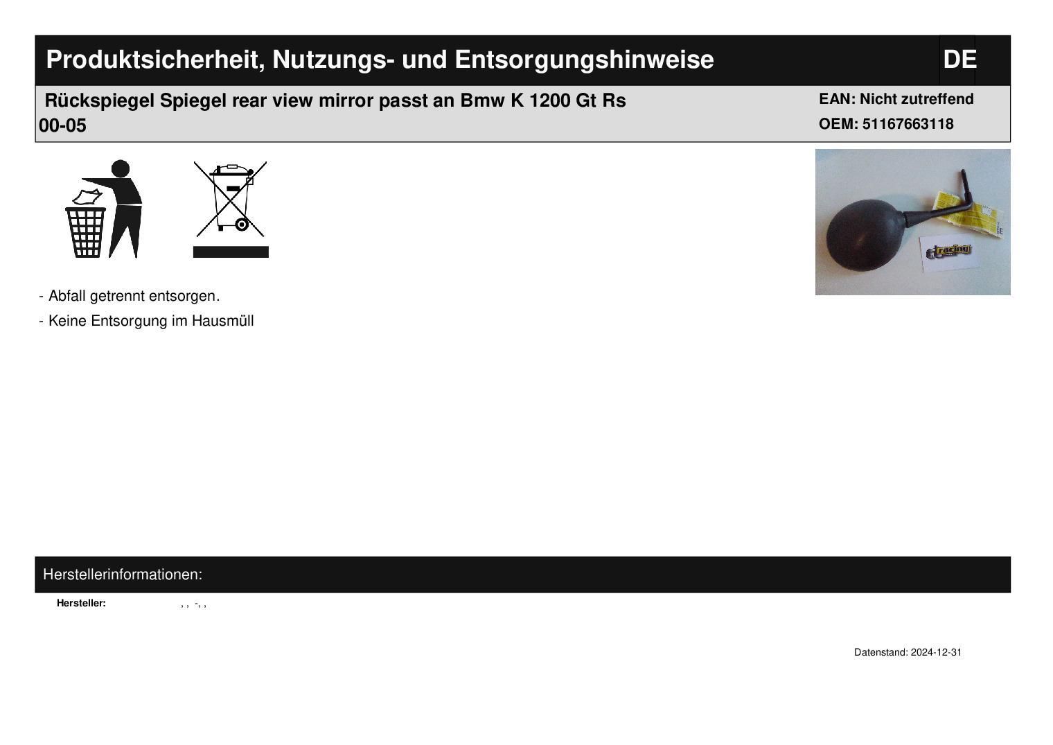 Rückspiegel Spiegel rear view mirror passt an Bmw K 1200 Gt Rs 00-05 In dieser Auktion gibt es folgenden Artikel zu kaufen: Rückspiegel (siehe Foto) Modell: passend für BMW K 1200 GT Bj.: 00 - 05 K 1200 RS Bj.: 00 - 05 Lieferumfang: siehe Foto Artikelzustand: neu aus Geschäftsauflösung, mit minimale