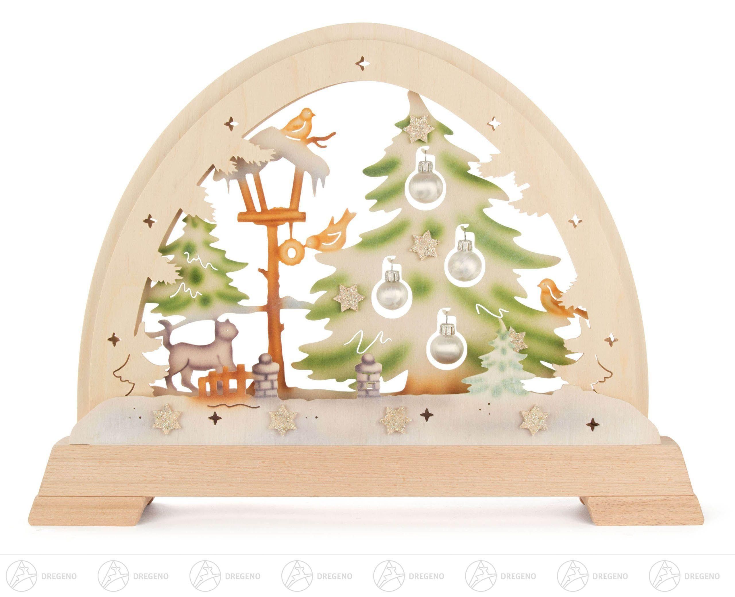 Rundbogen mit Katze und Kugeln farbig, elektrisch beleuchtet BxHxT = 48x37 NEU