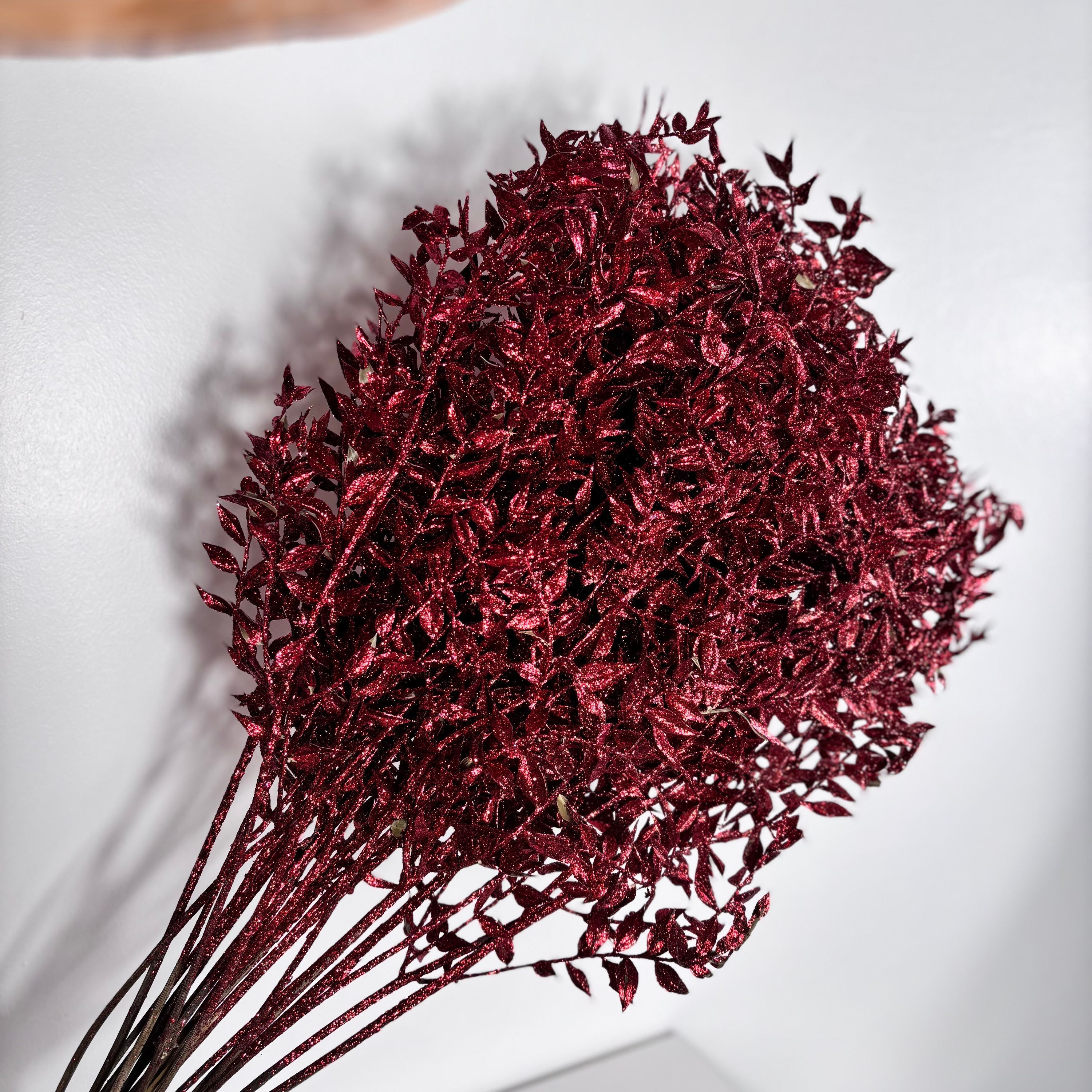 ð??¹ Festlicher Hingucker: Ruscus in glitzerndem Rot â?? perfekt für weihnachtliche Dekorationen, Adventskränze und festliche Blumenarrangements.