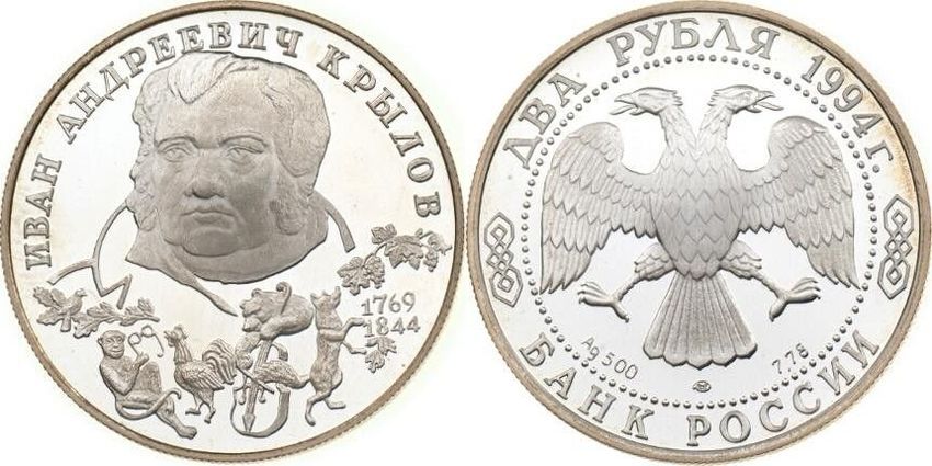 Russland Silbermünze Spiegelglanz PP Proof 2 Rubel 1994 Fabeldichter IVAN KRYLOV 225. Geburtstag, K.M. 343