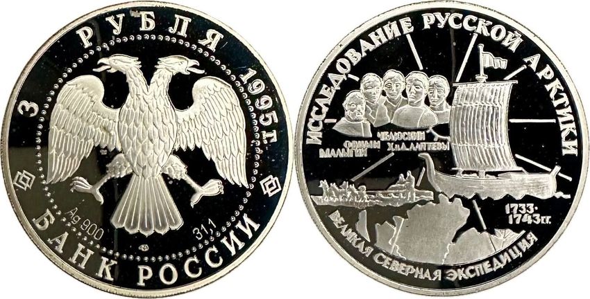 Russland Silbermünze PP Proof Spiegelglanz 3 Rubel 1995 Expedition in die russische Arktis 1733-1743, KM 461