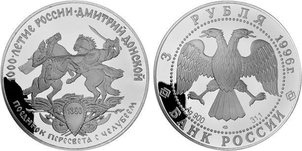 Russland Silbermünze 34,56 g. PP Proof, Spiegelglanz 3 Rubel 1996 Reiterduell zwischen PERESVET und dem Tatarenfürsten Celubaj in der Schlacht auf dem Schnepfenfeld (1380) K.M. 477