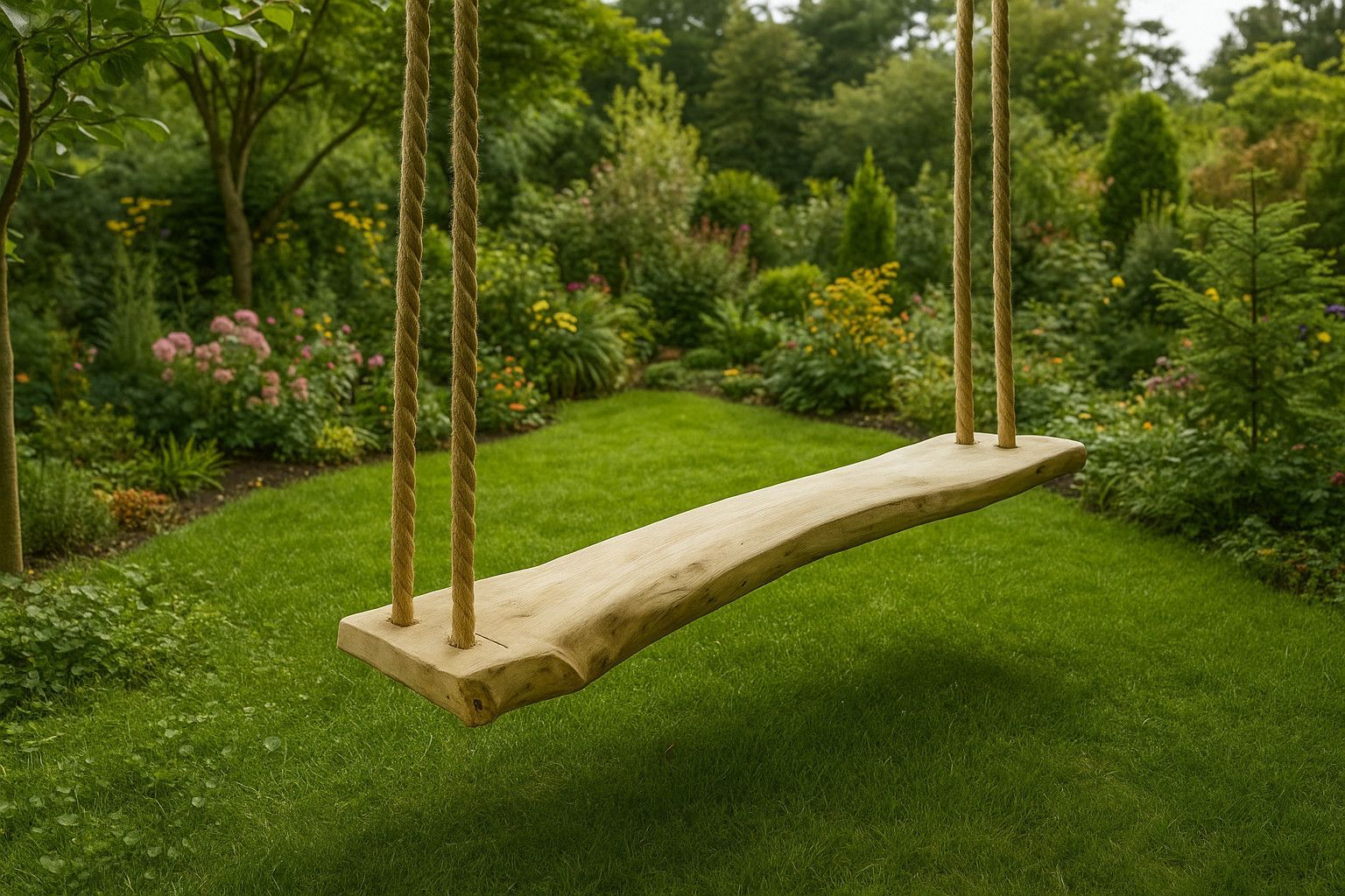 Rustikale Holzschaukel aus massiven Wallnussholz mit Seil