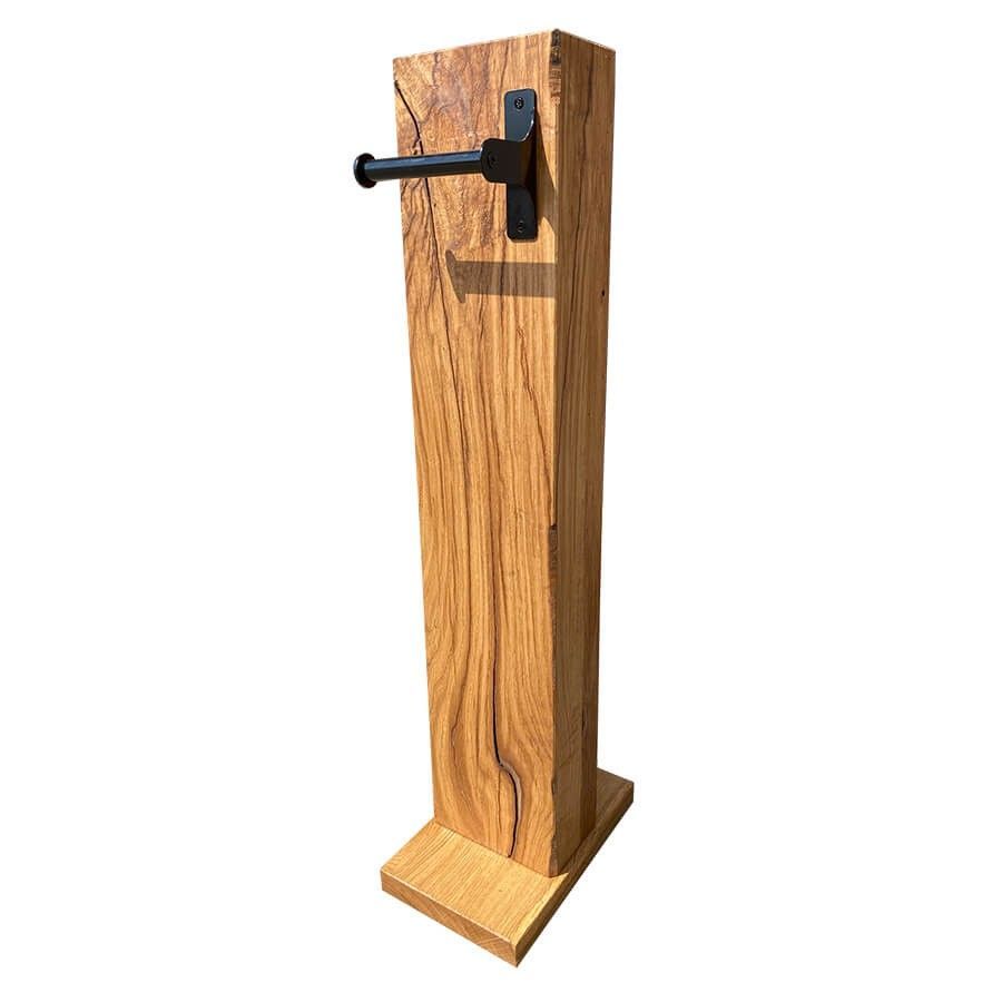 Wir bieten sehr schöne und rustikale Massivholz Toilettenpapierhalter Klopapierhalter aus kammergetrockneter massiver Eiche zum Verkauf. Die Säule ist aus durchgehenden Eichen-Vollholzlamellen verleimt. Aus Transportgründen wird der schwarze Rollenhalter inkl. Schrauben separat mitgeliefert. Das Hol