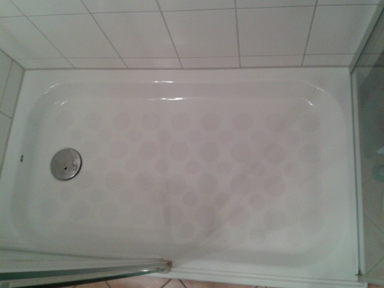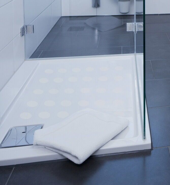 Anti Rutsch Punkte in weiß gekörnter Ausführung für Ihre Dusche oder Badewanne, ca. 0,22mm dick. Diese Variante wird gewerblichen Bereichen wie Hotels und Firmen Duschen sowie bei Menschen mit Handicap bevorzugt eingesetzt. Die Folie ist auf R-12 nach DIN 51130 und auf NB-C nach DIN 51097 geprüft. E