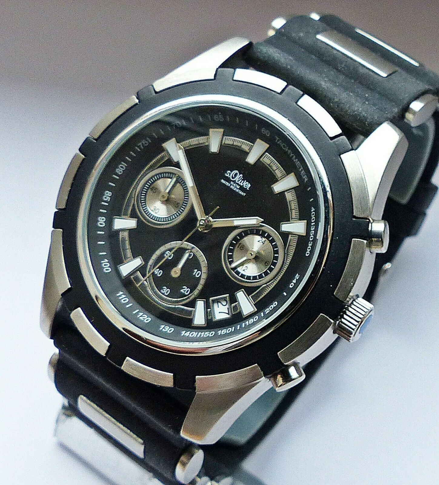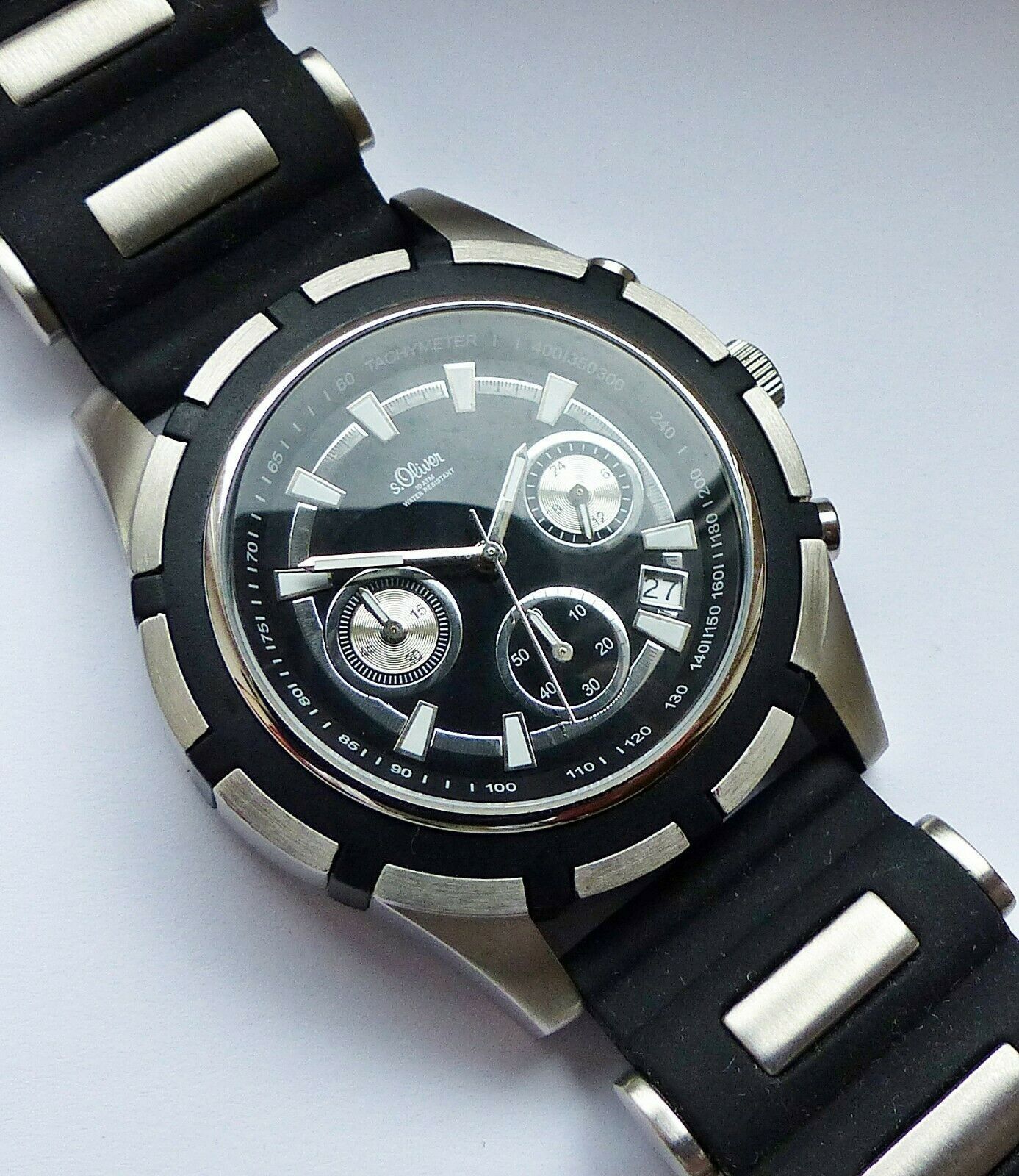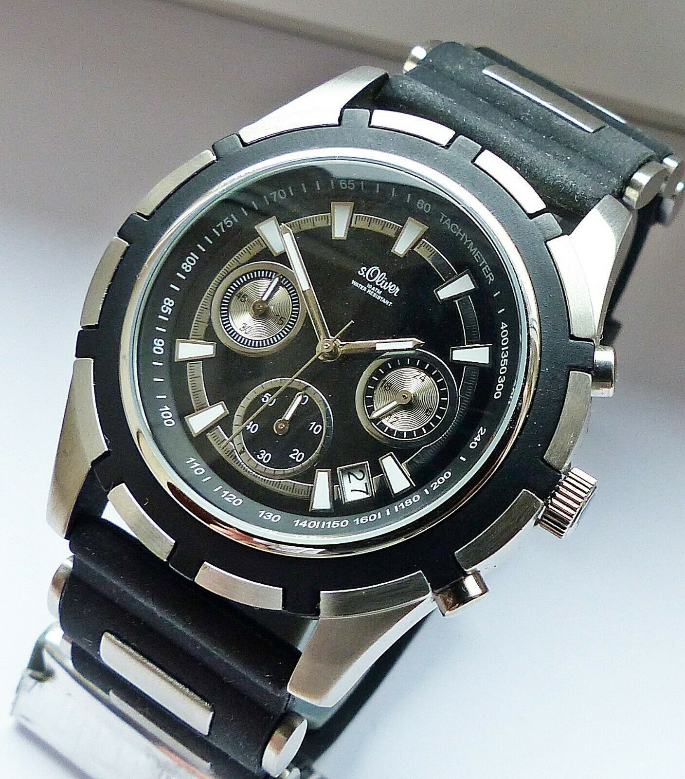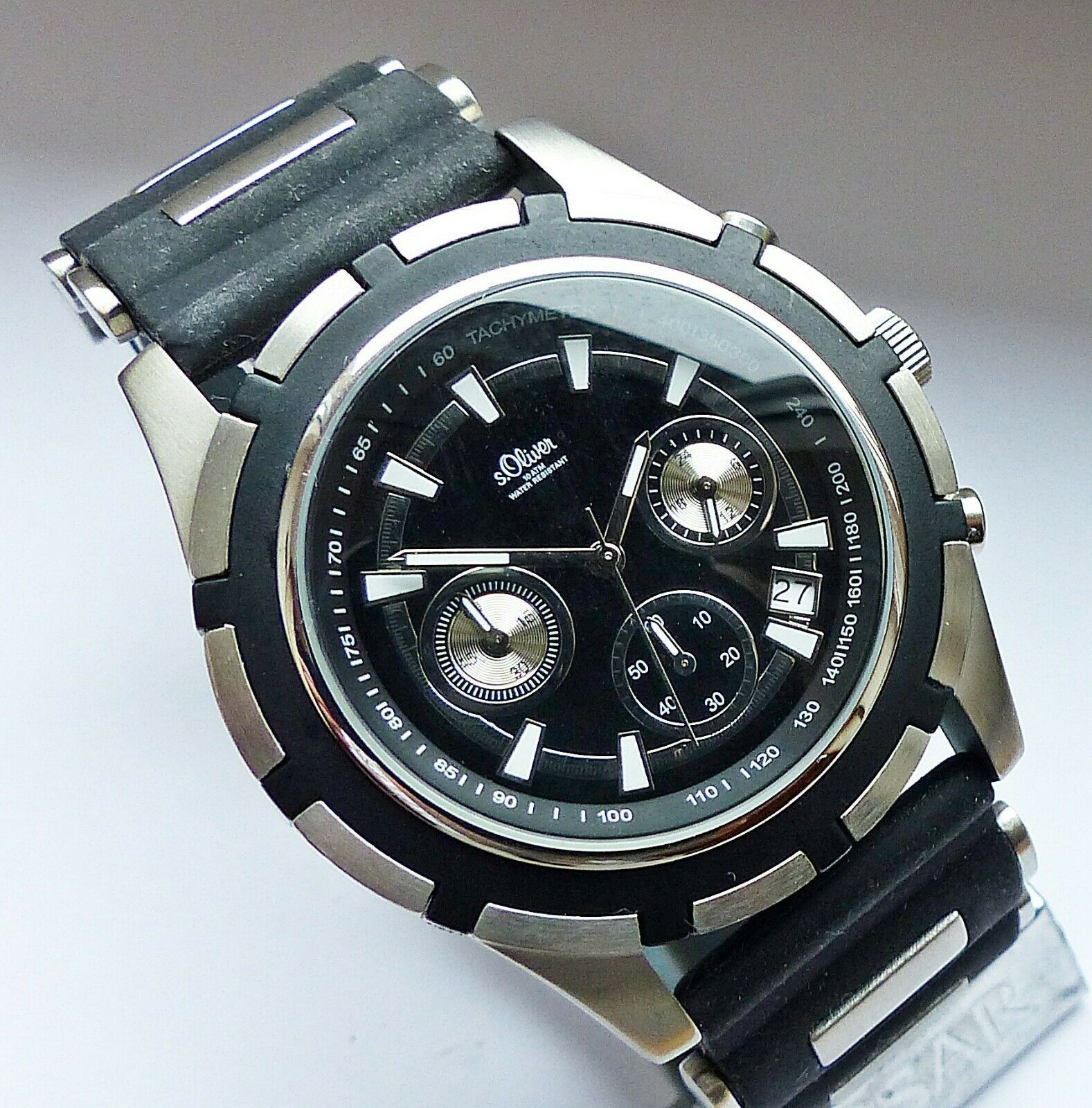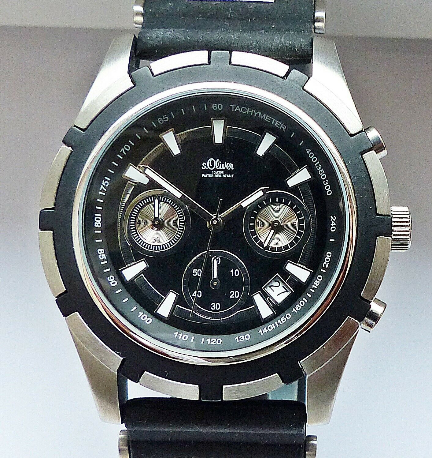 Hersteller : S. Oliver Modell WR100 Sport Chronograph mit Zusatzdatum auf 4.30Uhr, Schwarzem Zifferblatt mit aufgesetzten Silber-Weissen Indexen, fluoreszierenden Zeigern und Indexen Uhrwerk : Kaliber Miyota Japan Material Gehäuse : Komplett in Edelstahl gebürstet Durchmesser Gehäuse : ca.45mm x 13m