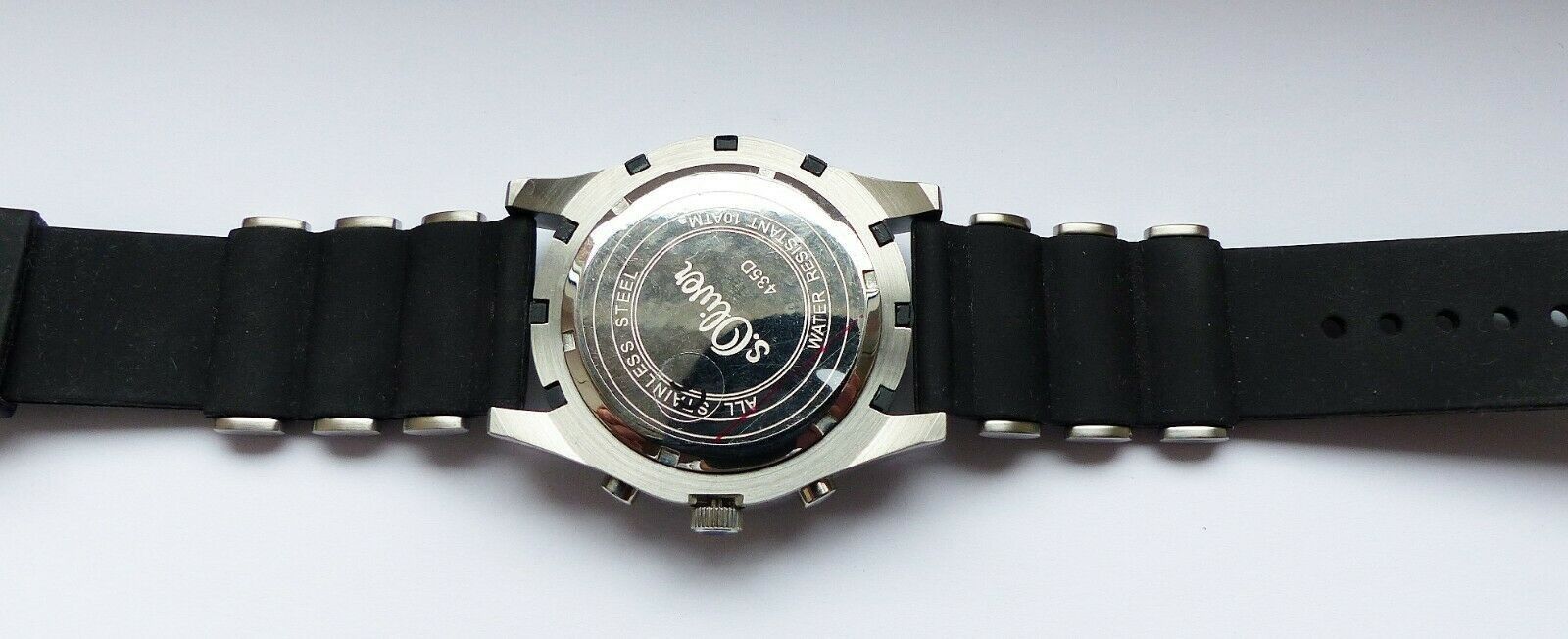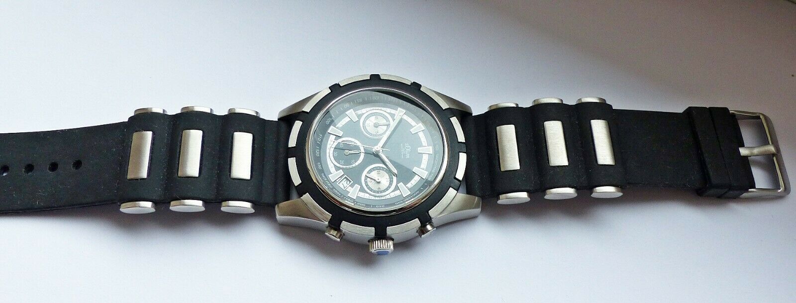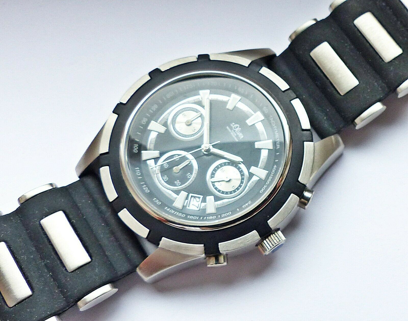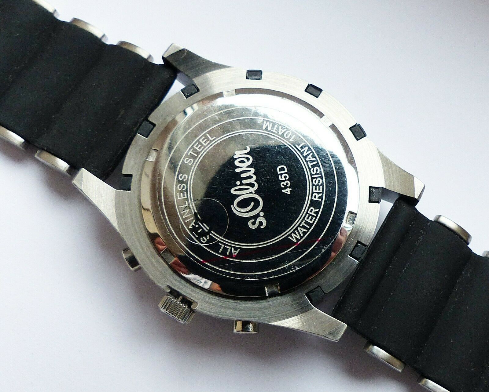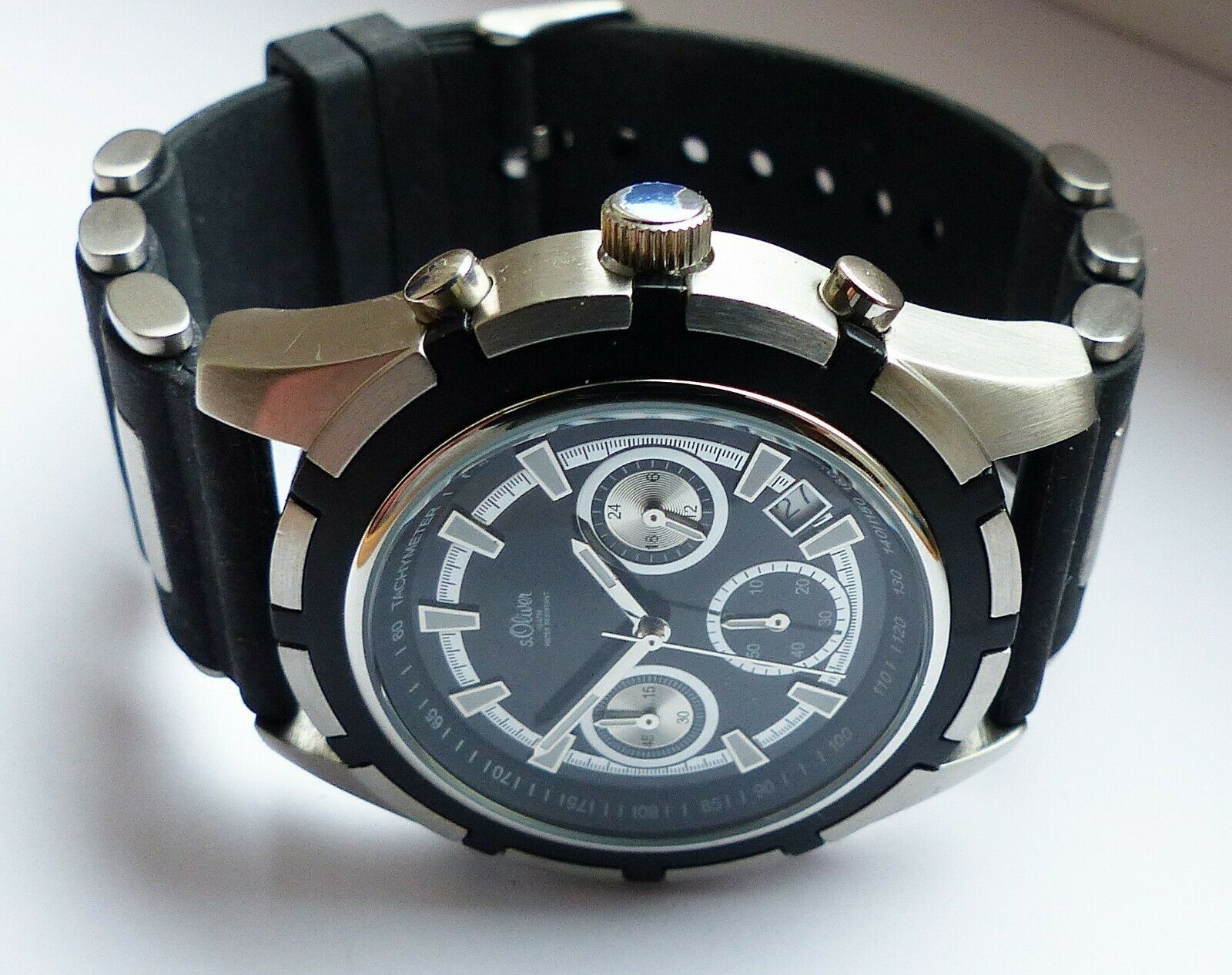Hersteller : S. Oliver Modell WR100 Sport Chronograph mit Zusatzdatum auf 4.30Uhr, Schwarzem Zifferblatt mit aufgesetzten Silber-Weissen Indexen, fluoreszierenden Zeigern und Indexen Uhrwerk : Kaliber Miyota Japan Material Gehäuse : Komplett in Edelstahl gebürstet Durchmesser Gehäuse : ca.45mm x 13m