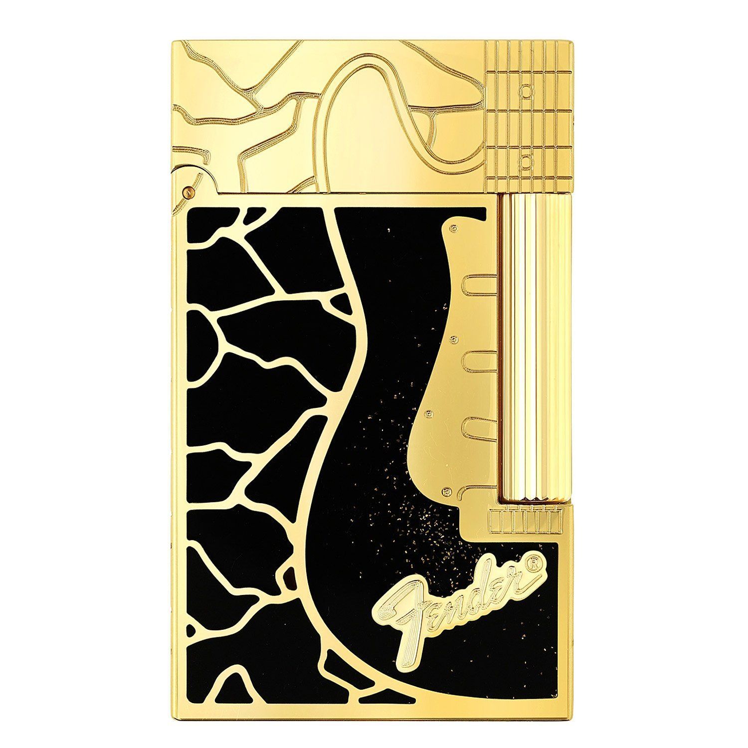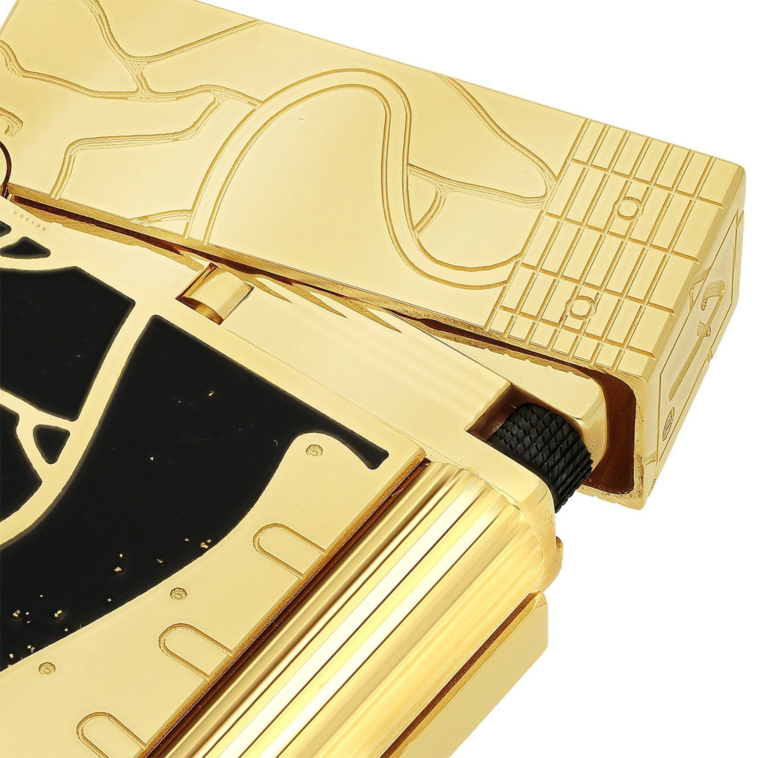 Set mit Kette, Luxus-Feuerzeug aus der Serie S.T. Dupont Ligne 2, mit Zigarrenbrenner, massives Gehäuse mit polierter goldfarbener Auflage, mit dem typischen "Cling" beim Öffnen, aufwändig verziert mit stilisierten Gitarren-Gravuren , Lack in Schwarz, gravierter Marken-Schriftzug und Seriennummer, geriffelte Zündwalze, Größe 61 x 37 x 11 mm, Gewicht 133 g, der Versand erfolgt ohne Gasfüllung, Kette aus Chrom mit einem Anhänger in Form eines Plektrums, Logogravur, Ankerkette, Stärke 3 m