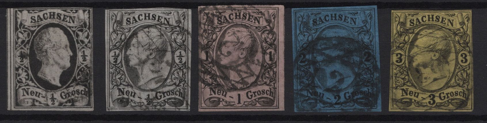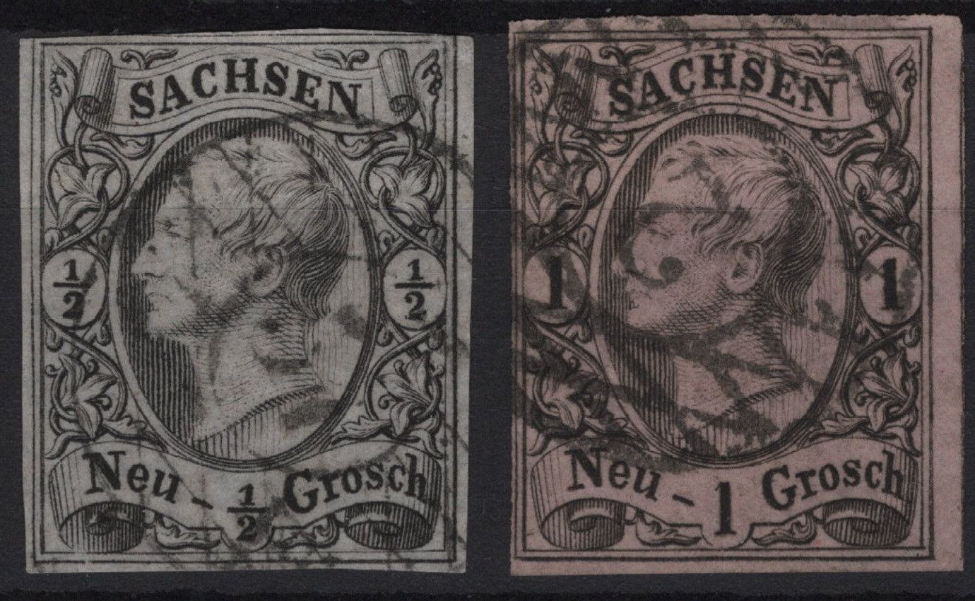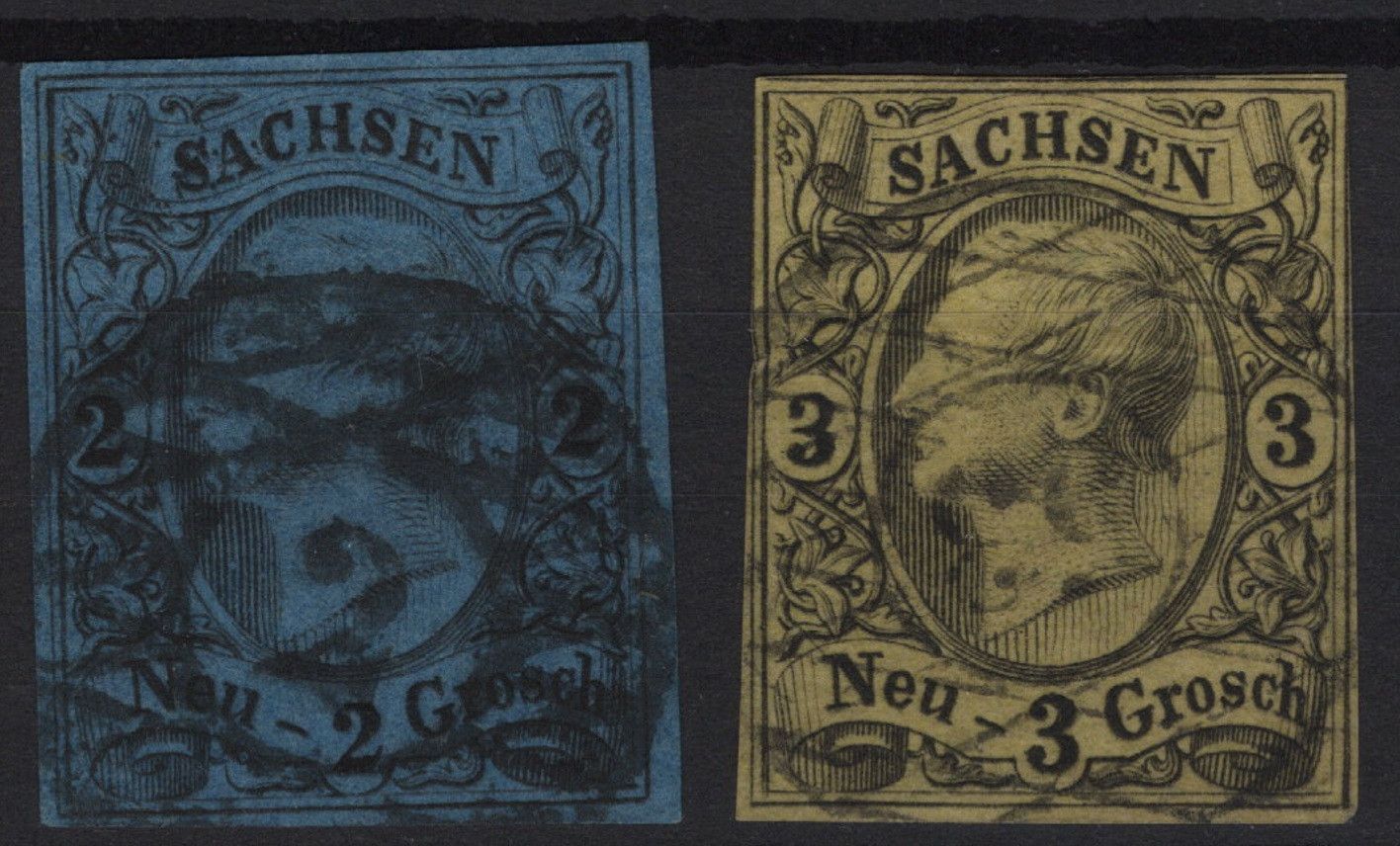 Erhaltung siehe Scans, etwas unterschiedlich, ein Übersichtsbild und mehrere Detailbilder. Sachsen Lot MiNr 3a, 8I, 9, 10a,11 gestempelt. 3a, dünne Stelle. --- 8I, oben berührt, winzige Schürfungen. --- 11, mit Nummernstempel 53 'Meerane'. Rechter Rand Papierstauchung, linke und rechte Rahmenlinie b... Mehr