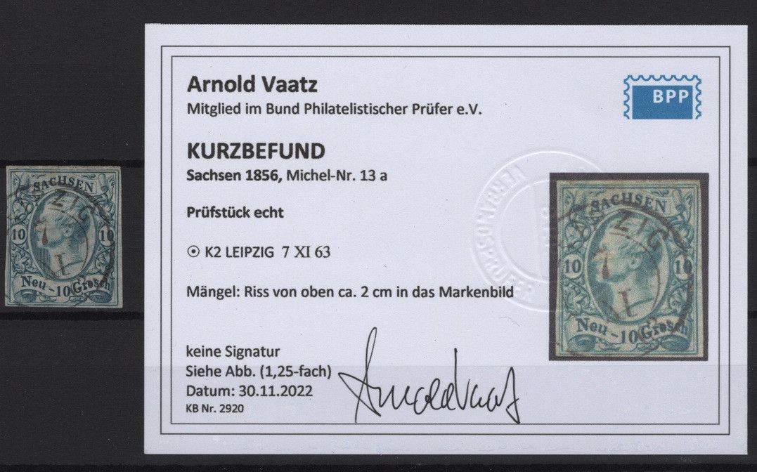 Erhaltung siehe Scans. MiNr. 13a gestempelt mit K2 LEIPZIG 7 XI 63. Riss von oben ca. 2 cm in das Markenfeld. Kurzbefund Vaatz BPP.... Mehr