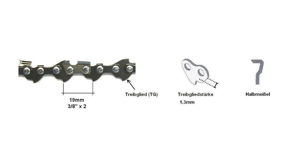 zum Verkauf steht eine Sägekette 3 8 x 1,3mm Treibgliedstärke - verfügbare Treibgliederzahl oben wählbar - Teilung: 3 8 (19mm : 2) - Treibgliedstärke: 1,3mm - Zahnform: Halbmeißel , weiches Schneidverhalten und geringes Rückschlagrisiko - die Kette hat folgende Merkmale: Pantendet Steel bis zu 125%