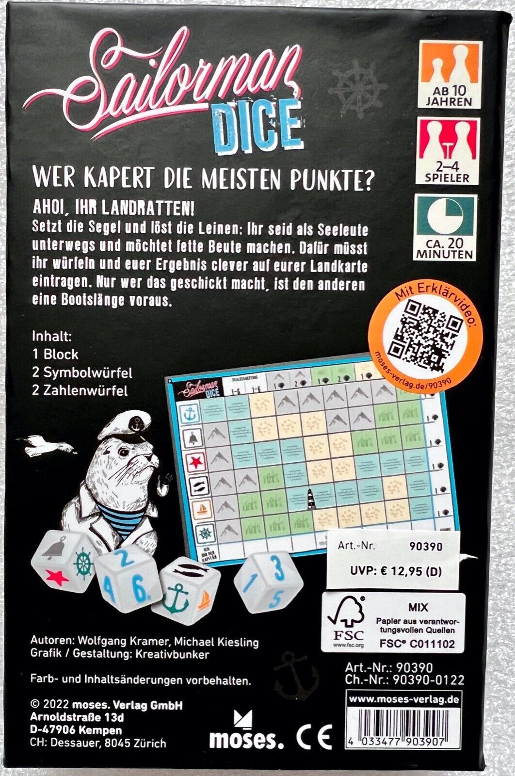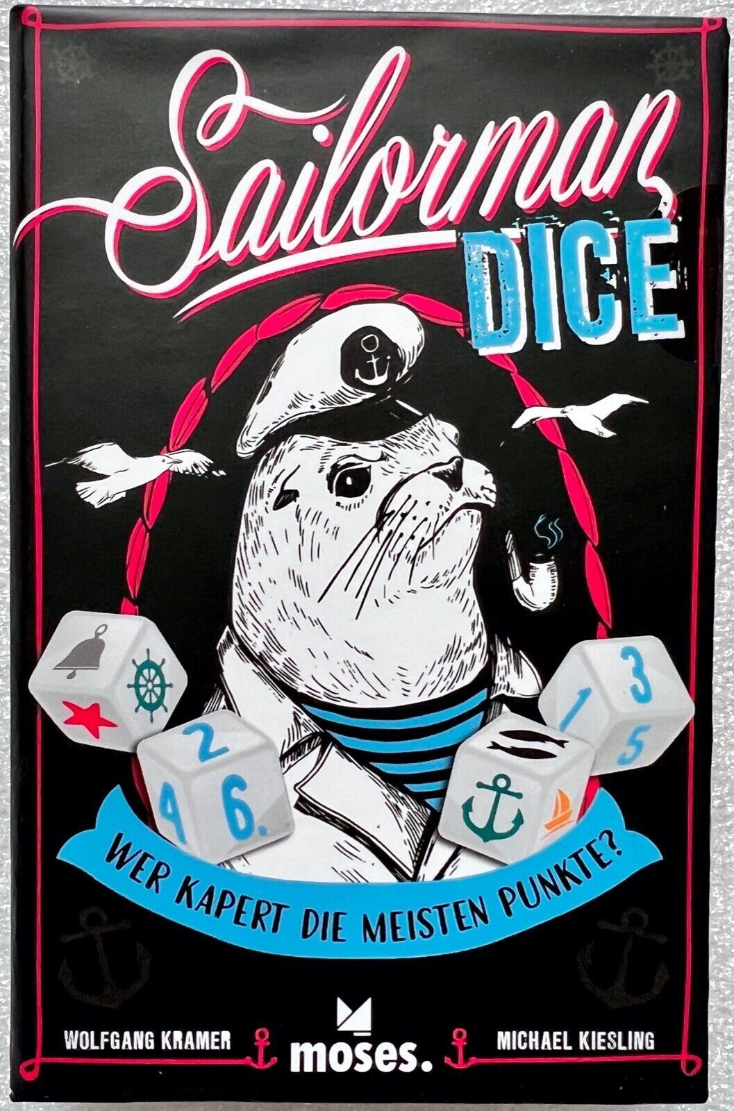 Spieleranzahl: 2 bis 4 Spieler Spieldauer: 20 Minuten Altersempfehlung: 10 + Sailorman Dice - Würfelspiel Bereit, in hohe See zu stechen und die meisten Punkte einzufahrenEuro Anker lichten! Beim spannenden Würfelspiel Sailorman Dice werden die Spieler*innen zu waschechten Seeleuten, die fette Beute
