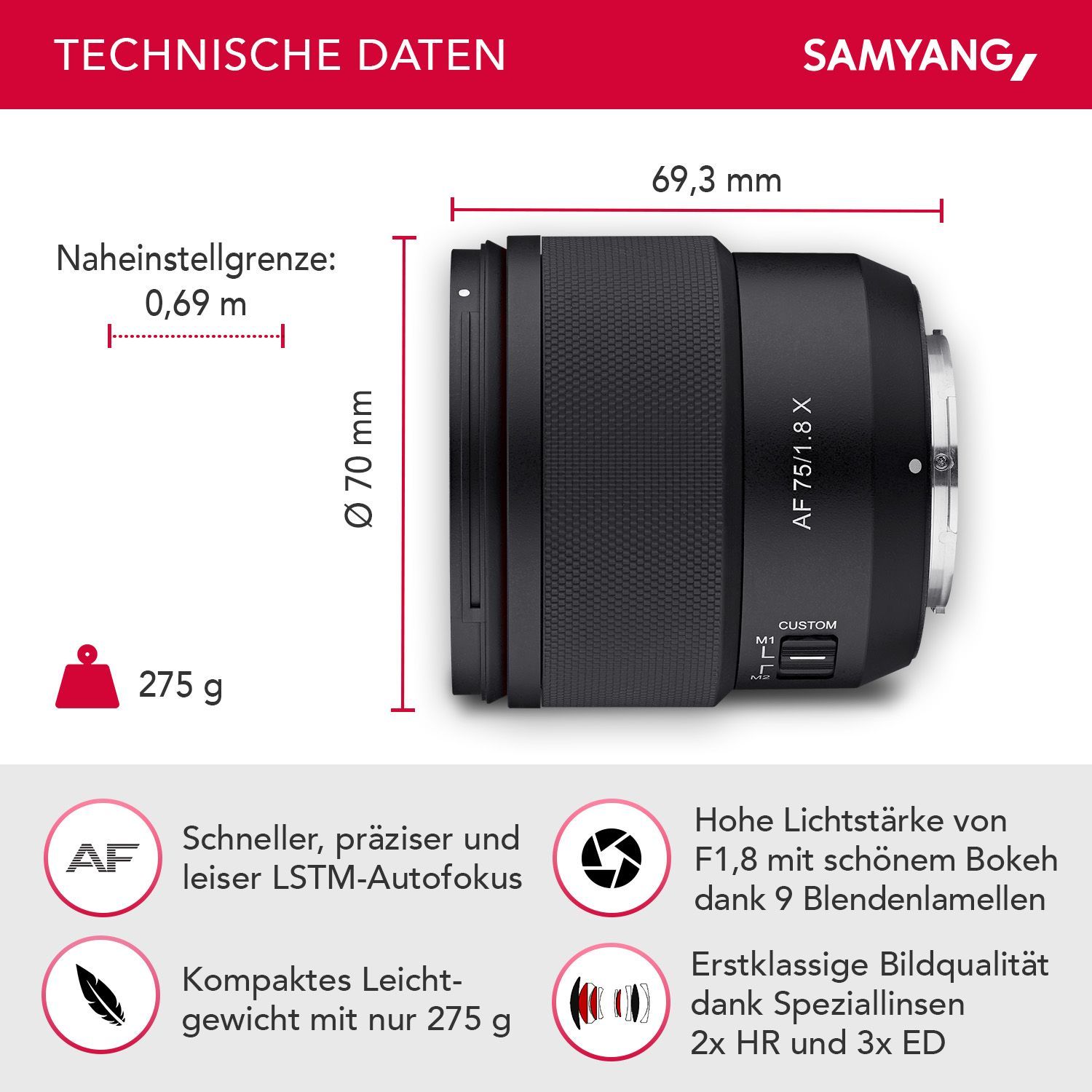 Samyang Samyang AF 75 mm Portraitobjektiv kompatibel Fujifilm X Kamera Objektiv Portrait