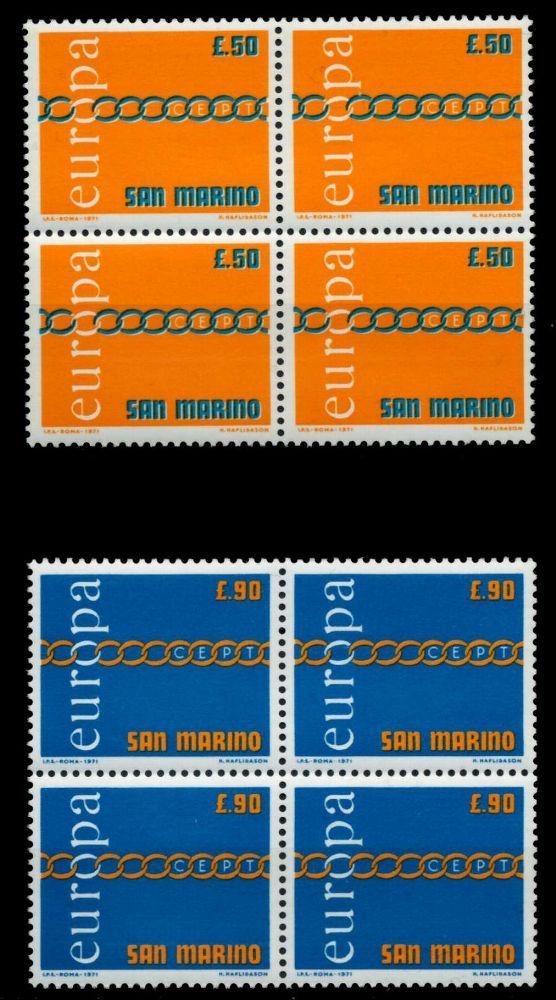 SAN MARINO 1971 Nr 975-976 postfrisch VIERERBLOCK Europa Gemeinschaftsausgaben CEPT 1971 0.77€ incl. MwSt: Differenzbesteuert zzgl. Versandkosten Bestell-Nr.: S0426C6 Katalog-Nr: MICHEL (975 - 976) Katalogpreis: 2 EUR Qualität: Normal Erhaltung: Postfrisch ** Einheit: Satz, 4er Block Bogenlage: