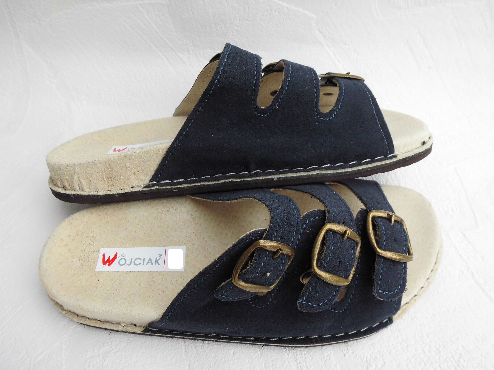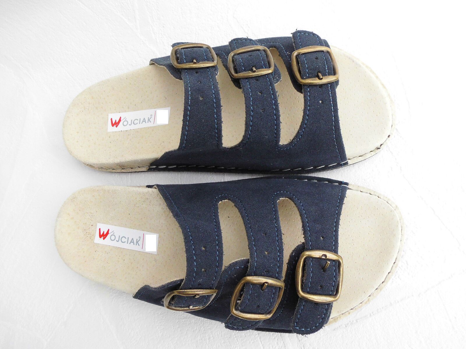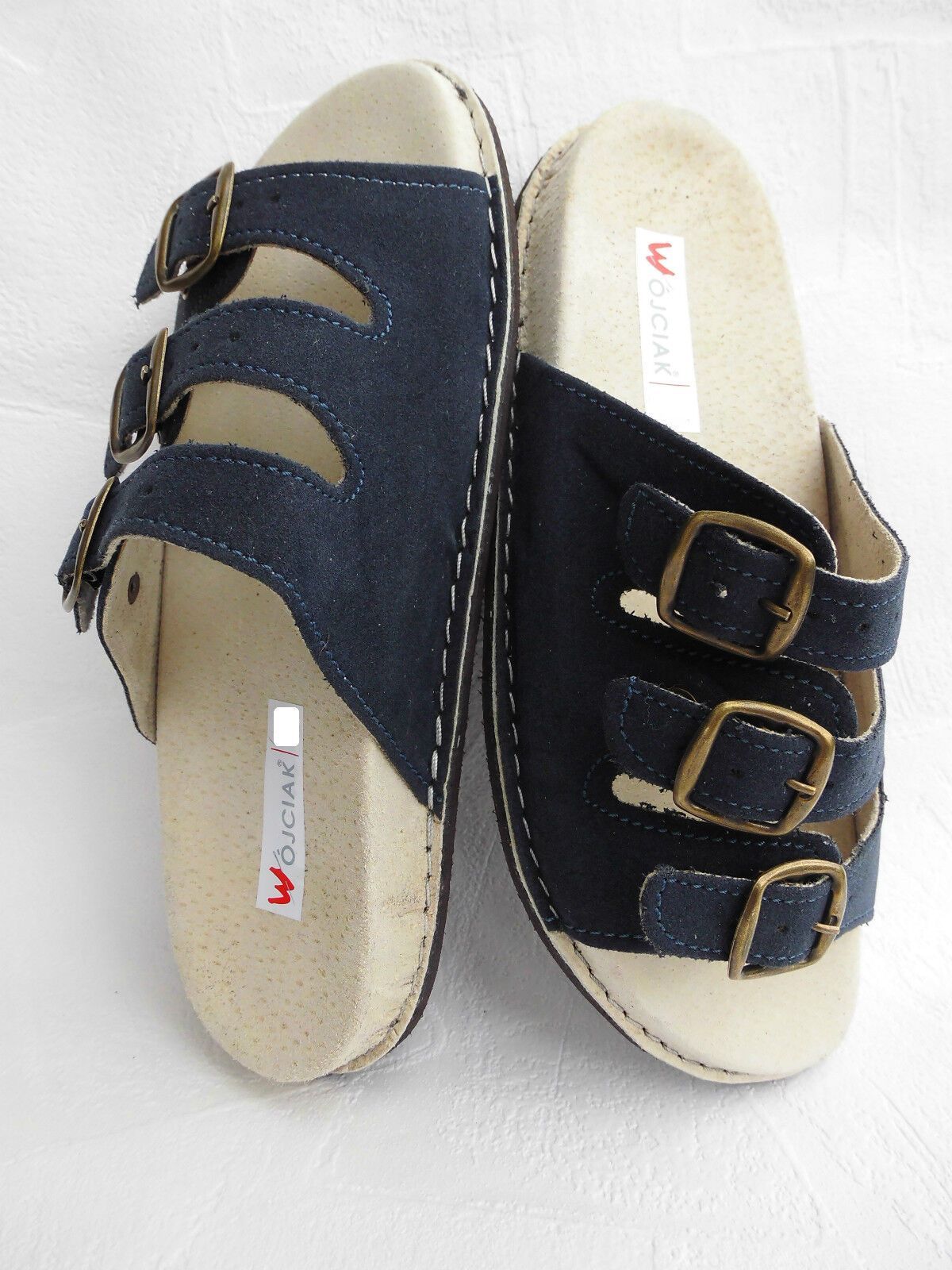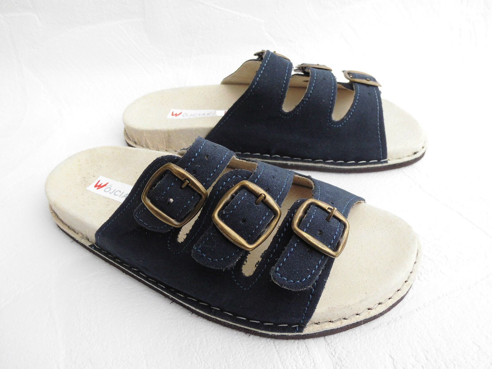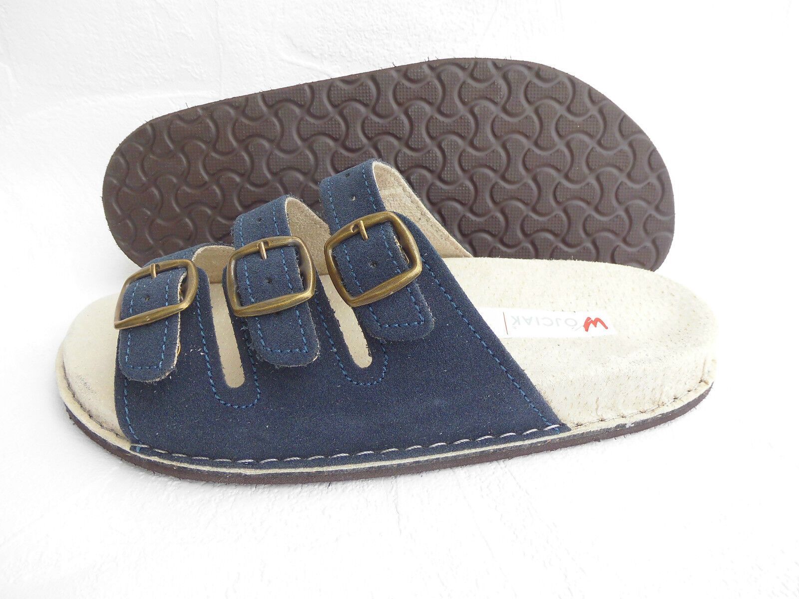 Sehr schöne und bequeme Sandalen - Pantolette - Hausschuhe - Badeschuhe Gr.38 **** Dunkel BLAU**** Die Hausschuhe bestehen außen und innen aus Wildleder Die Sohle besteht aus Gummi (rutschfest) Decksole Leder mit dem Fussbett 3 verstellbare Schnallen Sehr leicht und bequem Neu, keine billig Ware, st
