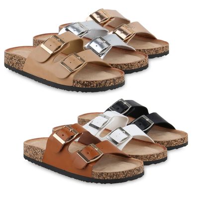 • VAN HILL Damen Pantoletten Sandalen Schnallen Korkoptik Profil-Sohle Schuhe 841089