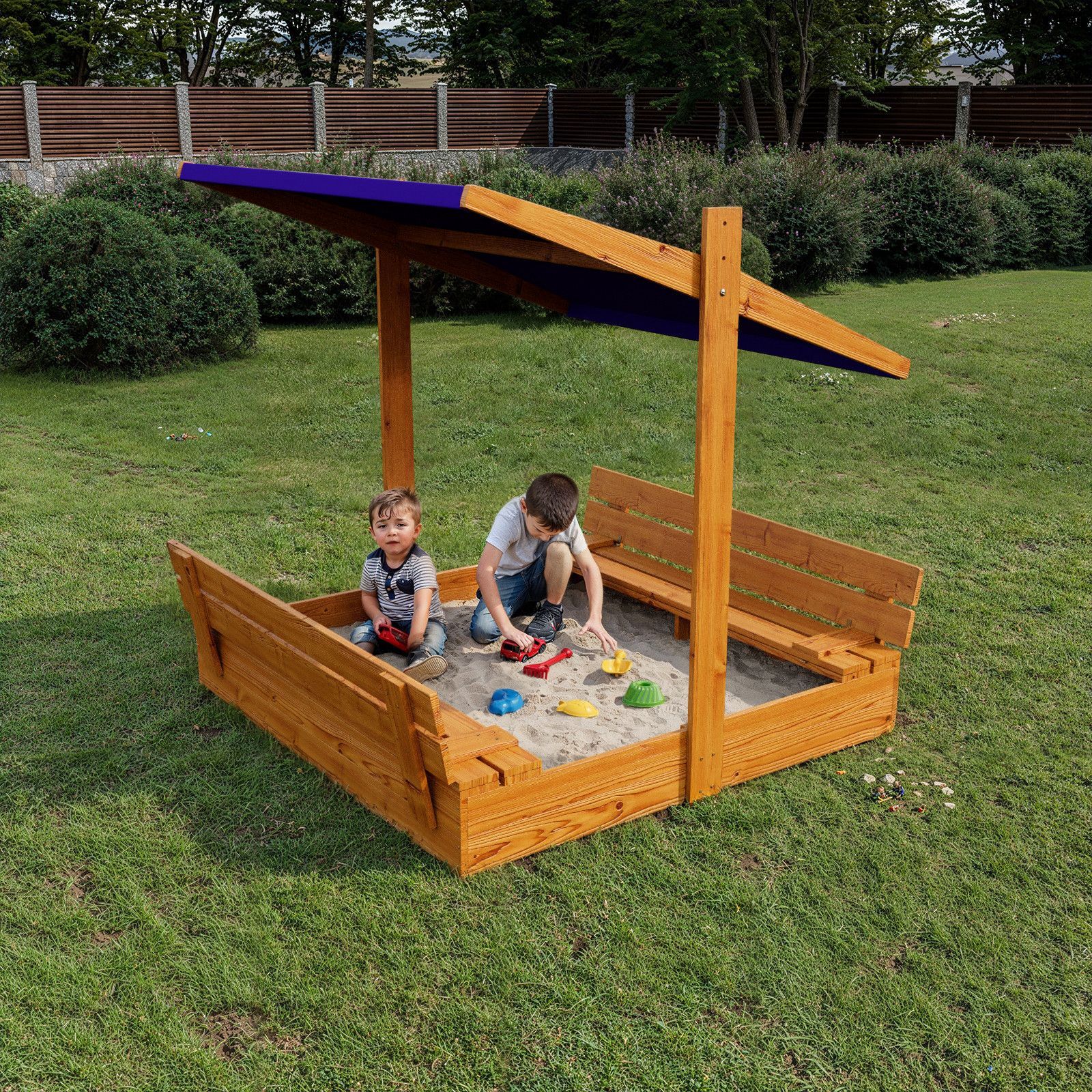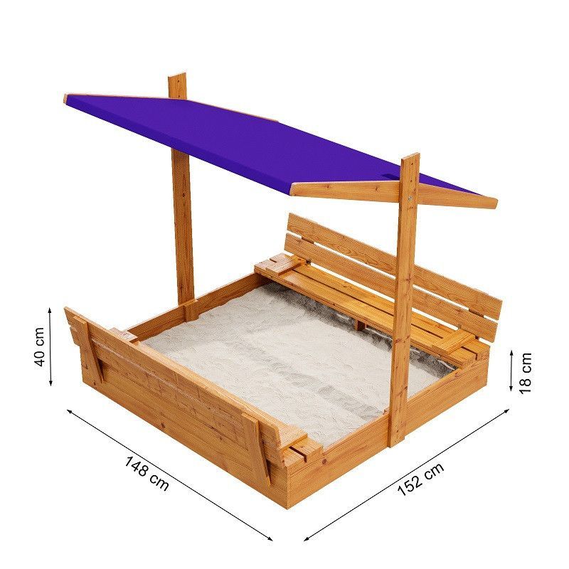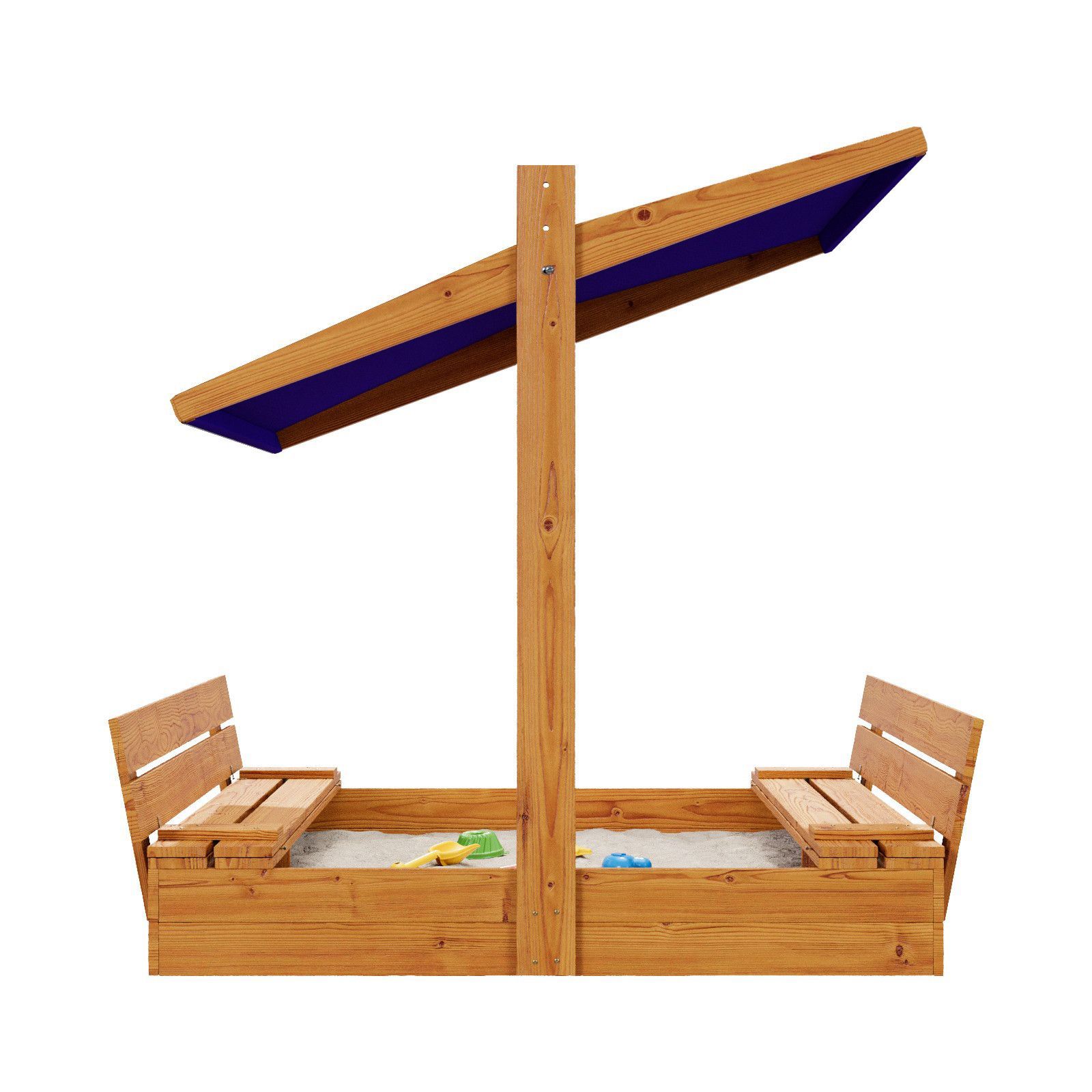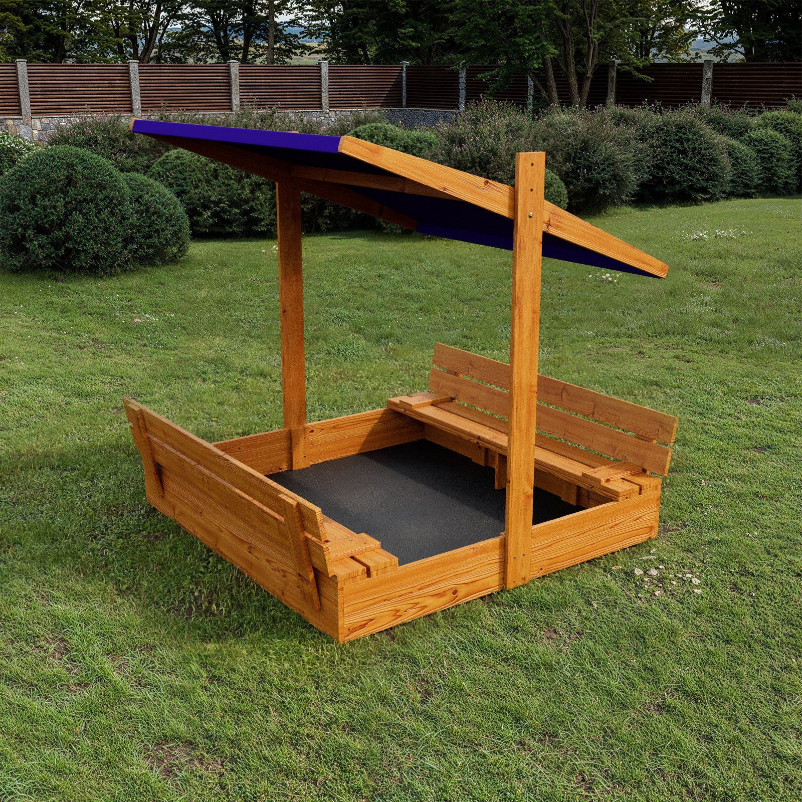 QLS Sandkasten aus Holz mit Sitzbank Dach Abdeckung Imprägniert Sandbox Dunkelblau 10782