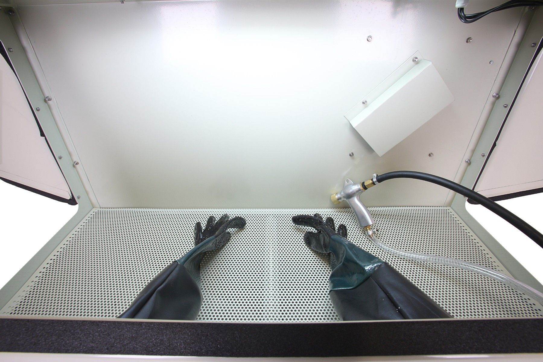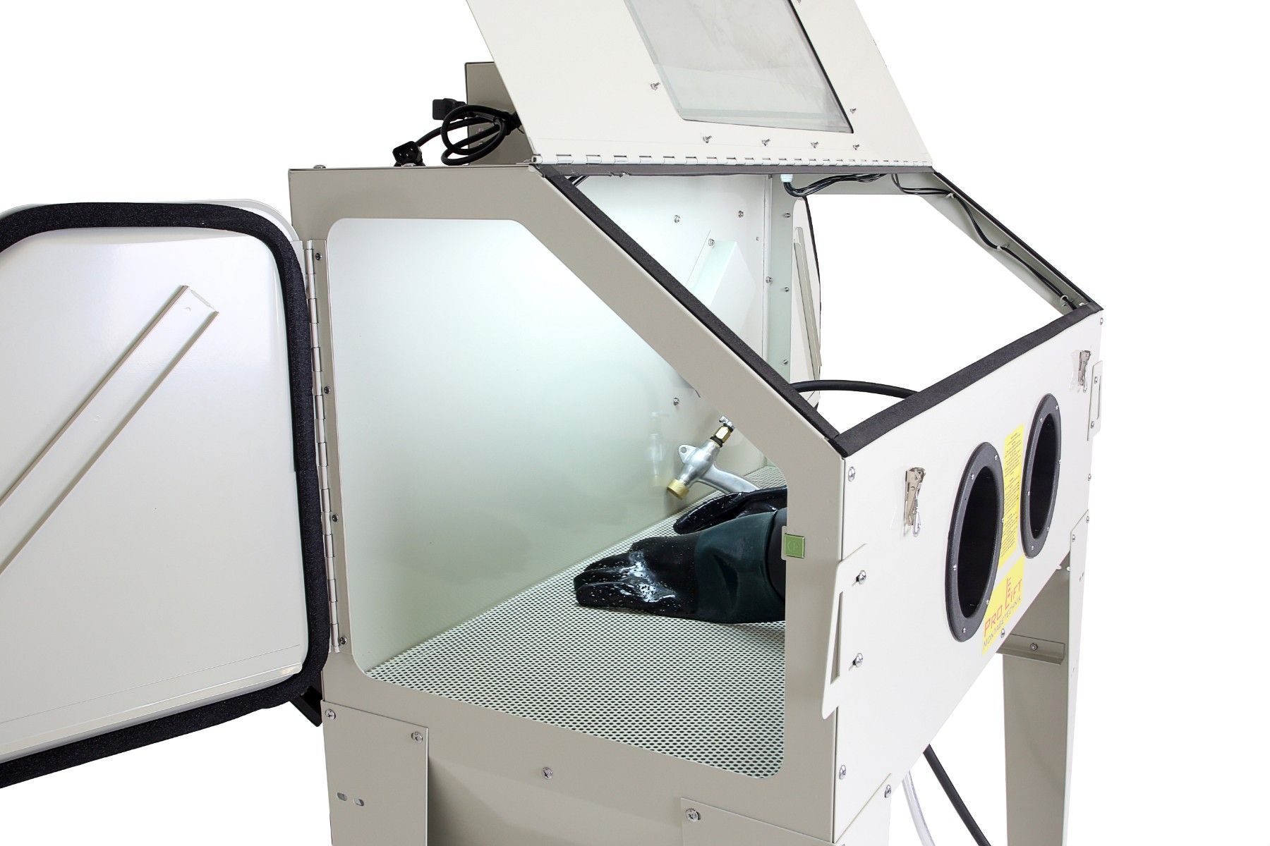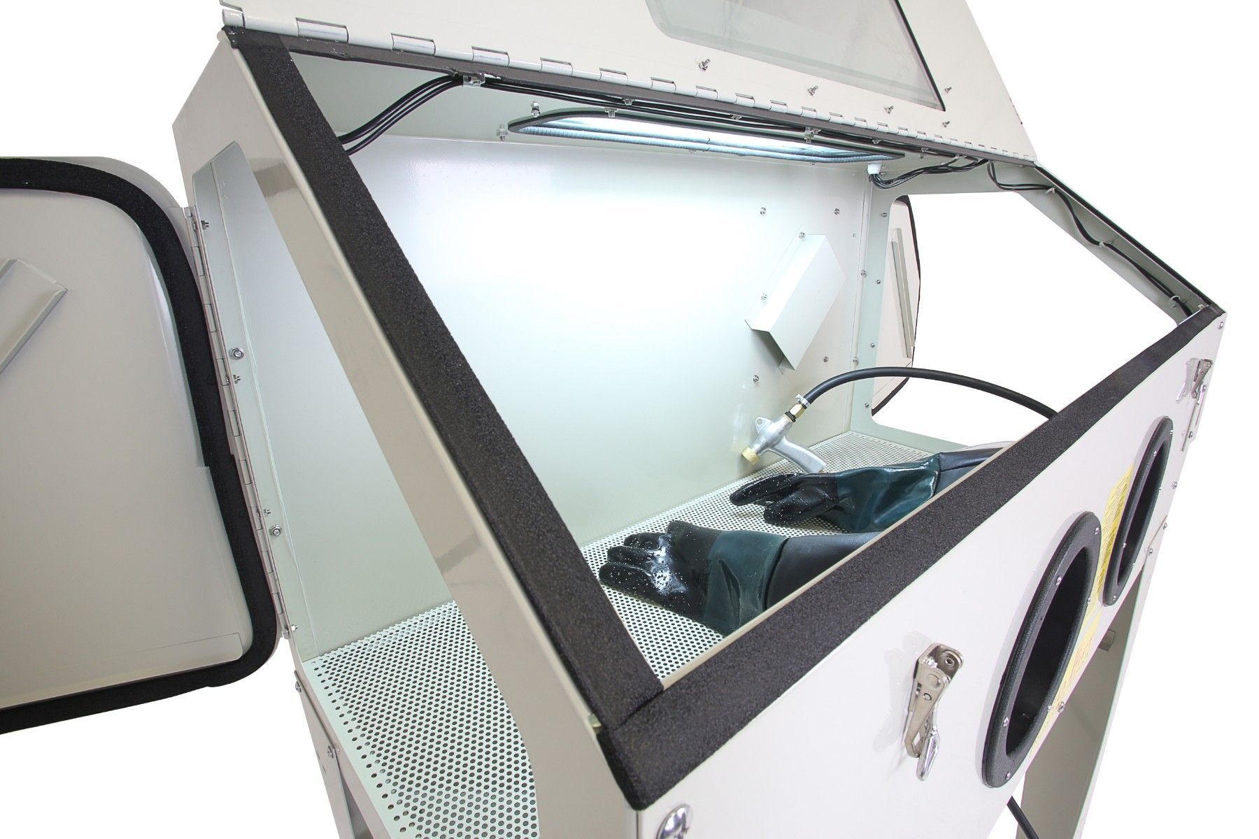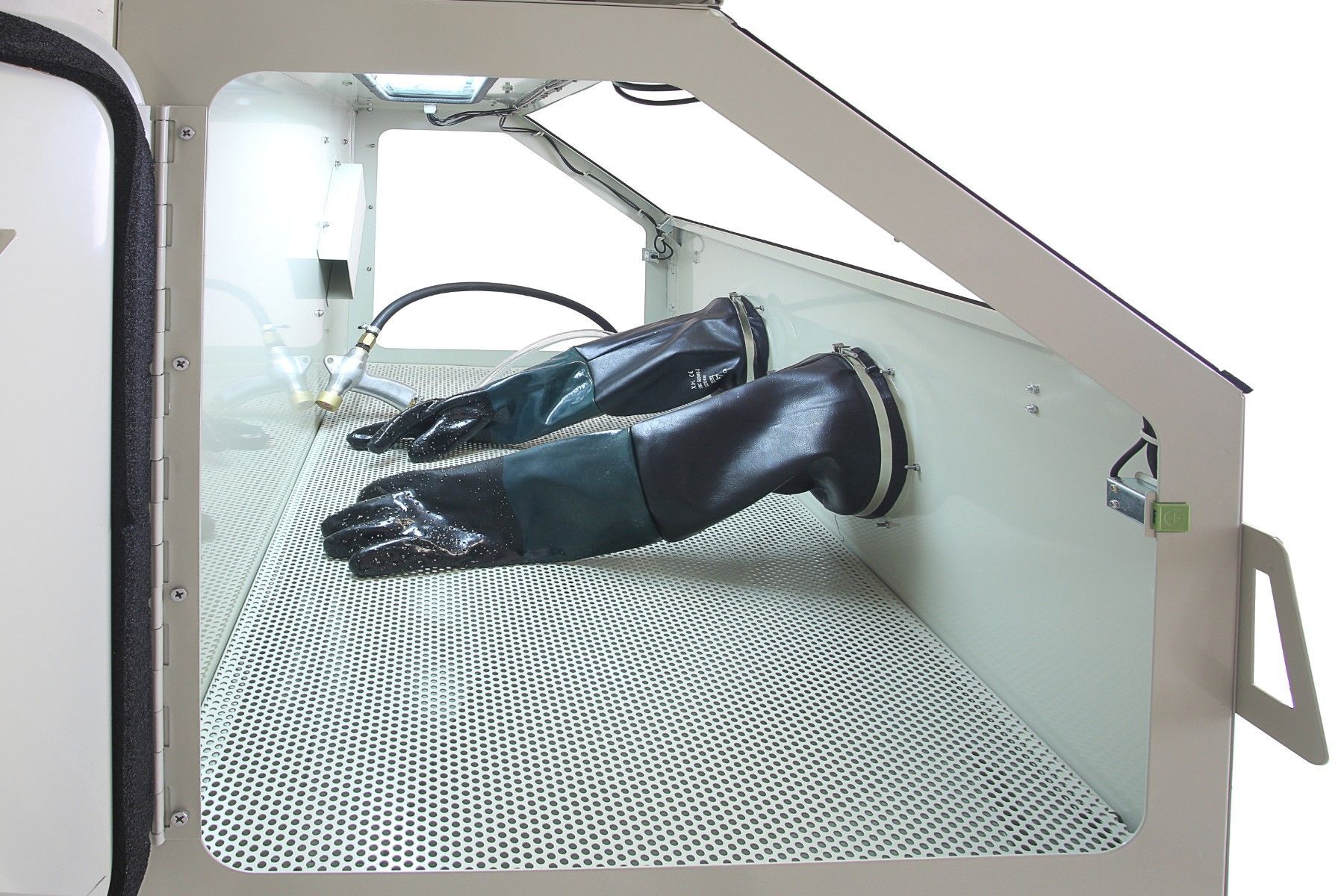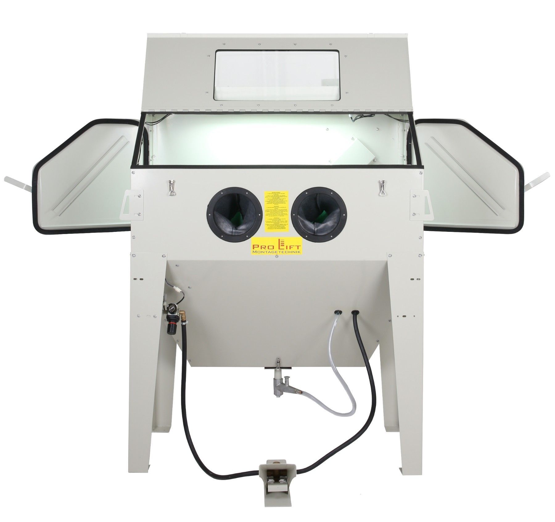 420 Liter Sandstrahlkabine, SB42AJ mit eingebauter Absaugung, 2 Seitentüren + große Frontklappe - 01559 Ideal zum Sandstrahlen von großen Teilen. Umfangreiche Ausstattung: Fußbedienung über Pedal Pulverbeschichteter Stahl 2 seitliche Türen zum einfachen Beladen 1 große Frontklappe zum vorderen Einla