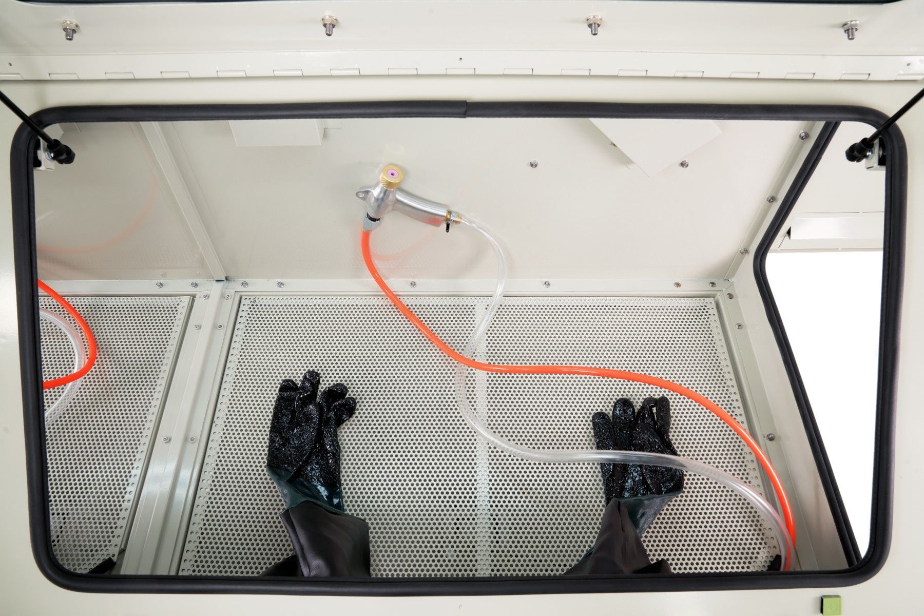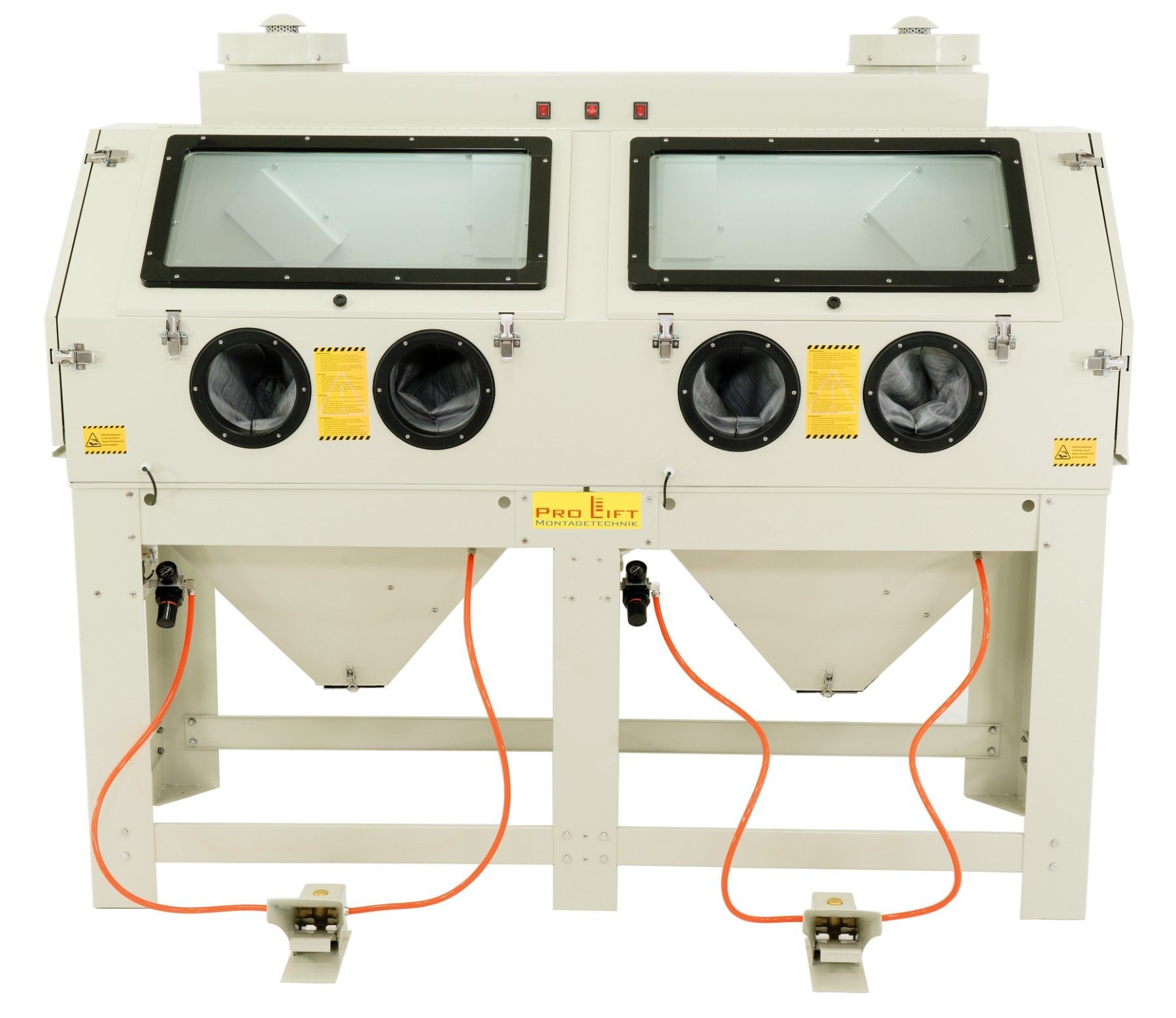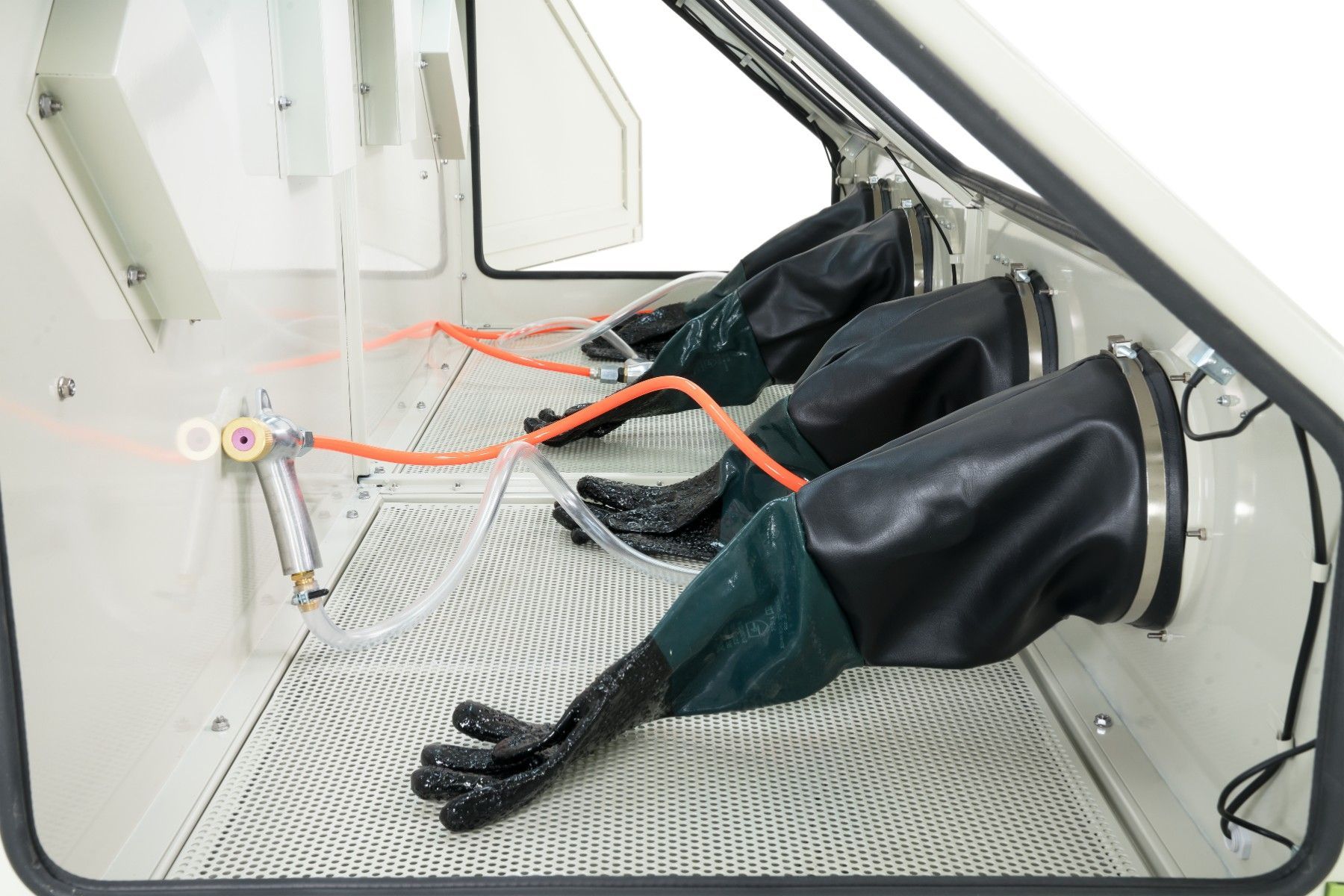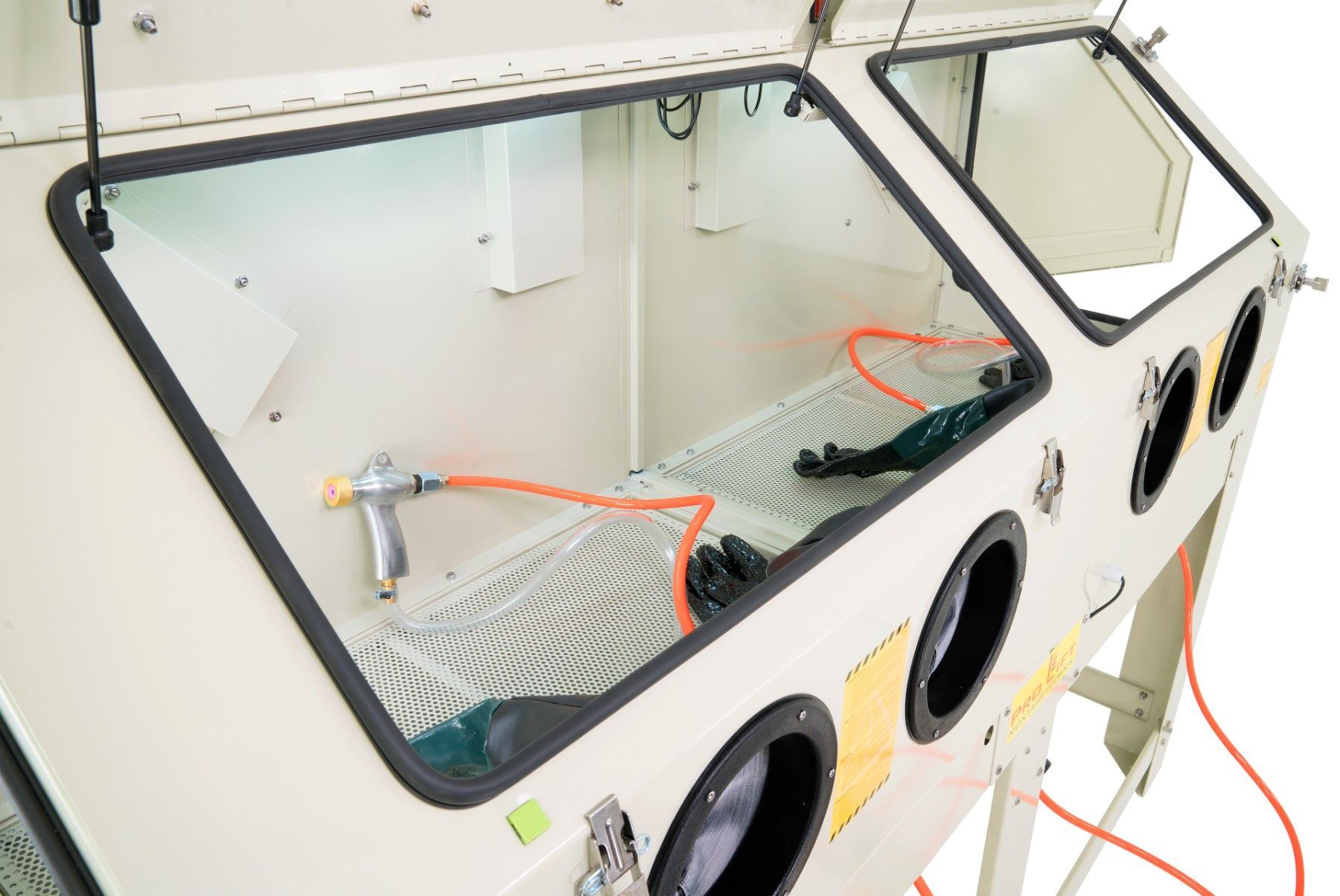 880 Liter Sandstrahlkabine SB88AJ mit 2 eingebauten Absaugungen, 2 Seitentüren + 2 großen Frontklappen SB88AJ-02822 Diese Doppel-Sandstrahlkabine ist ideal zum Sandstrahlen von langen, großen Werkstücken. Dank Doppeltüren und 2 Strahlpistolen können zwei Personen gleichzeitig arbeiten. An der Rückse