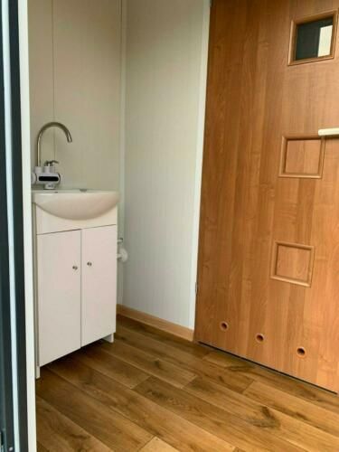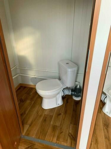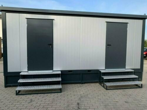 einfach anschließen- sofort einsatzbereit WC Kabine mit Fäkalientank 6x2,40 Meter. Modell KWCTANK6X240 mit 2 Damen- und 2 Herrentoiletten - 2 Fenster - Wärmegedämmtes Sandwichprofil 75 mm für geringen Energieverlust - verzinkte Hörmann Stahlblech Außentür - Komplette Elektroinstallation nach EG Rich