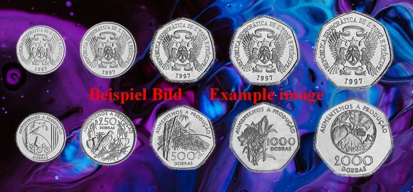 UNC. 100,250,500,1000,2000 Dobras KM: 87,88,89,90,91 KMS. 1997 Unzirkuliert unz Uncirculated (Unc) Münzen aus meist vollautomatischer Produktion, die noch nie im Umlauf waren. Aufgrund des Produktionsprozesses können die Münzen eine Vielzahl von Fehlern aufweisen, meist kleine Kratzer (aber auch grö