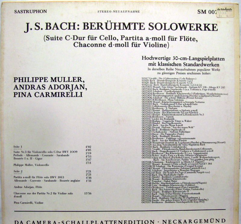 Condition Vinyl Near Mint (NM or M-) Condition Sleeve Near Mint (NM or M-) Tracks included: Suite Nr. 3 Für Violoncello Solo C-Dur BWV 1009 I 1. > Prélude 2. > Allemande 3. > Courante 4. > Sarabande 5. > Bourrée I und II 6. > Gigue Partita A-moll Für Flöte Solo BWV 10