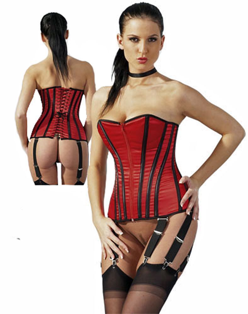Satin-Korsett in hochwertiger Qualität für eine formvollendete Silhouette. Das Korsett ist auf insgesamt 14 Stäbe gearbeitet. In Front mit Reißverschluss, im Rücken wird das Korsett komplett geschnürt. Die Schnürung ist unterlegt. 6 breite Strumpfhalter runden das erotische Outfit ab. Farbe: Rot/Schwarz. Material: 40% Viscose, 60% Baumwolle. Innenfutter: 100% Baumwolle. Größe: 56cm, 66cm, 76cm.