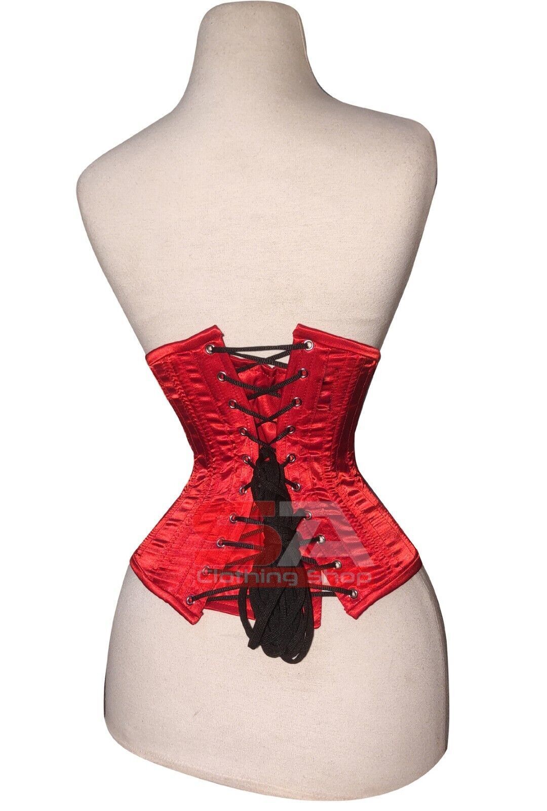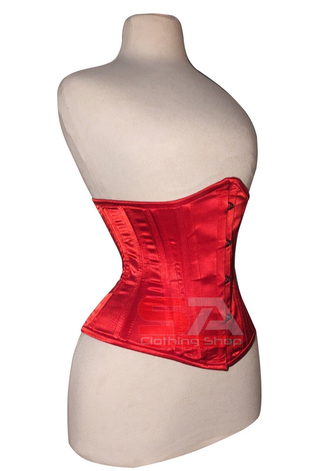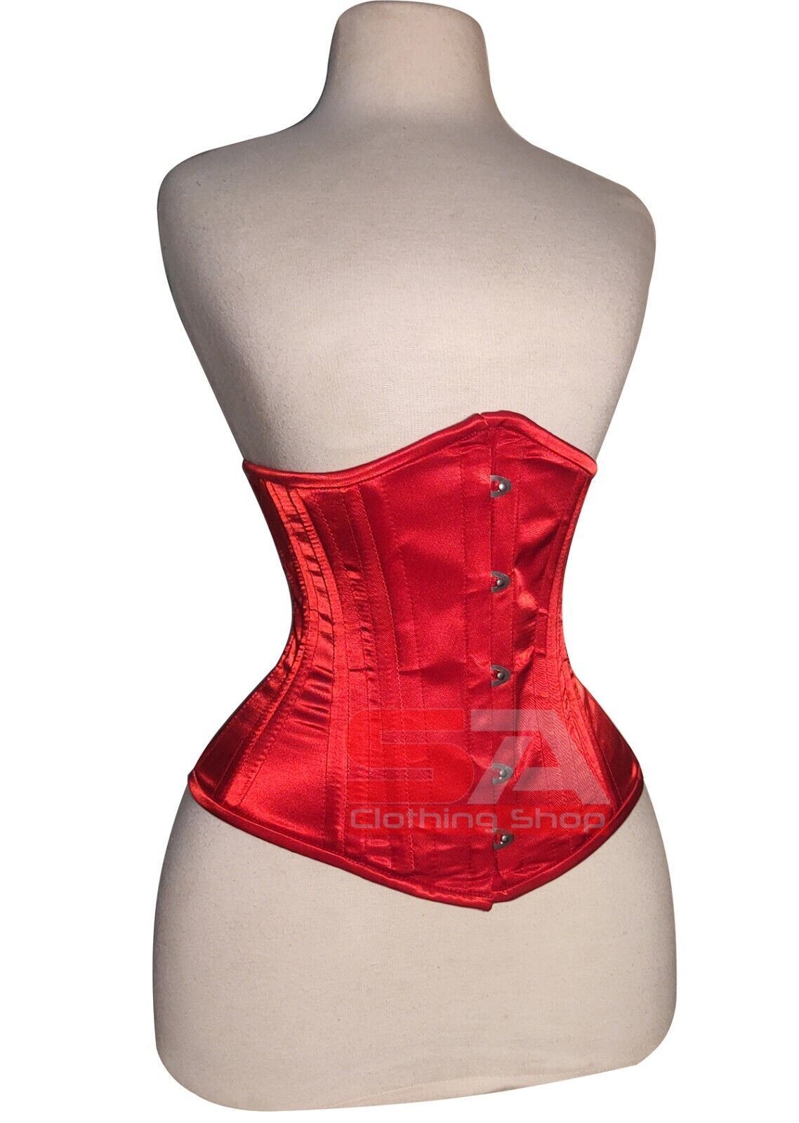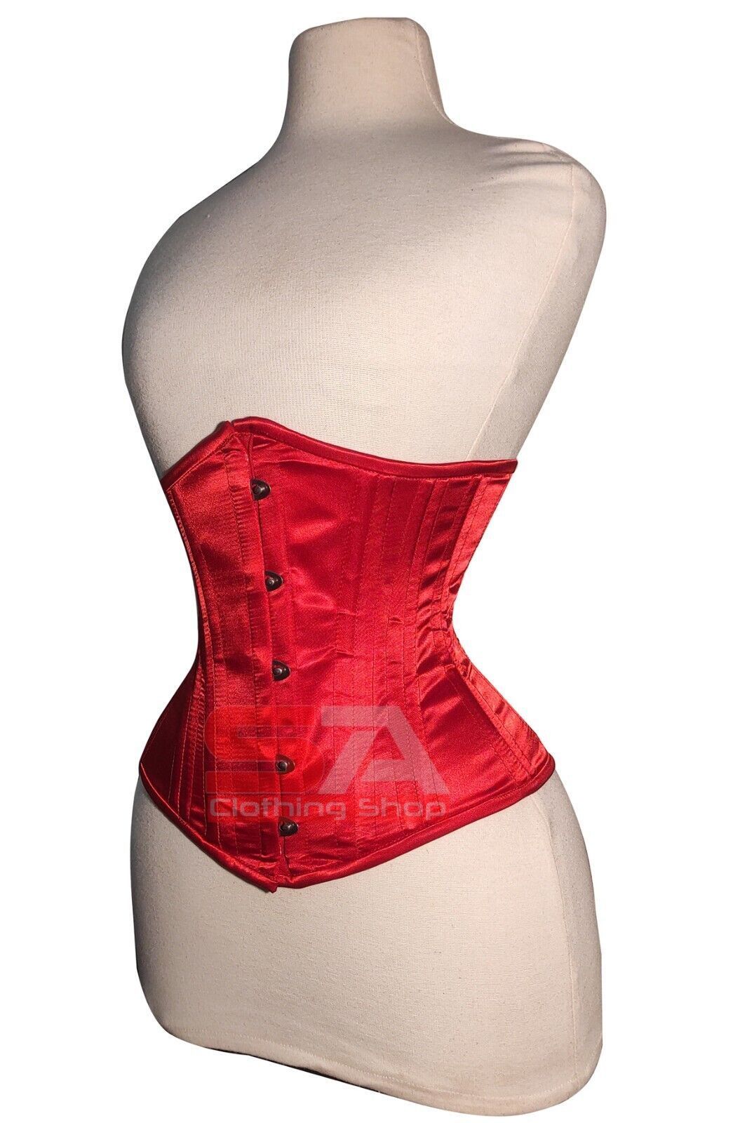 Description Corset Detail Outer Shell: 100% Polyester Satin Inner Shell: 100% Cotton Twill Underwired: 100% steel bones Closure: Rust free metal claps Corset Front Length: 12.5 Corset Side Length: 11 Corset Back Length: 12 5 Modesty Panel at the back Corset features Heavy Duty, Very Strong Fully Ste