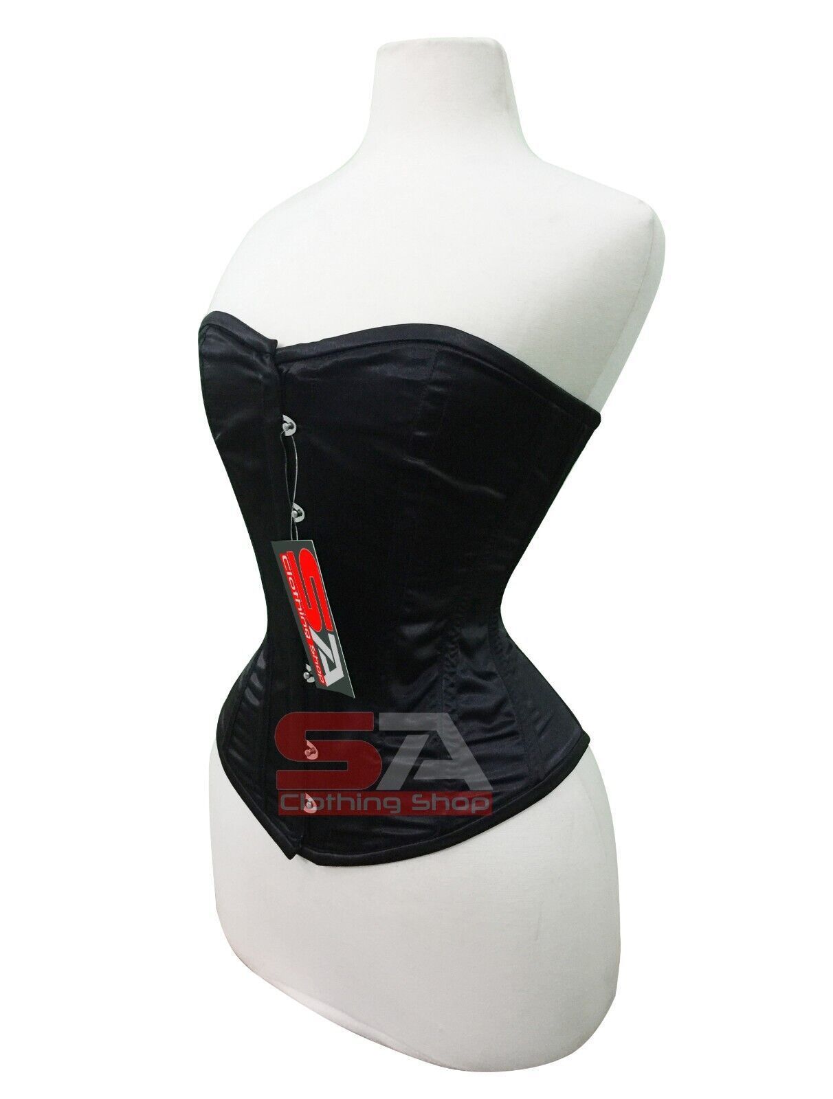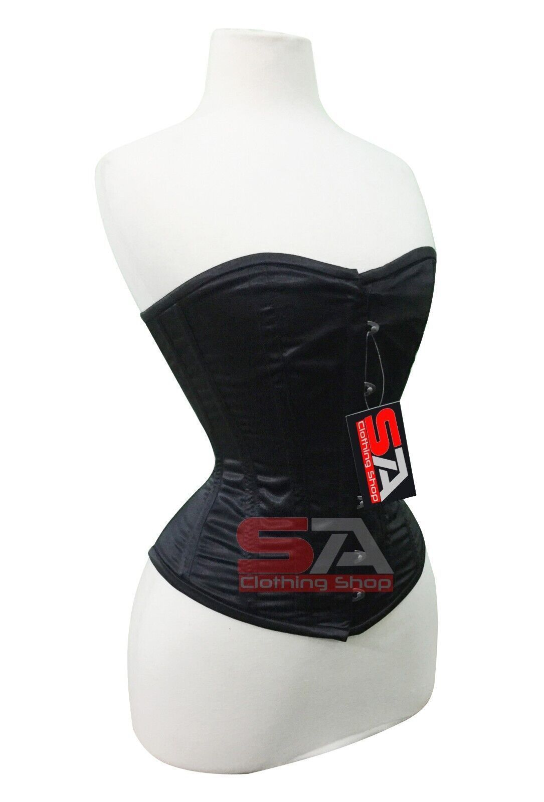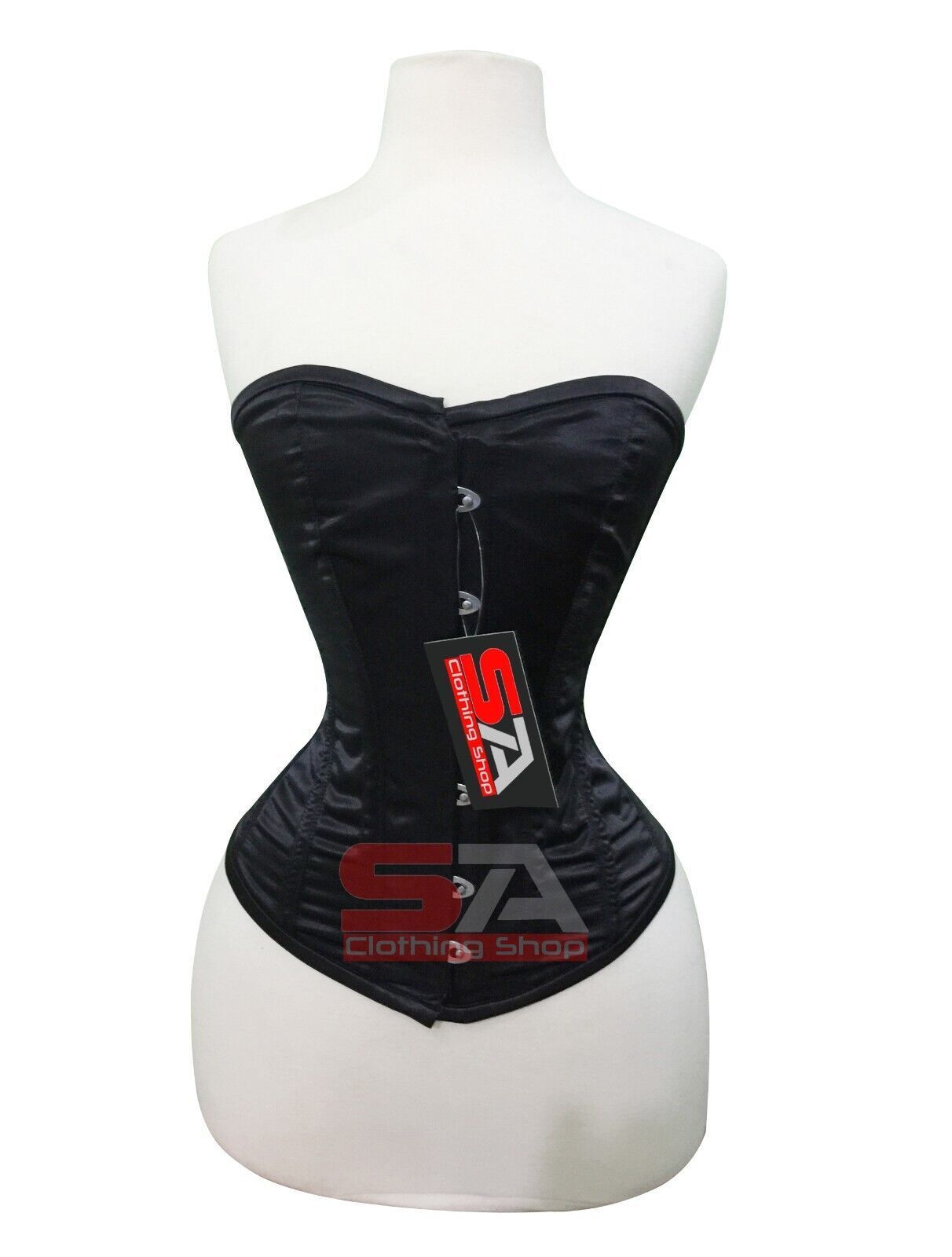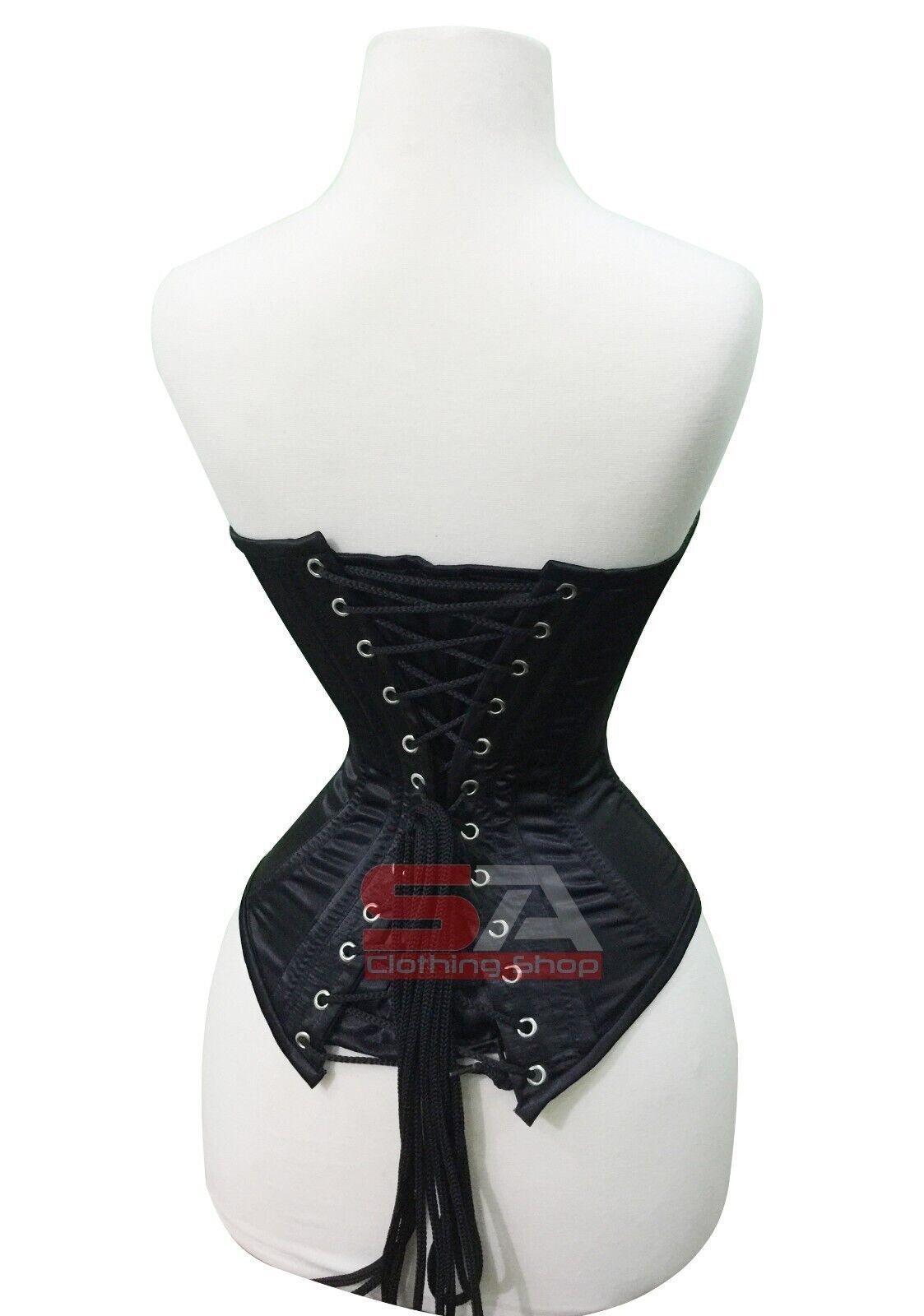 Description Corset Detail Outer Shell: 100% Polyester Satin Inner Shell: 100% Cotton Twill Underwired: 100% steel bones Closure: Rust free metal claps Corset Front Length: 14 Corset Side Length: 12.5 Corset Back Length: 13.5 5 Modesty Panel at the back Corset features Heavy Duty, Very Strong Fully S