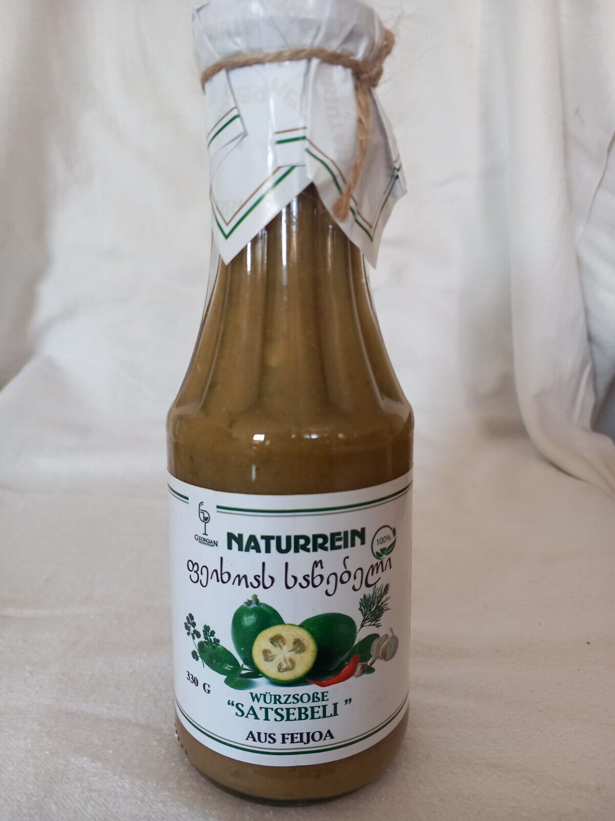 Sauce - Satsebeli aus Fejoa - 330 ml. - Georgien - ACHTUNG MHD: 25.01.25 Ein unentbehrlicher Bestandteil in der georgischen Küche ist die Feijoasauce (Brasilianische Guave). Zubereitet wird sie nur mit frischen Gewürzen und Kräutern. Naturrein Inhalt Füllmenge: Euro 330 ml Geschmack: Euro Feijoa (Br