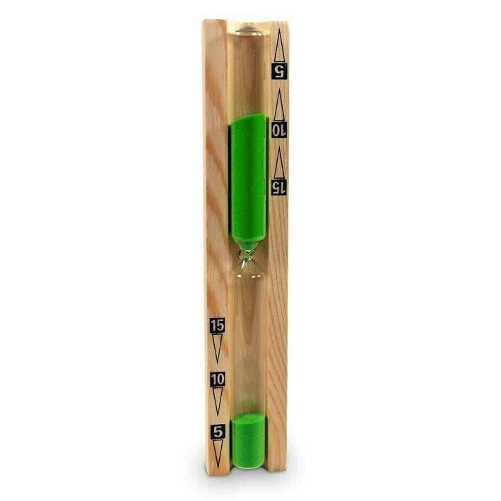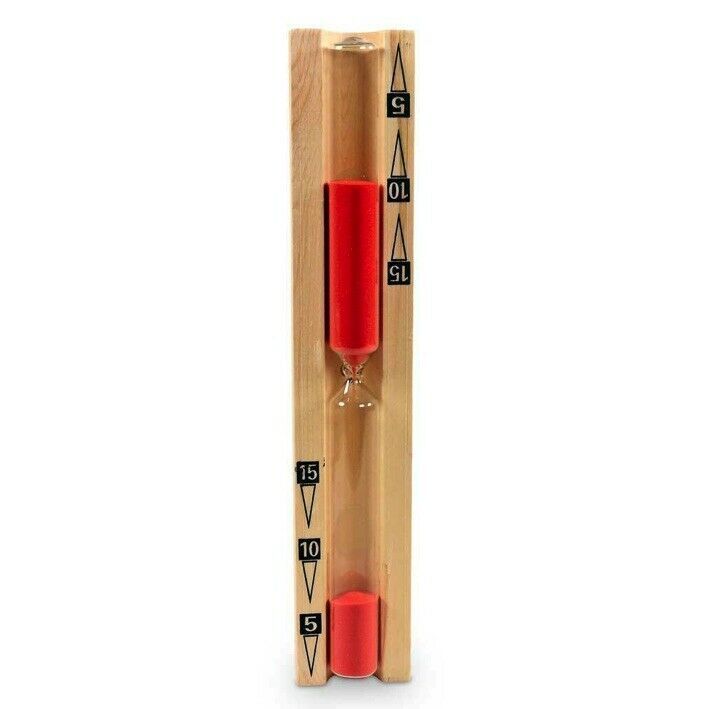 15 Minuten Skalierung | 5 Minuten Unterteilung Beschreibung: Gehäuse: Holz / Natur, stabile Ausführung Glaszylinder mit farbigem Sand Glaszylinder auf Drehgestell Maße: 27,5 x 5,0 x 3,5 cm