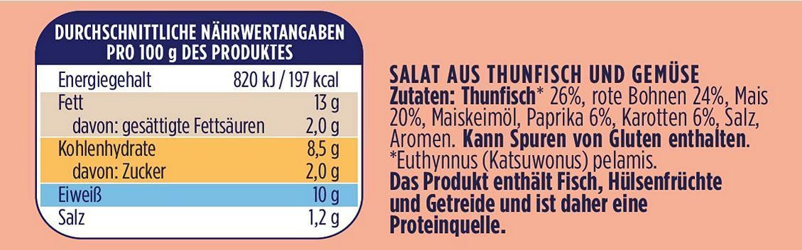 Saupiquet Rio Mare Thunfisch-Salat Messicana , MSC zertifiziert, Fix und fertig zubereitet, Ideal für unterwegs, 160g - 3 Varianten Stückzahlen Produktbeschreibung Schnell, einfach und lecker: Thunfisch-Salat Mexicana kombiniert das Beste vom Thunfisch mit ausgewähltem Gemüse. Perfekt für eine schne