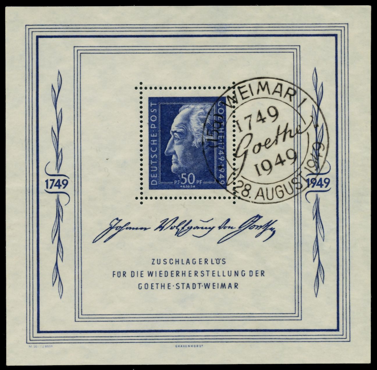 SBZ ALLGEMEINE AUSGABE Block 6 Blockausgabe Goethe-Festwochen - mit Sonderstempel 113.41€ incl. MwSt: Differenzbesteuert zzgl. Versandkosten Bestell-Nr.: 6E68B6 Katalog-Nr: MICHEL (Block 6) Katalogpreis: 300 EUR Qualität: Normal Erhaltung: Sonderstempel Einheit: Einzelmarke Einzelstück Bogenlag