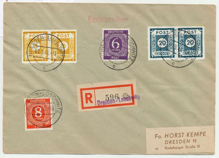 SBZ OSTSACHSEN PMT Nr 48G+47G BRIEF MIF WAAGR P 20 + 15 Pfg Wert aus der Freimarkenausgabe Ziffernserie, deutsche Inschrift, Durchstich Loschwitz in waagerechten Paaren + Ziffernausgabe auf Einschreiben, rückseitig AKS Dresden N6 32.41€ incl. MwSt: Differenzbesteuert zzgl. Versandkosten Bestell