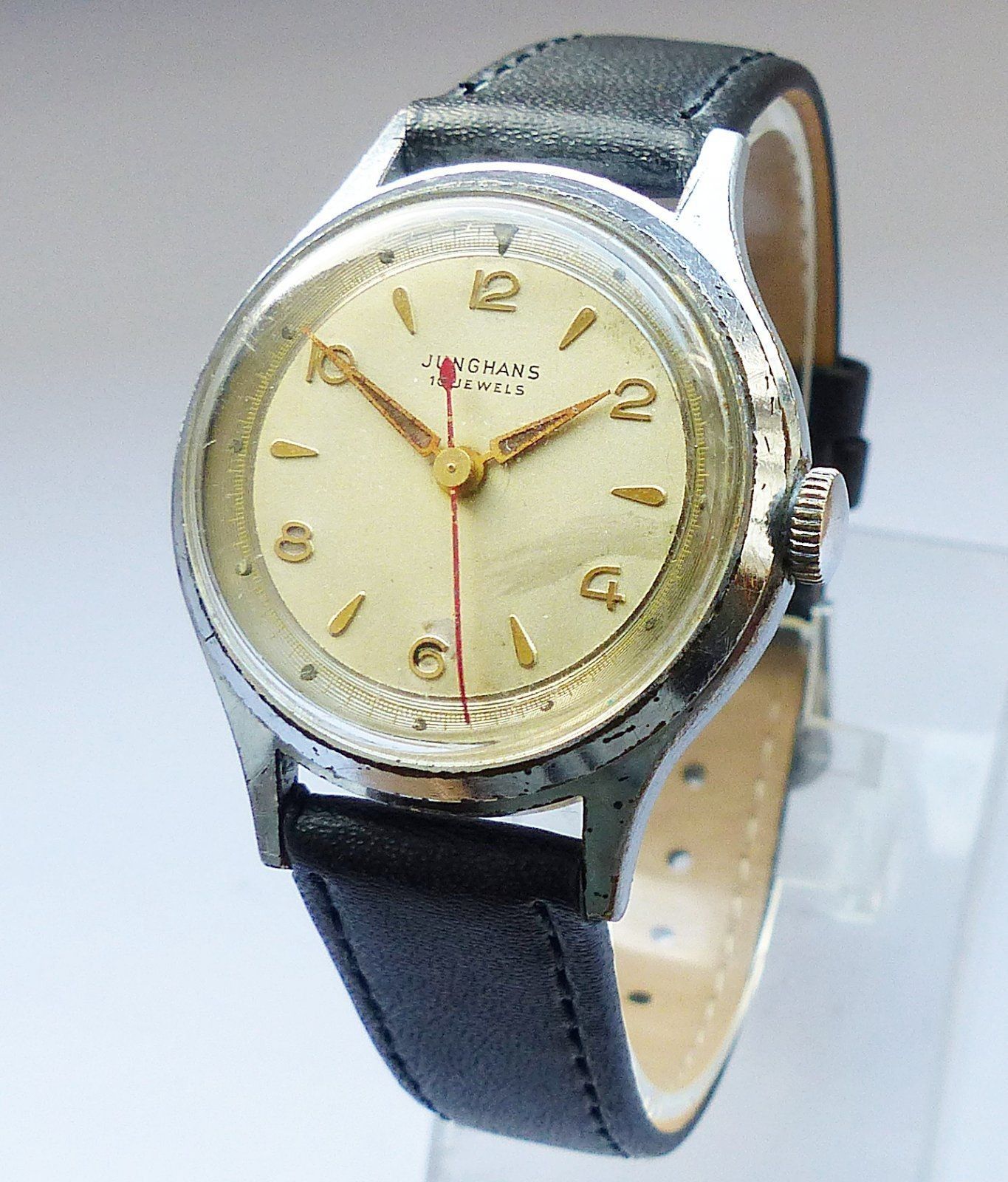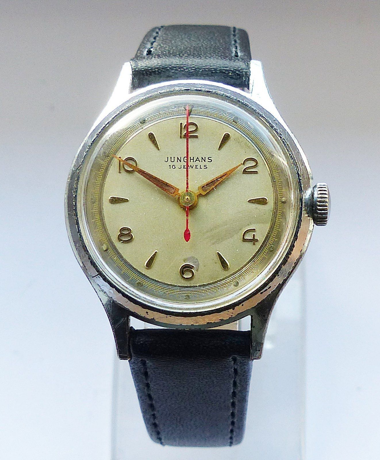 Schöne und seltene Antike Junghans Classic mit Formwerk, Goldfarbenem Zifferblatt mit aufgesetzten Zahlen und Pfeilindizes, grosser zentraler Sekunde. Hersteller : Junghans Deutschland Uhrwerk : Kaliber Junghans 98 Formwerk mit 16Rubinen und Handaufzug. Material Gehäuse : Edelstahl und Metall teilwe