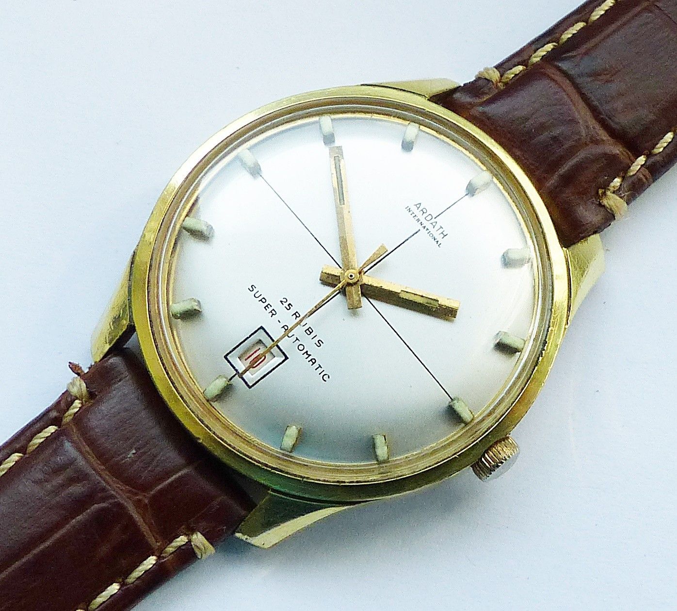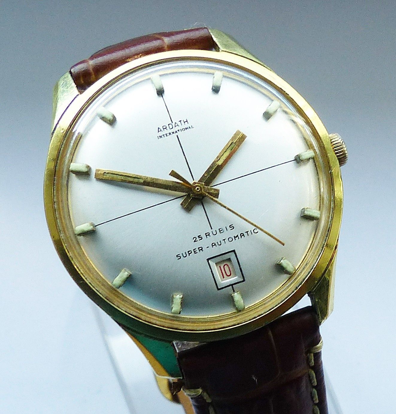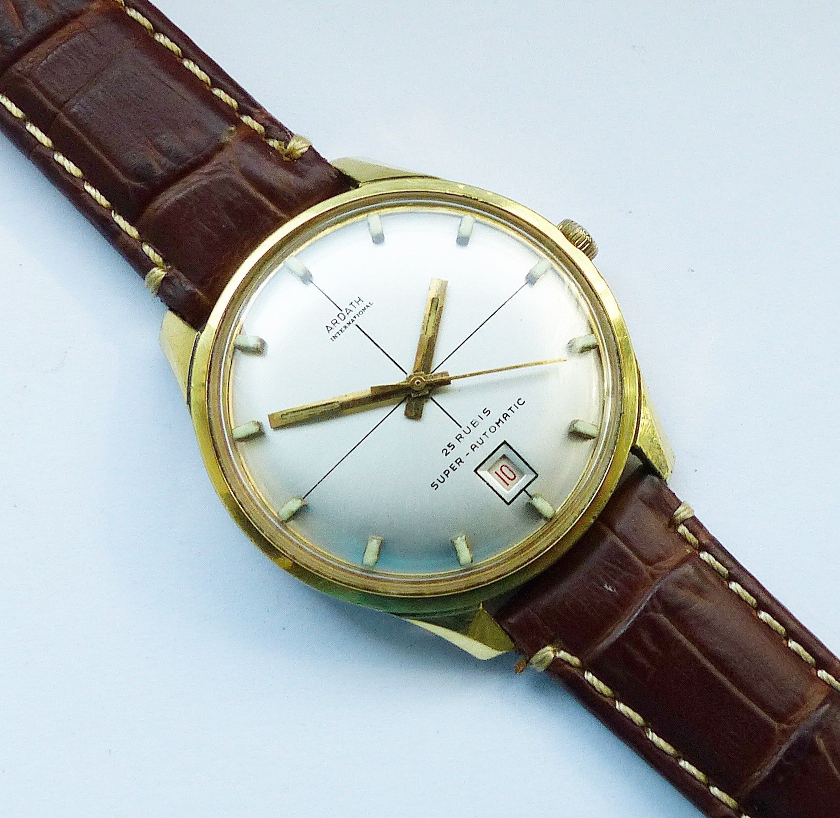 Schöne und sehr seltene Ardath International Automatic mit Datum Herren Luxus Vintage Armbanduhr, mit Goldenem Zifferblatt und aufgesetzten Goldenen Strichindexen, grosser zentraler Sekunde, Datum bei 6.00 Uhr, fluoreszierenden Zeigern und Indizes. Die Uhr ist voll funktionsfähig und in Top gepflegt