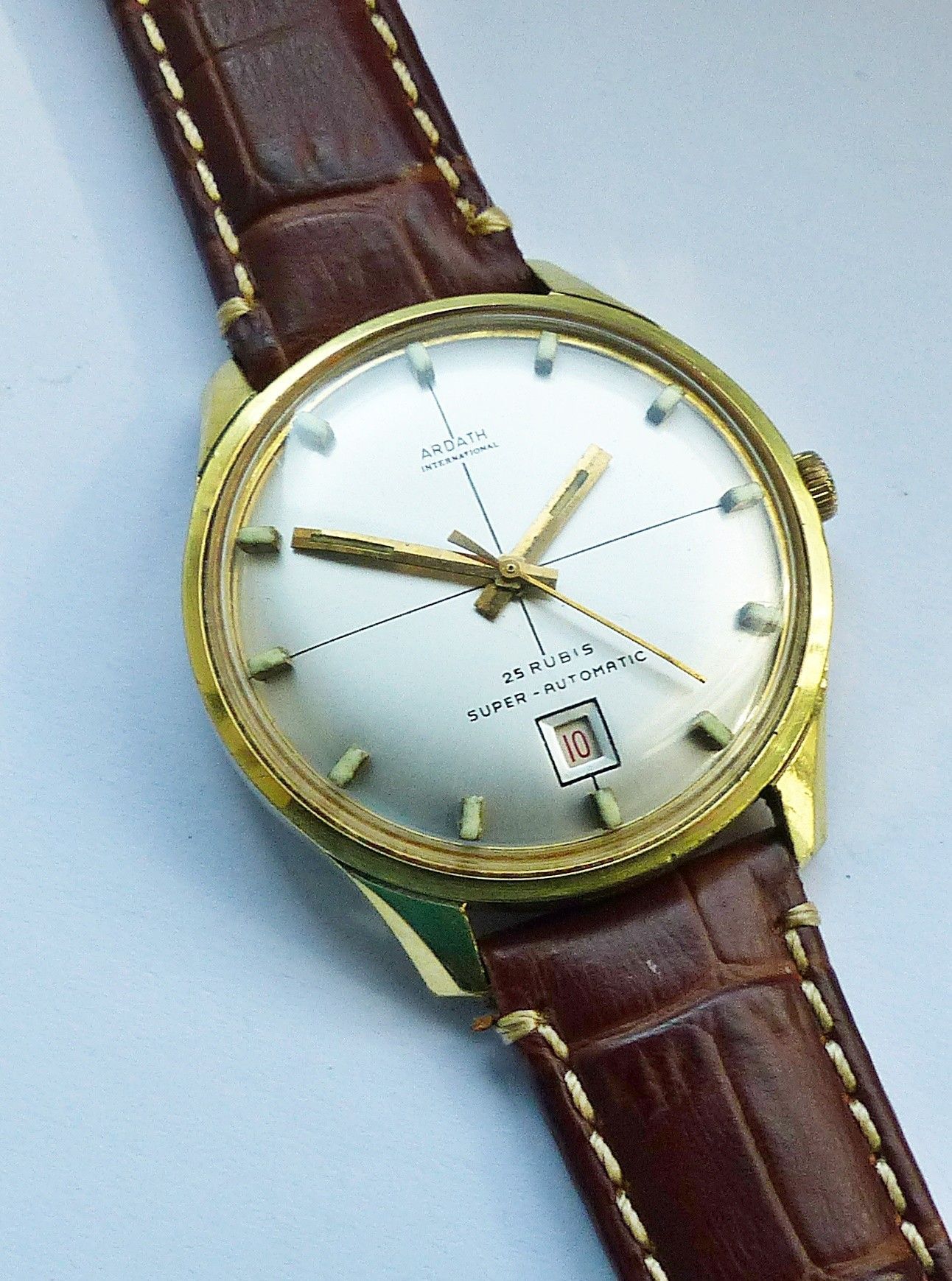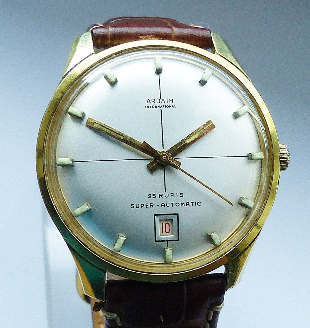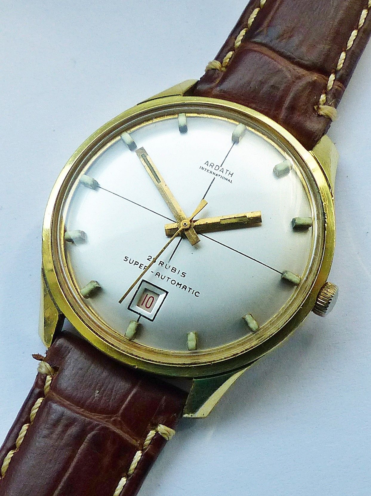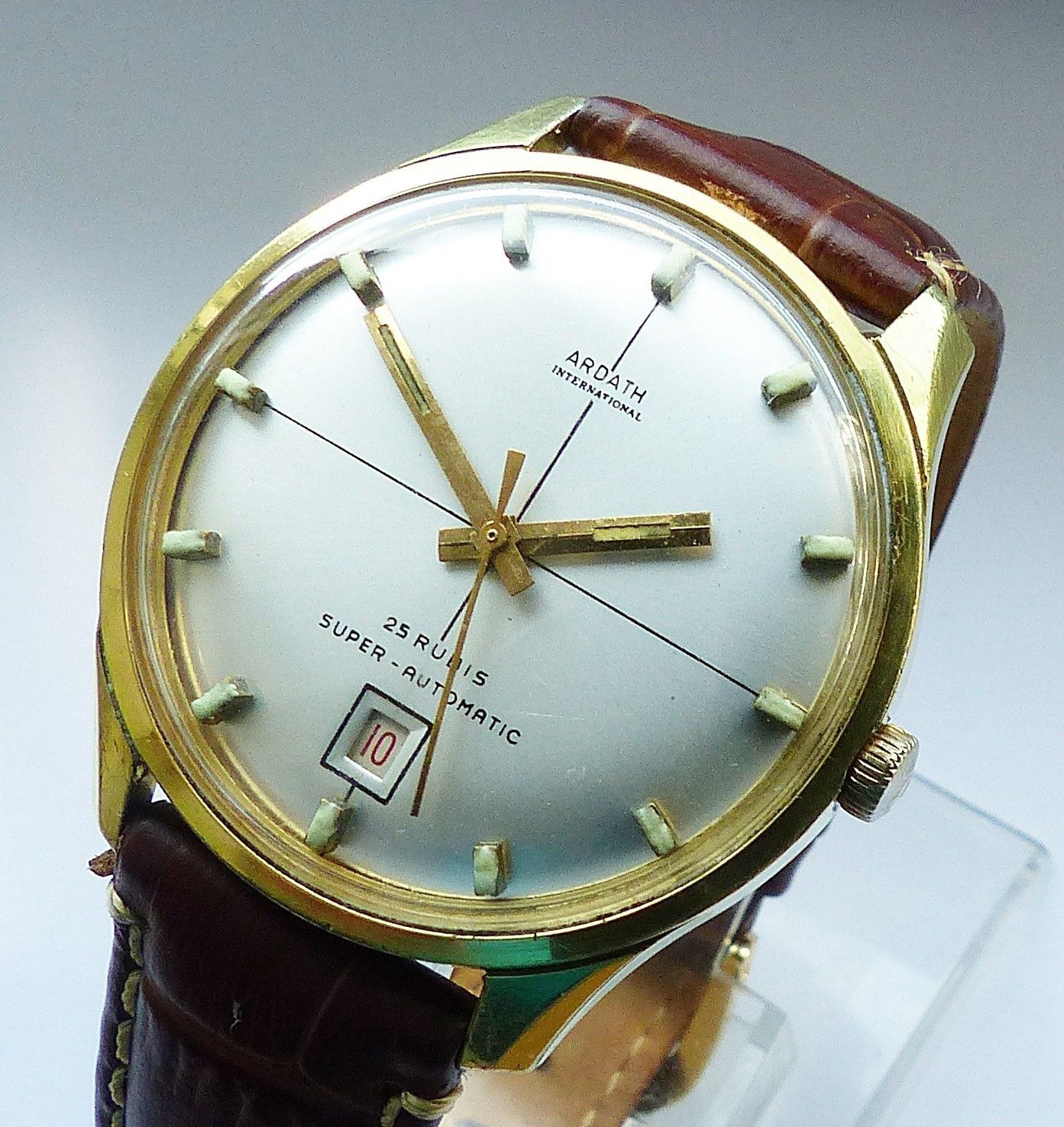 Schöne und sehr seltene Ardath International Automatic mit Datum Herren Luxus Vintage Armbanduhr, mit Goldenem Zifferblatt und aufgesetzten Goldenen Strichindexen, grosser zentraler Sekunde, Datum bei 6.00 Uhr, fluoreszierenden Zeigern und Indizes. Die Uhr ist voll funktionsfähig und in Top gepflegt