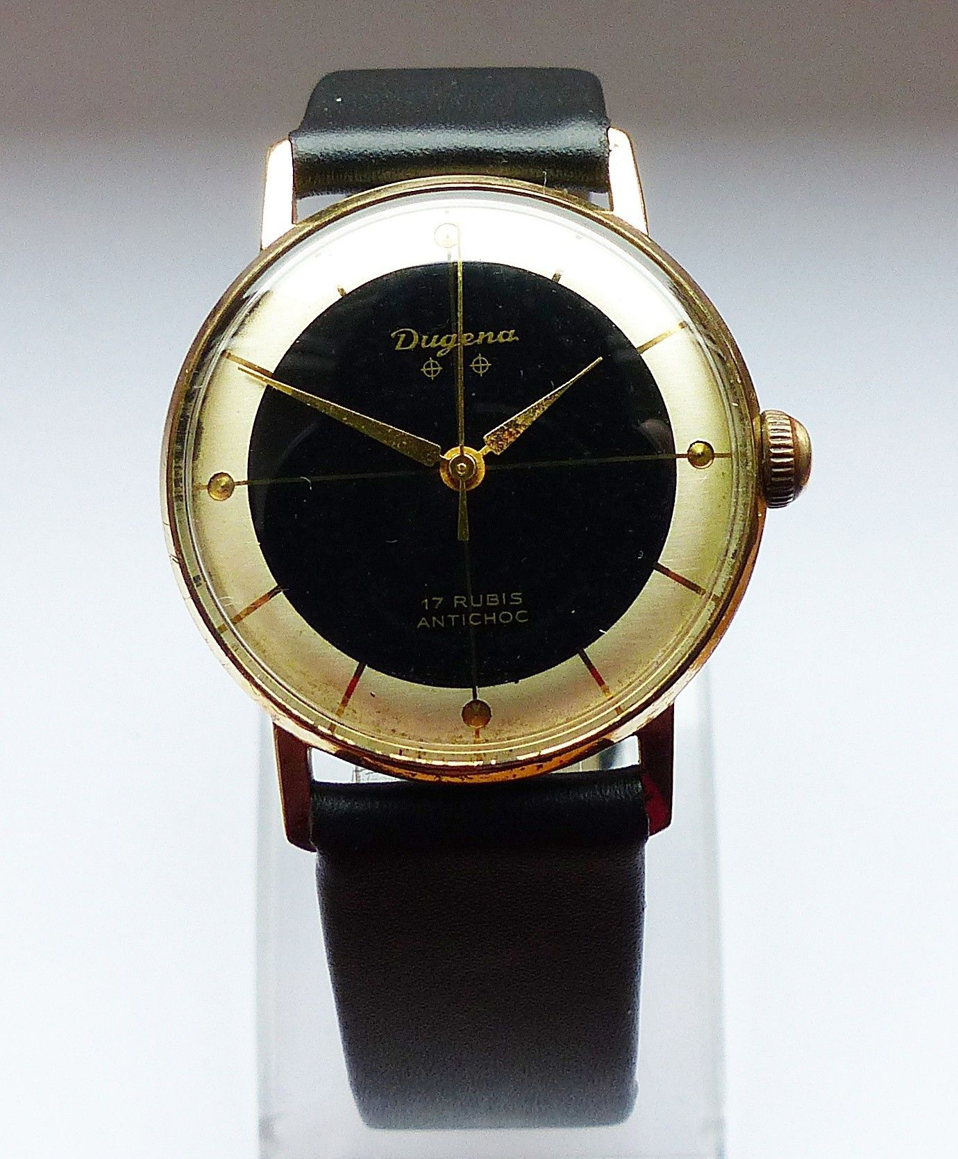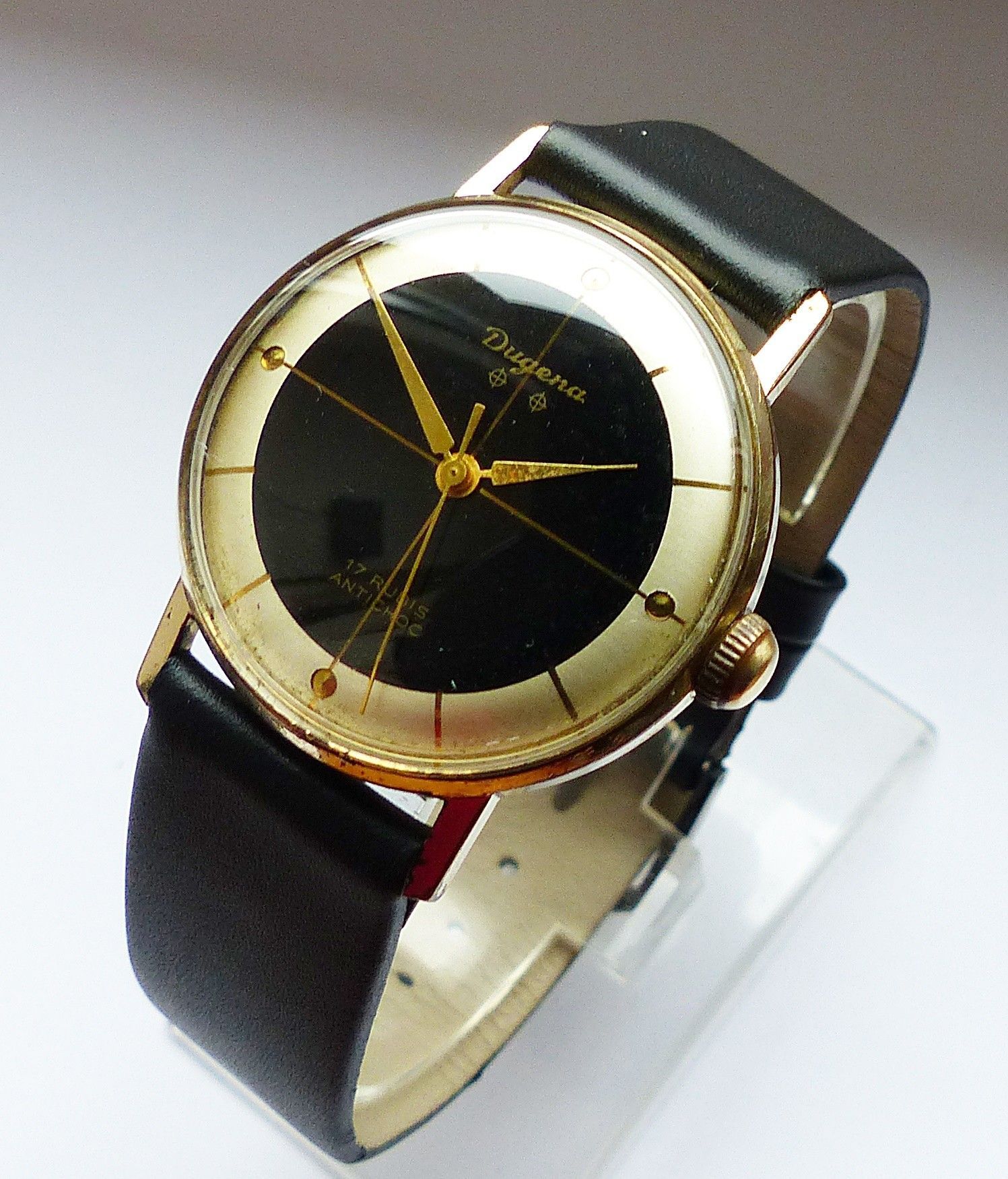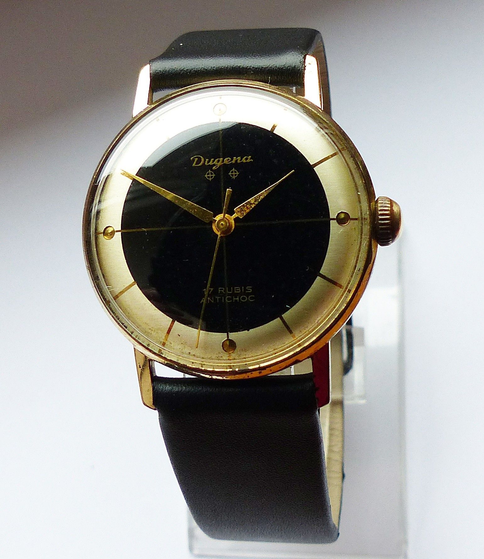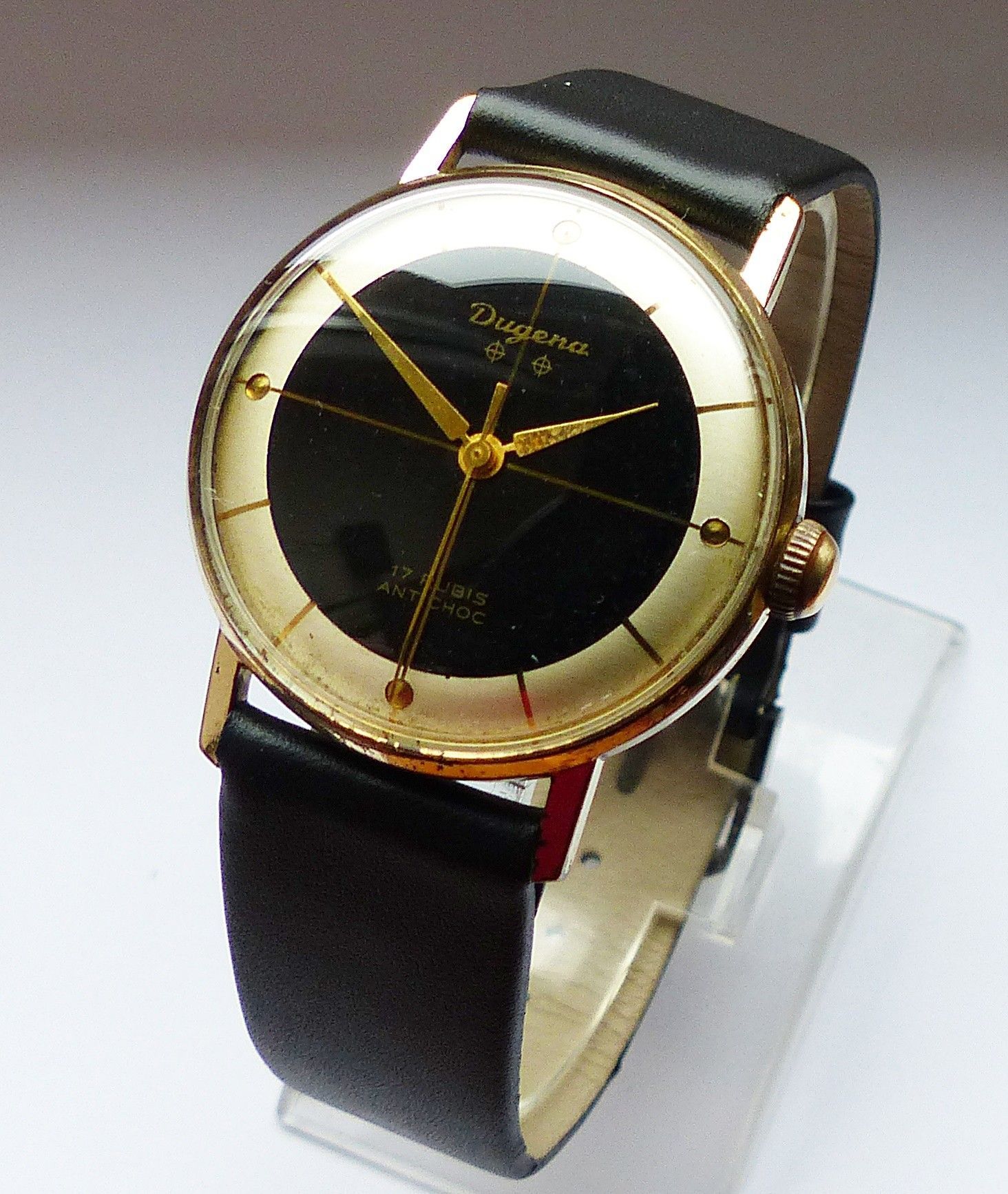 Schöne Dugena Classic 2Tone Herren Vintage Armbanduhr mit 2farbigen Zifferblatt in Gold und Schwarz mit aufgesetzten Goldenen Punkt und Strichindexen, grosser zentraler Sekunde. Die Uhr ist voll funktionsfähig und in sehr guten Zustand s. Fotos Uhrwerk : Kaliber Dugena 7147 Mechanischer Handaufzug m