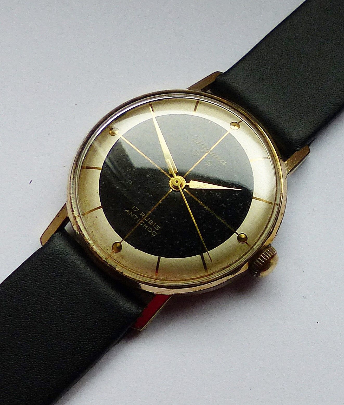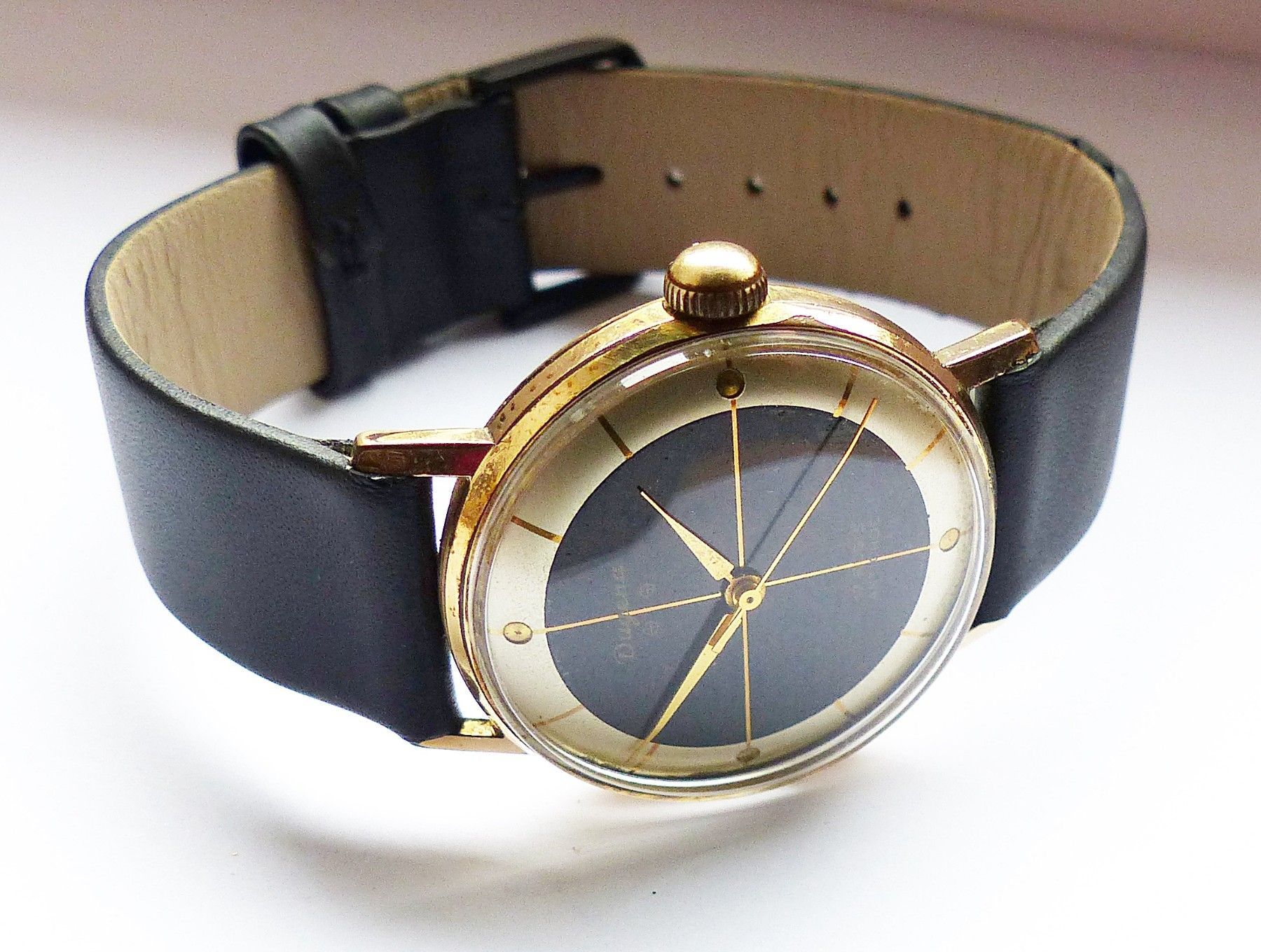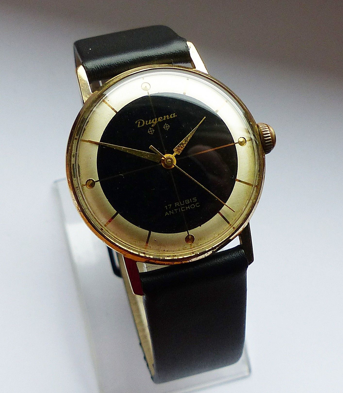 Schöne Dugena Classic 2Tone Herren Vintage Armbanduhr mit 2farbigen Zifferblatt in Gold und Schwarz mit aufgesetzten Goldenen Punkt und Strichindexen, grosser zentraler Sekunde. Die Uhr ist voll funktionsfähig und in sehr guten Zustand s. Fotos Uhrwerk : Kaliber Dugena 7147 Mechanischer Handaufzug m