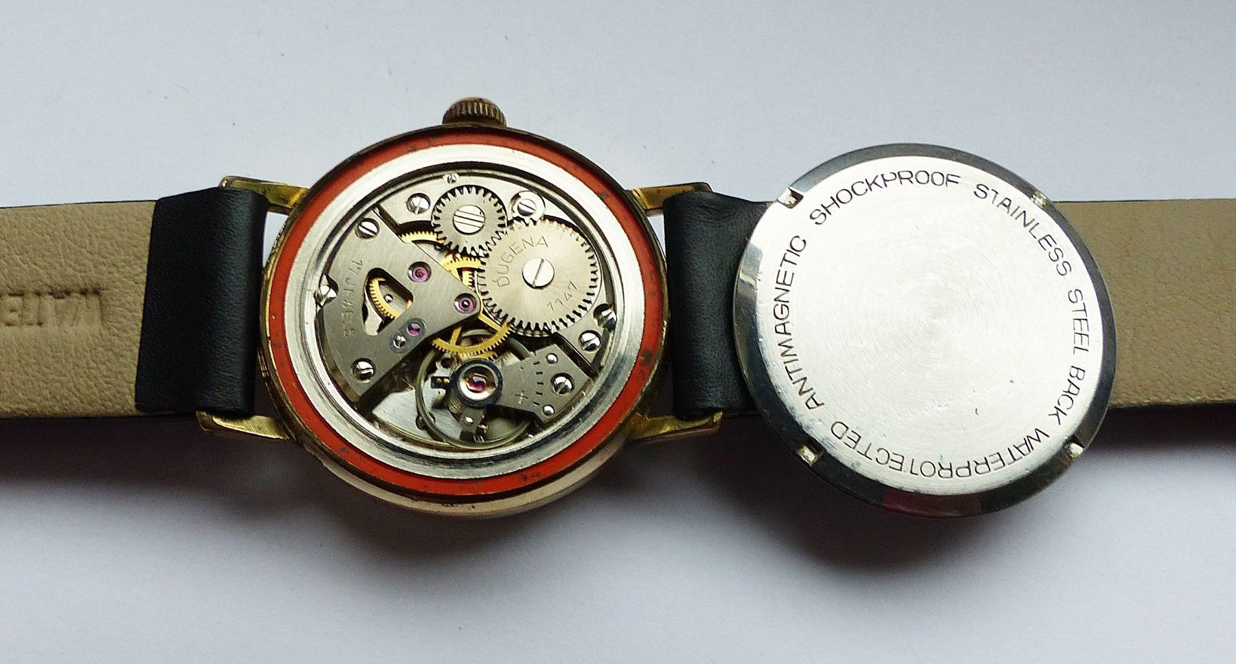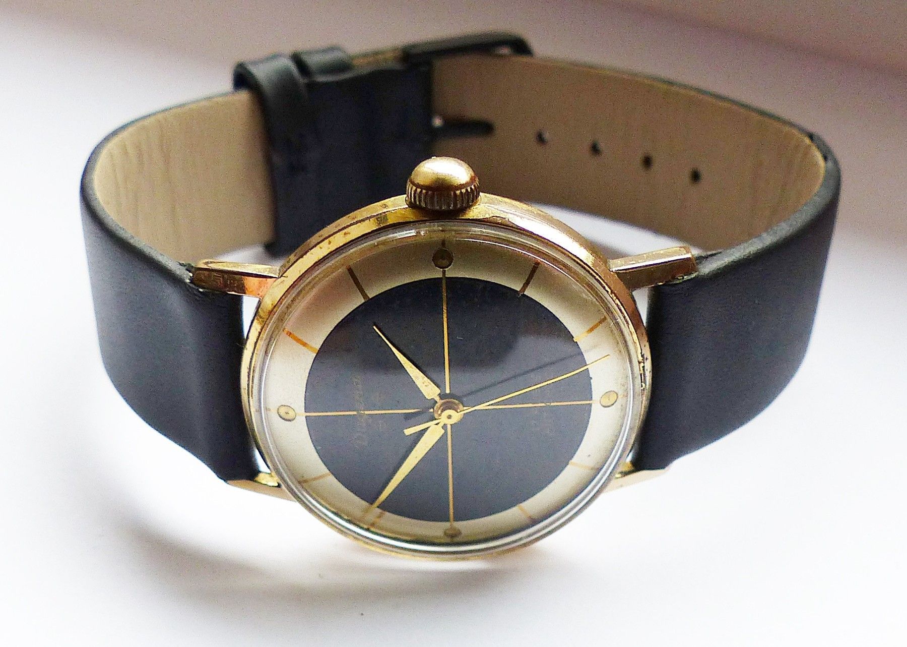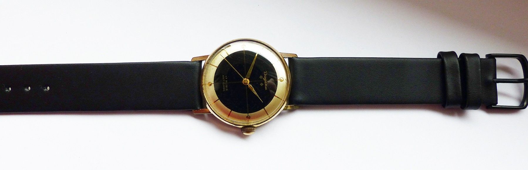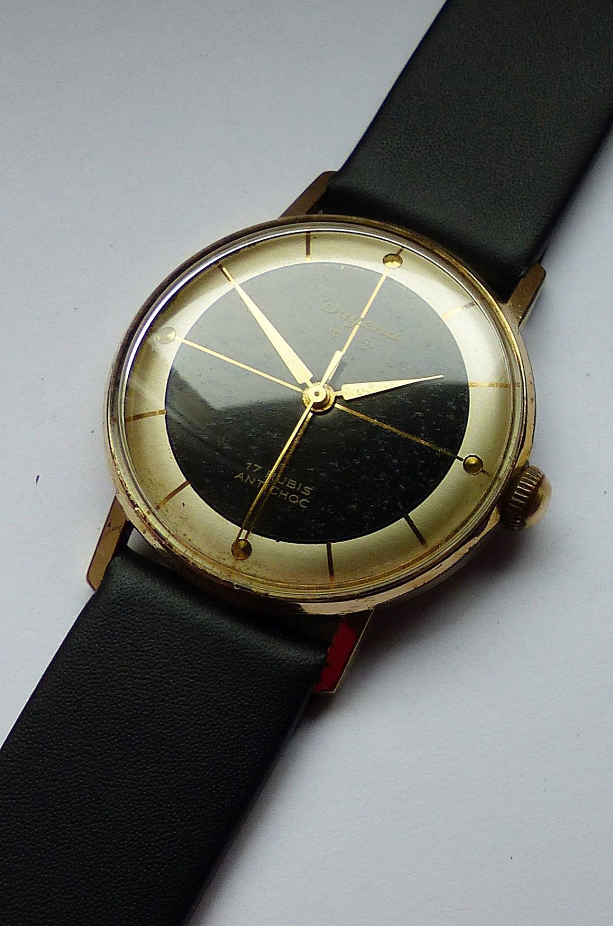 Schöne Dugena Classic 2Tone Herren Vintage Armbanduhr mit 2farbigen Zifferblatt in Gold und Schwarz mit aufgesetzten Goldenen Punkt und Strichindexen, grosser zentraler Sekunde. Die Uhr ist voll funktionsfähig und in sehr guten Zustand s. Fotos Uhrwerk : Kaliber Dugena 7147 Mechanischer Handaufzug m
