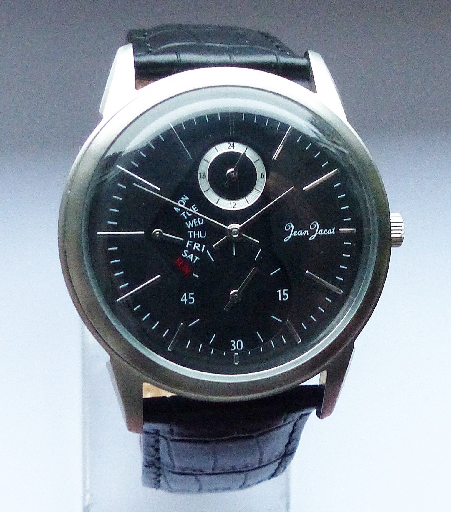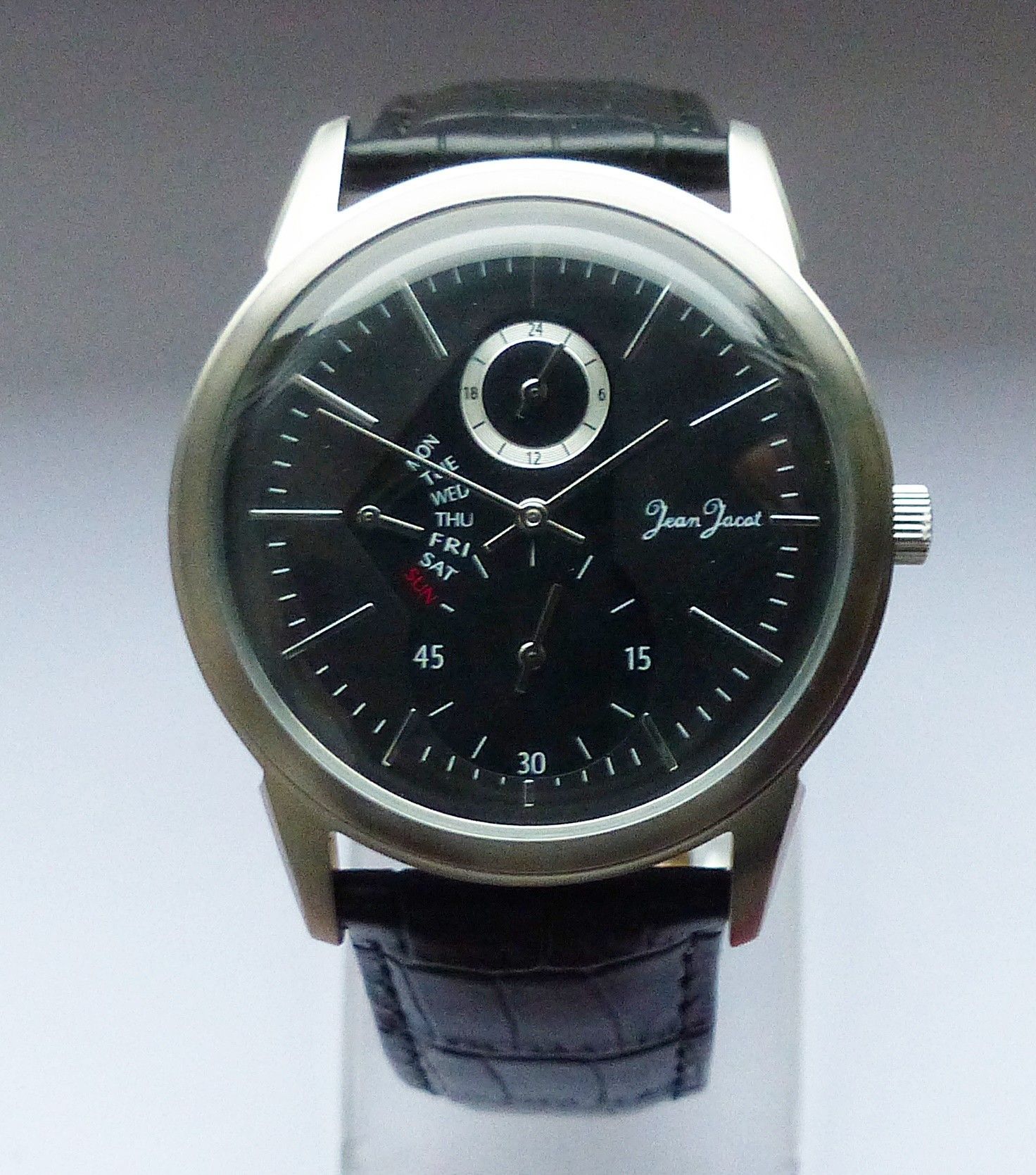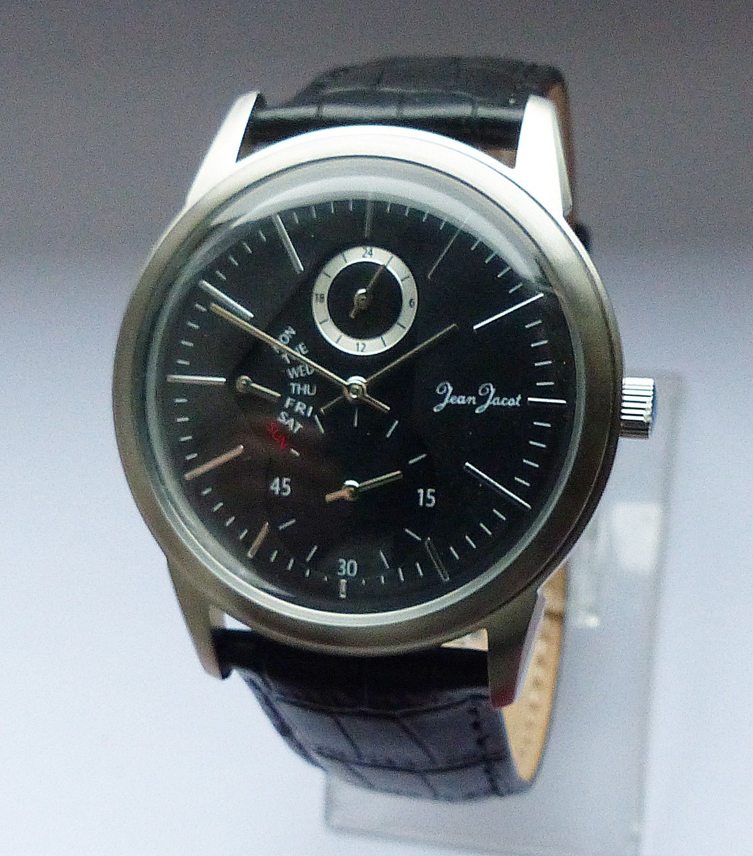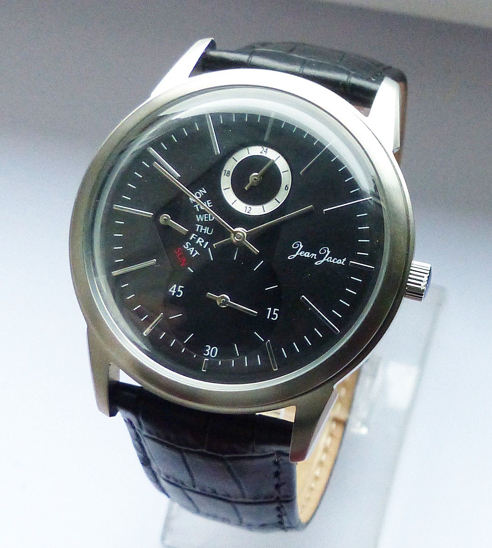 Schöne Jean Jacot Multimeter Herren Armbanduhr mit Schwarzem Zifferblatt und aufgesetzten Silbernen Strichindizes, permanenter dezentraler kleiner Sekunde bei 6.00 Uhr, Tagesanzeige bei 9.00 Uhr, 24Stundenanzeige bei 12.00 Uhr. Die Uhr ist voll funktionsfähig und in ungetragenen neuen Zustand s. Fot