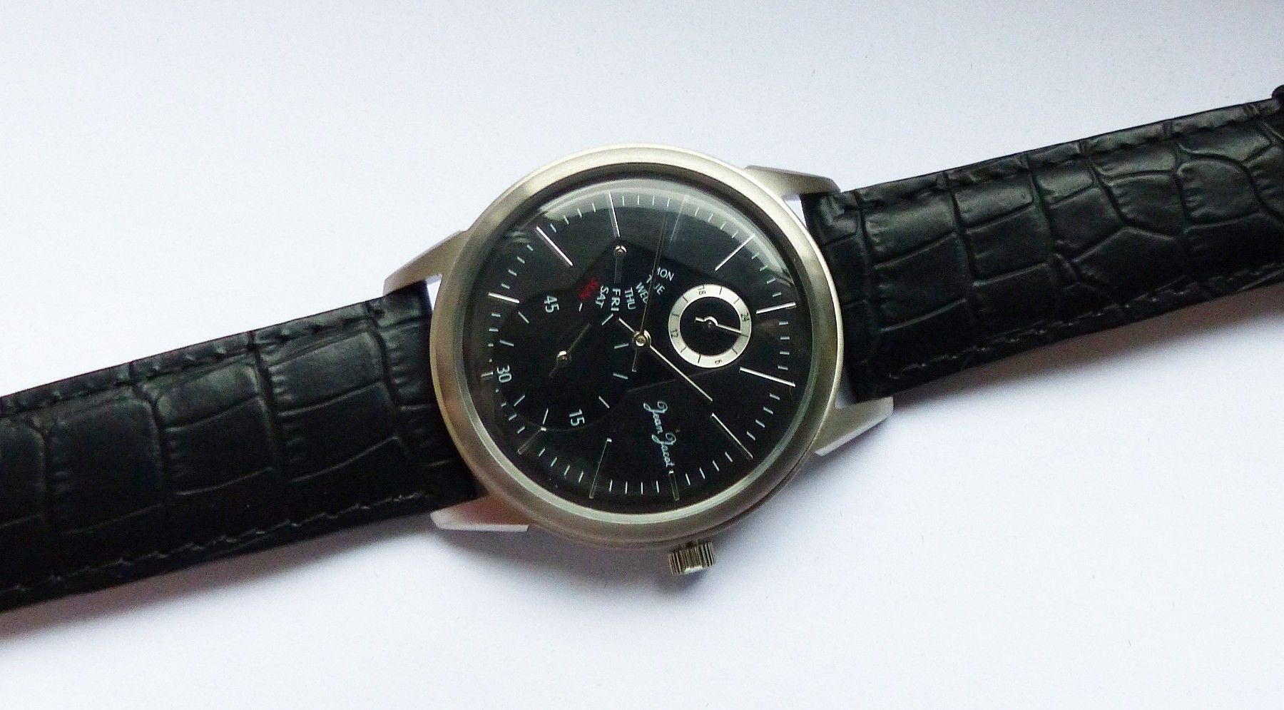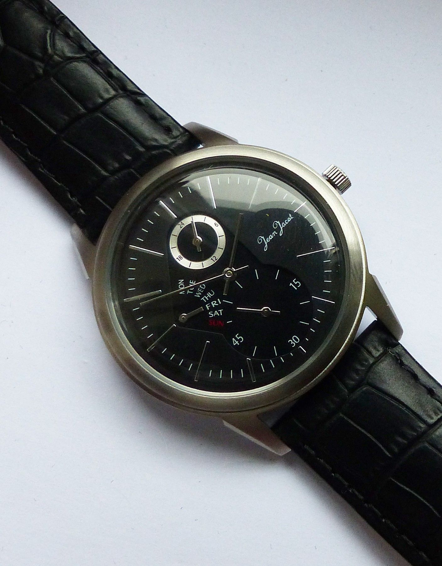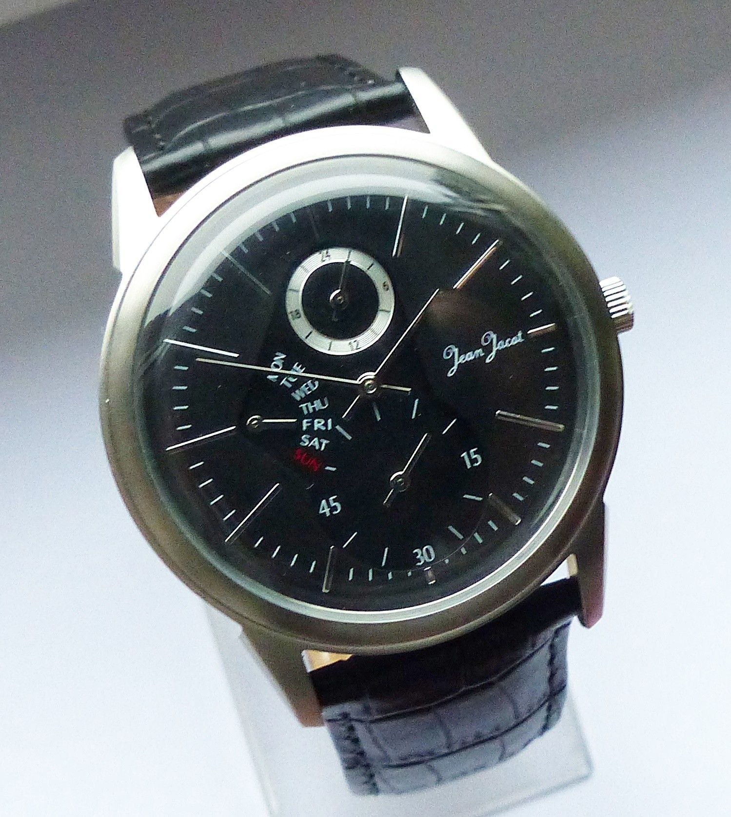 Schöne Jean Jacot Multimeter Herren Armbanduhr mit Schwarzem Zifferblatt und aufgesetzten Silbernen Strichindizes, permanenter dezentraler kleiner Sekunde bei 6.00 Uhr, Tagesanzeige bei 9.00 Uhr, 24Stundenanzeige bei 12.00 Uhr. Die Uhr ist voll funktionsfähig und in ungetragenen neuen Zustand s. Fot