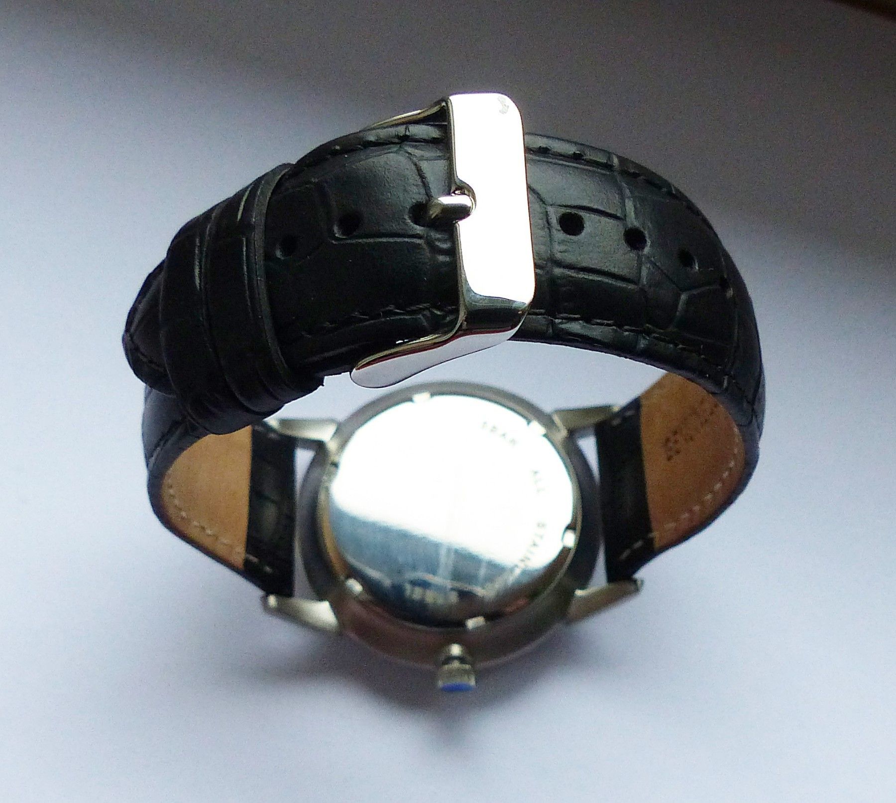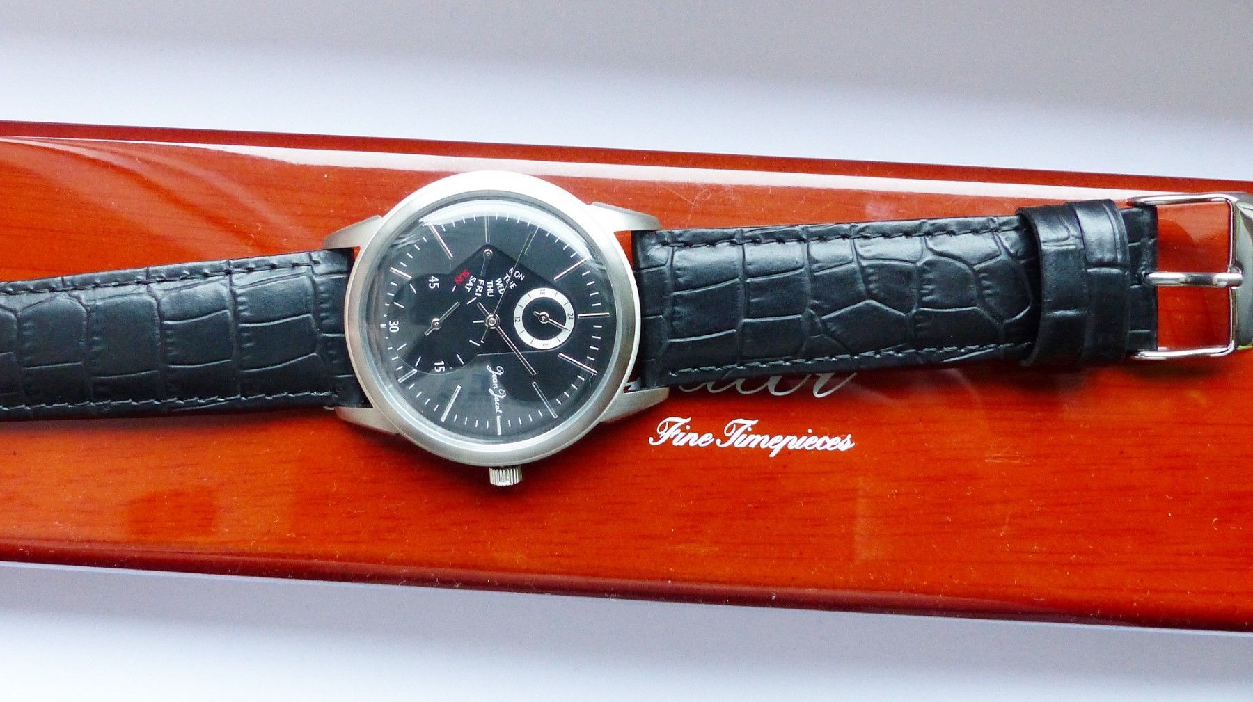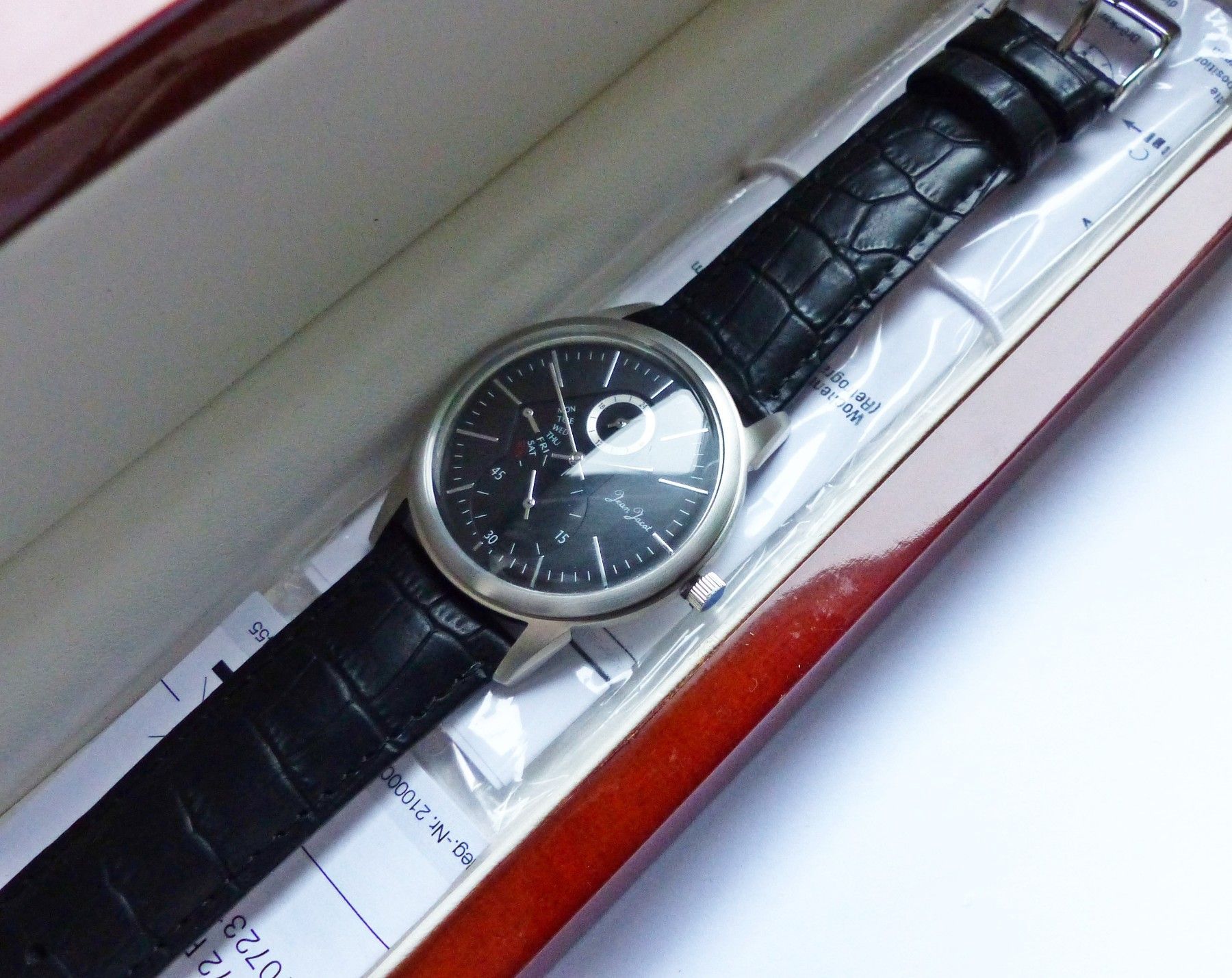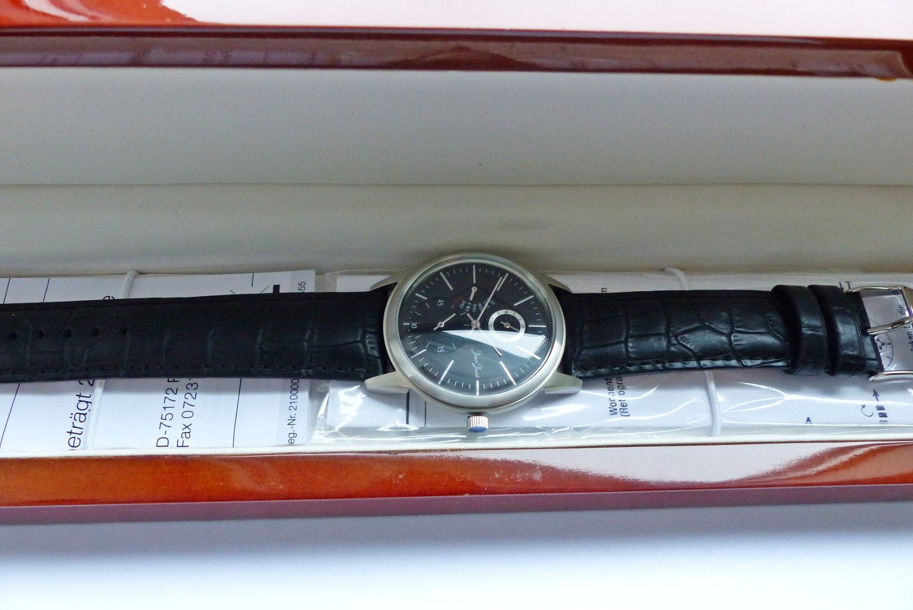 Schöne Jean Jacot Multimeter Herren Armbanduhr mit Schwarzem Zifferblatt und aufgesetzten Silbernen Strichindizes, permanenter dezentraler kleiner Sekunde bei 6.00 Uhr, Tagesanzeige bei 9.00 Uhr, 24Stundenanzeige bei 12.00 Uhr. Die Uhr ist voll funktionsfähig und in ungetragenen neuen Zustand s. Fot