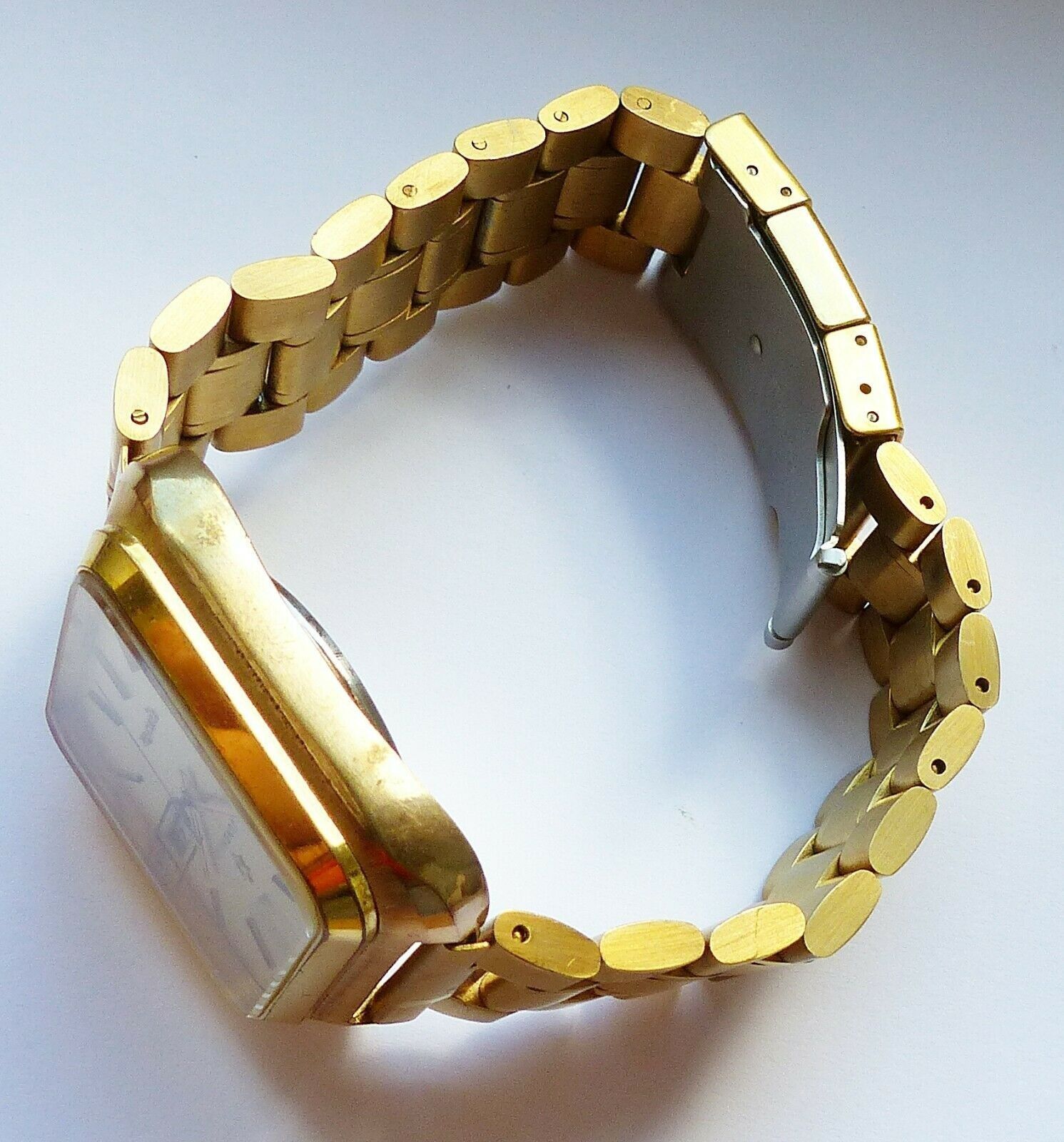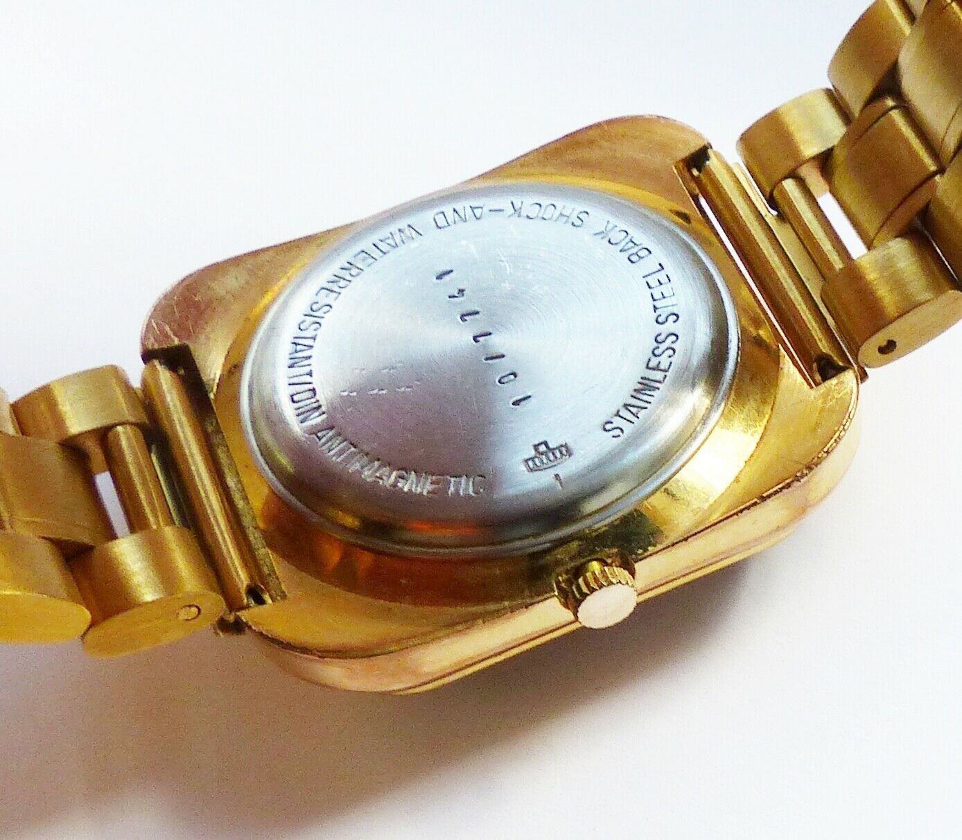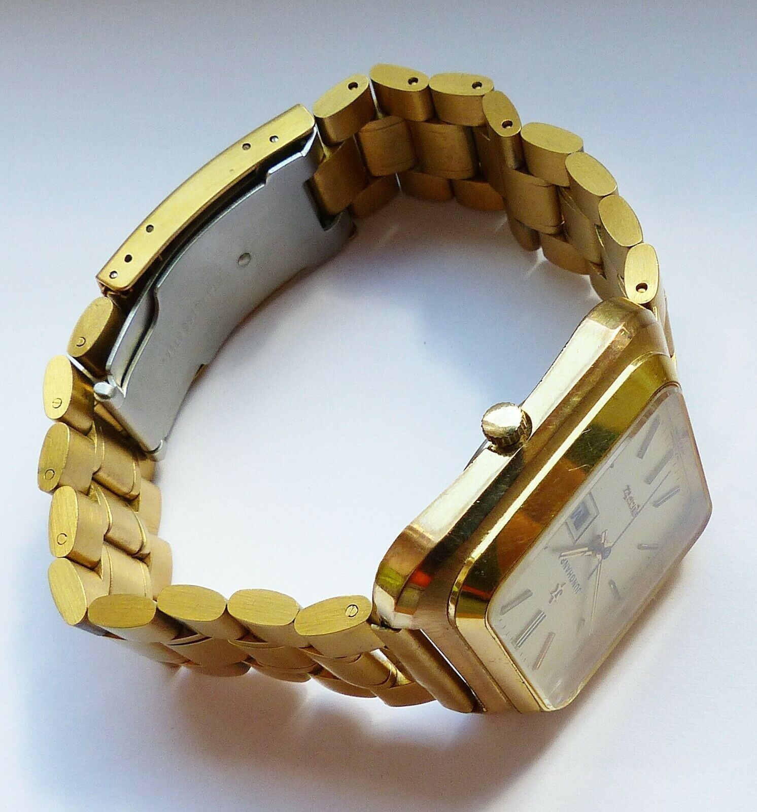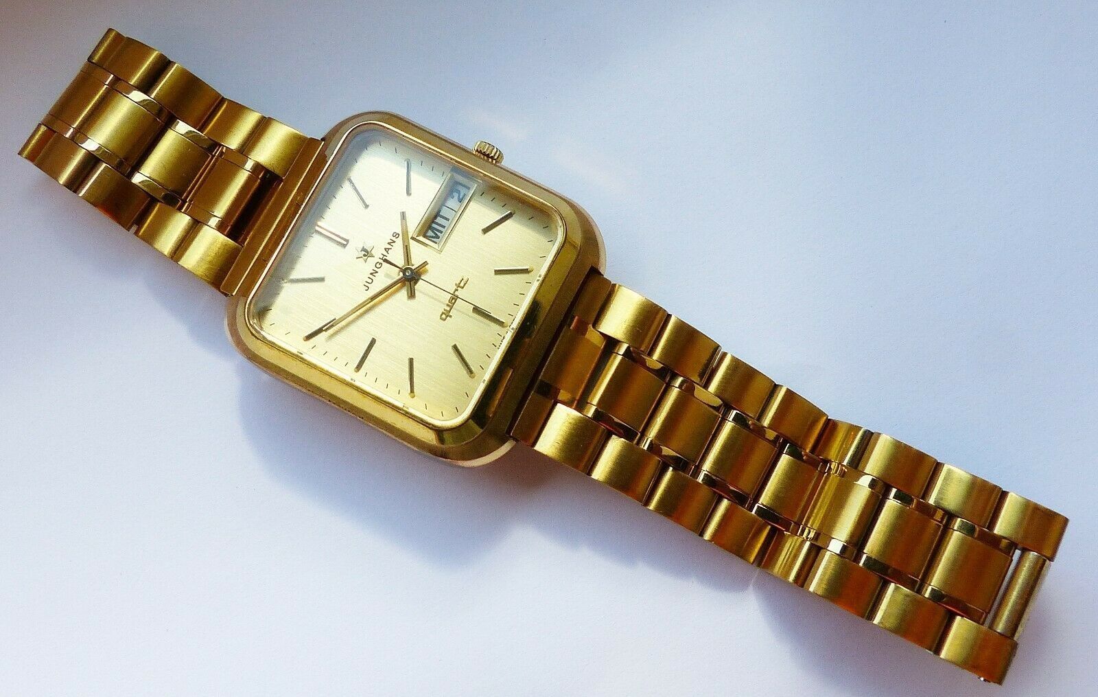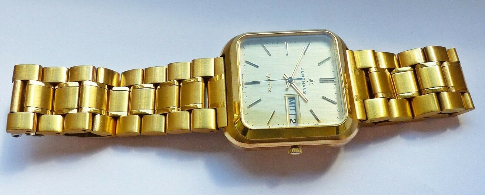 Schöne Junghans Day-Date Herren Vintage Armbanduhr mit Goldenem Zifferblatt und aufgesetzten Goldenen Strichindexen, grosser zentraler Sekunde, Datum und Wochentag auf 3.00 Uhr, fluoreszierenden Zeigern und Indexpunkten. Die Uhr ist voll funktionsfähig und in ungetragenen neuwertigen Zustand s. Foto