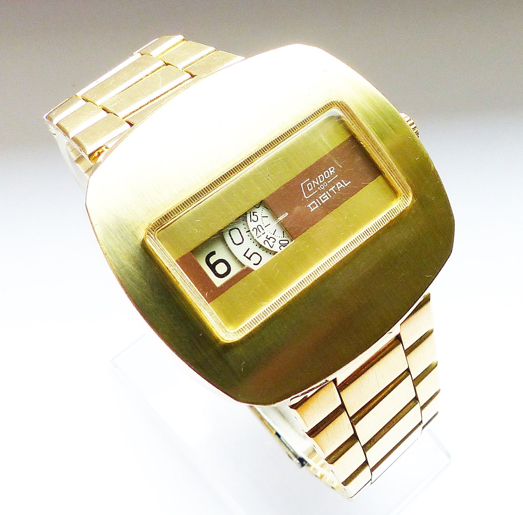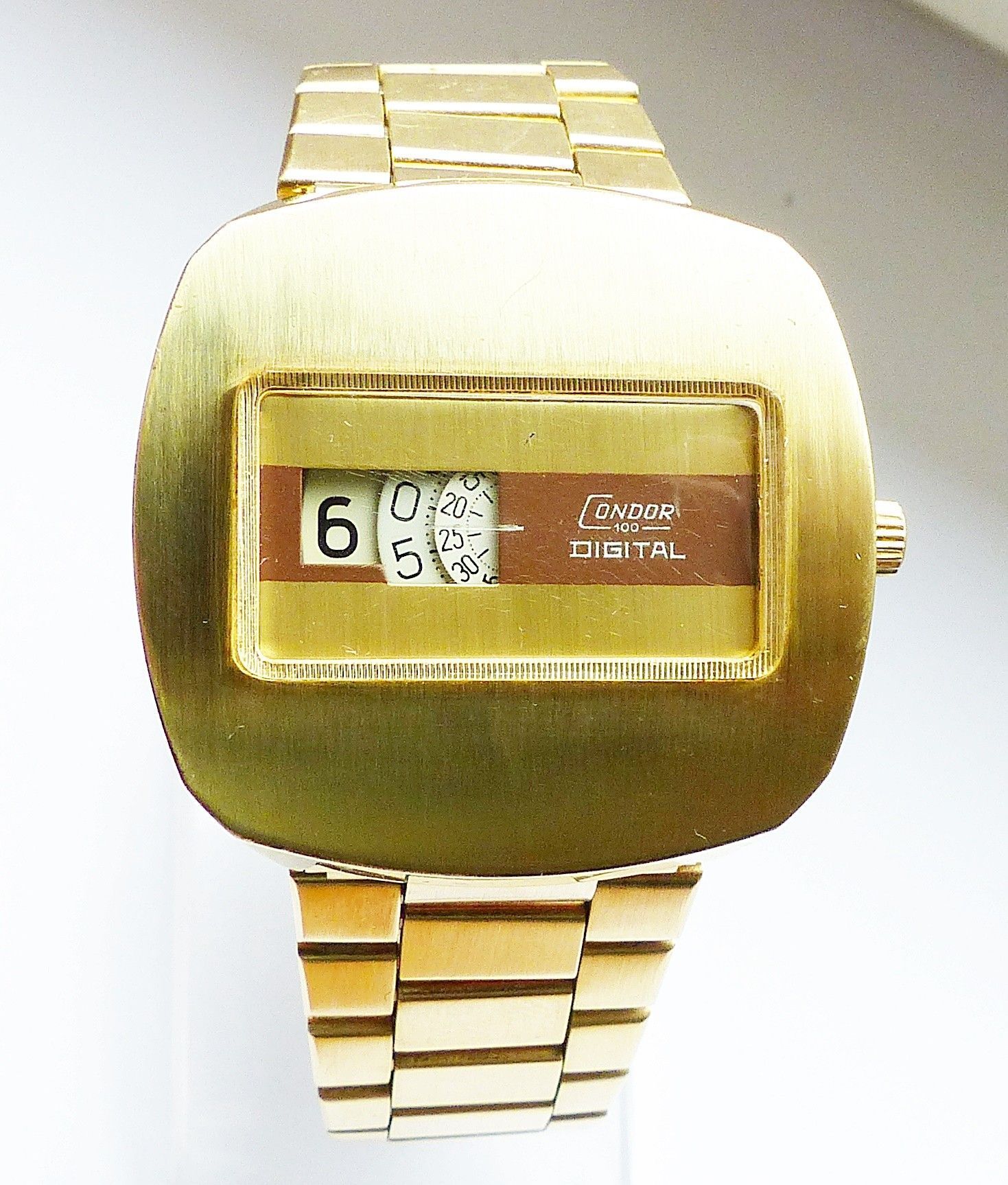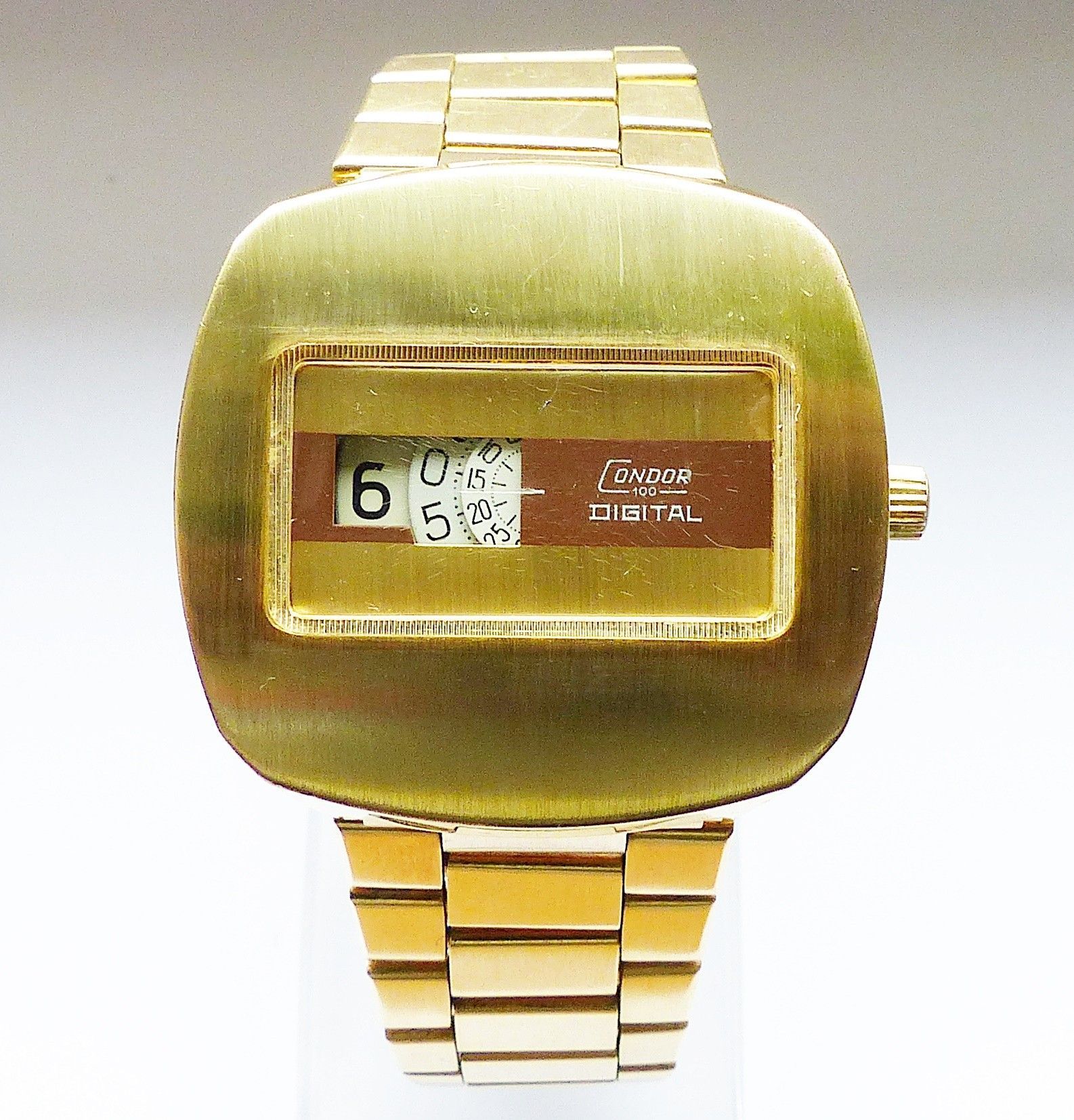 Schöne und seltene Condor 100 Digital Scheibenuhr Herren Vintage Armbanduhr mit Gold-Braunen Zifferblatt und arabischen Zahlenindexen, die Uhr ist voll funktionsfähig und in Top Zustand s. Fotos Hersteller : Condor Era Watch Co. Ltd. Schweiz Uhrwerk : Mechanischer Handaufzug mit 17Jewels Maße Gehäus