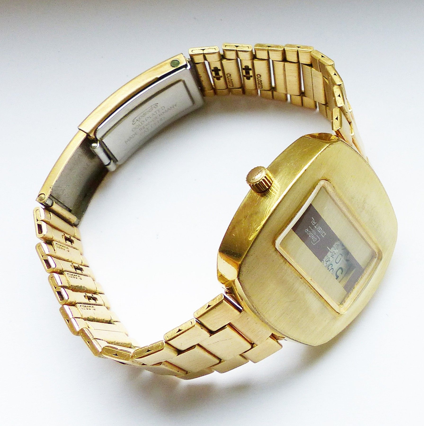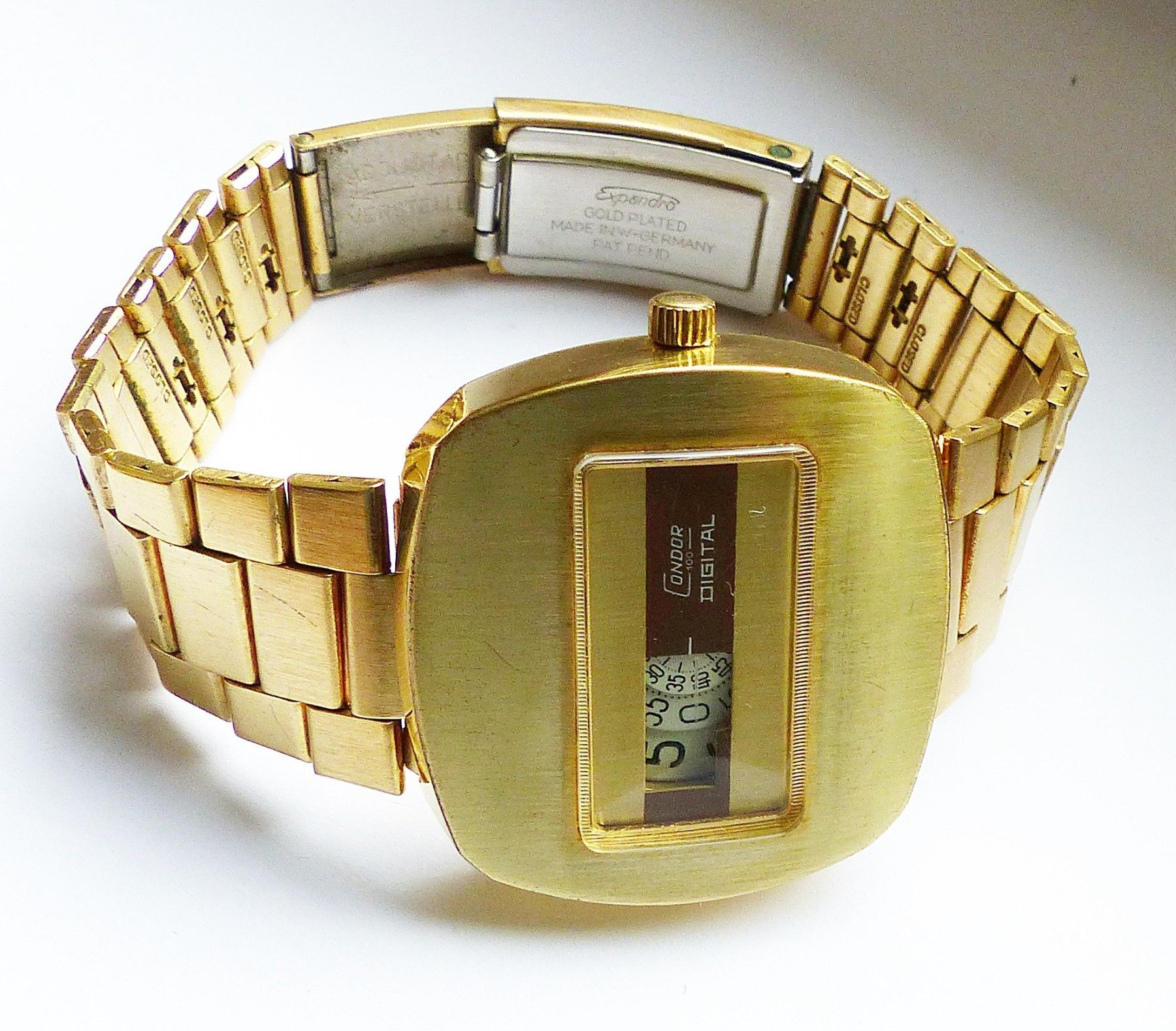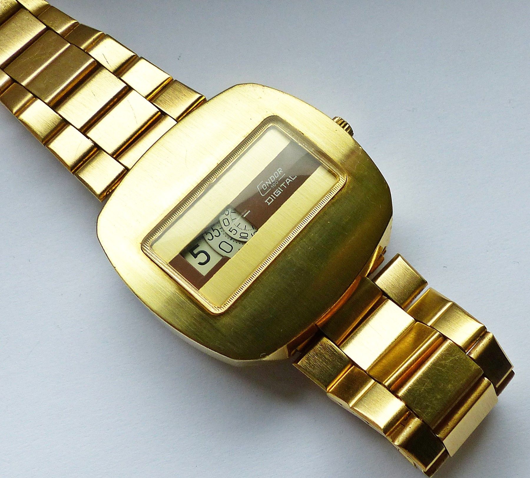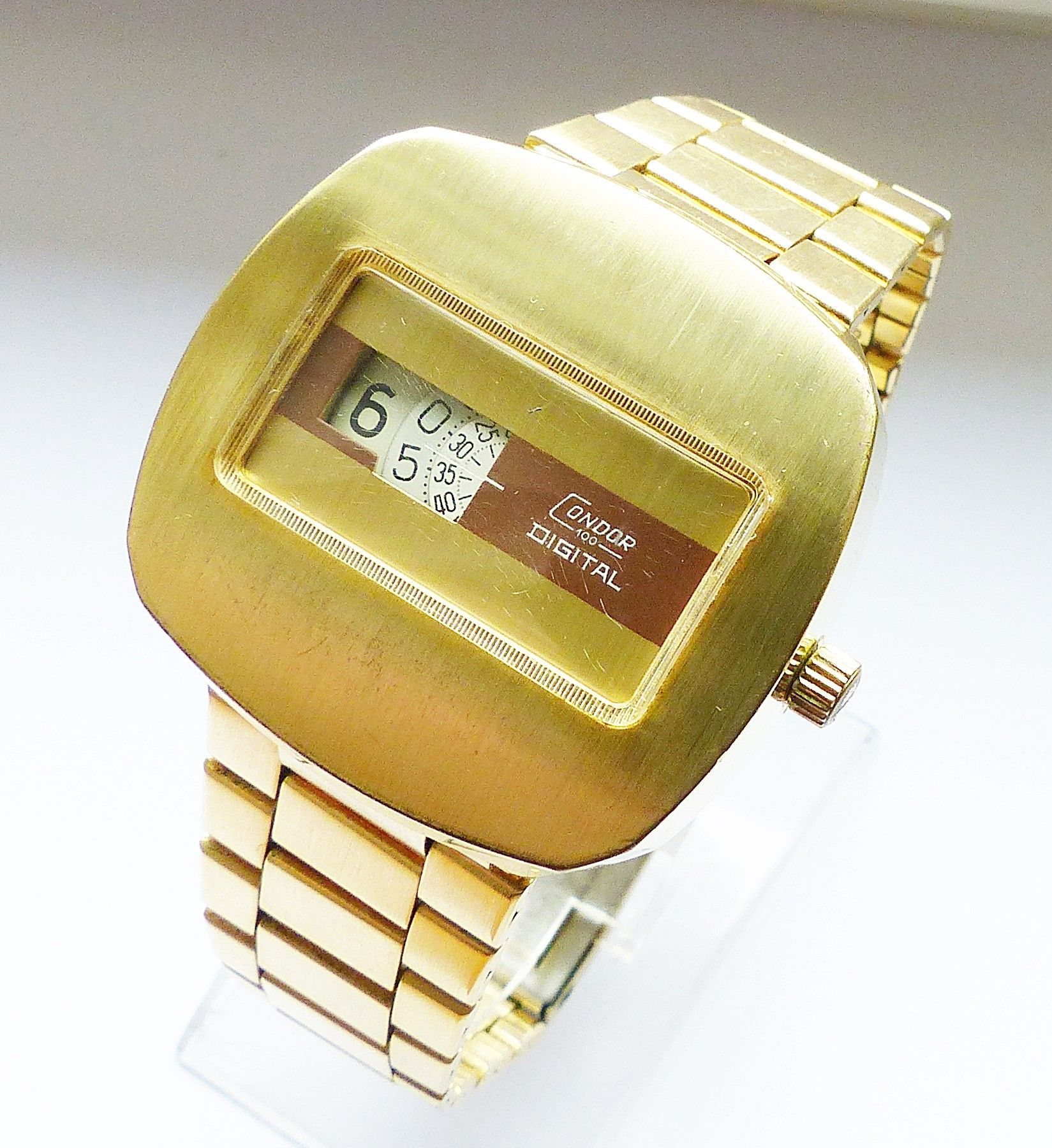 Schöne und seltene Condor 100 Digital Scheibenuhr Herren Vintage Armbanduhr mit Gold-Braunen Zifferblatt und arabischen Zahlenindexen, die Uhr ist voll funktionsfähig und in Top Zustand s. Fotos Hersteller : Condor Era Watch Co. Ltd. Schweiz Uhrwerk : Mechanischer Handaufzug mit 17Jewels Maße Gehäus