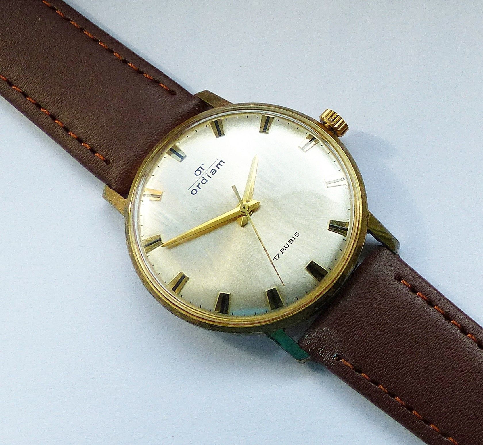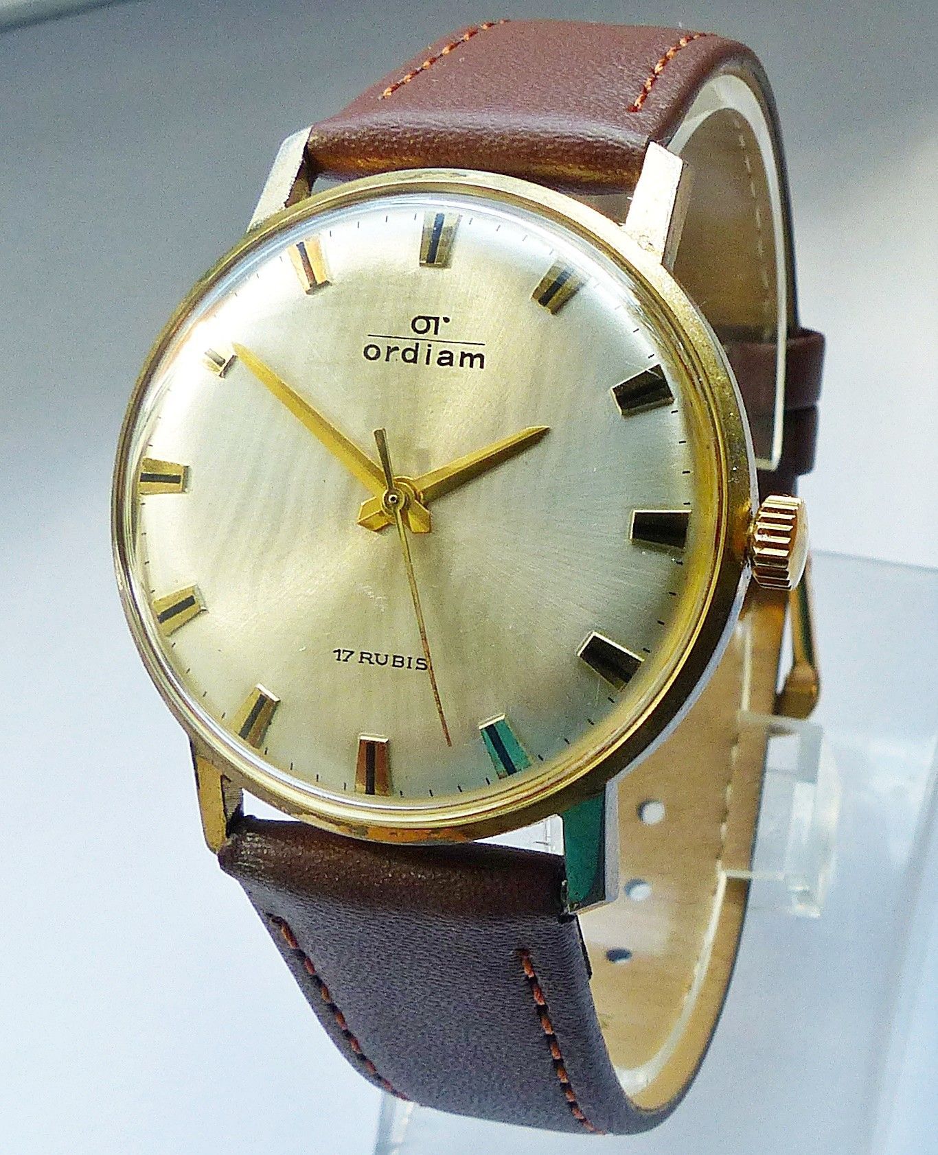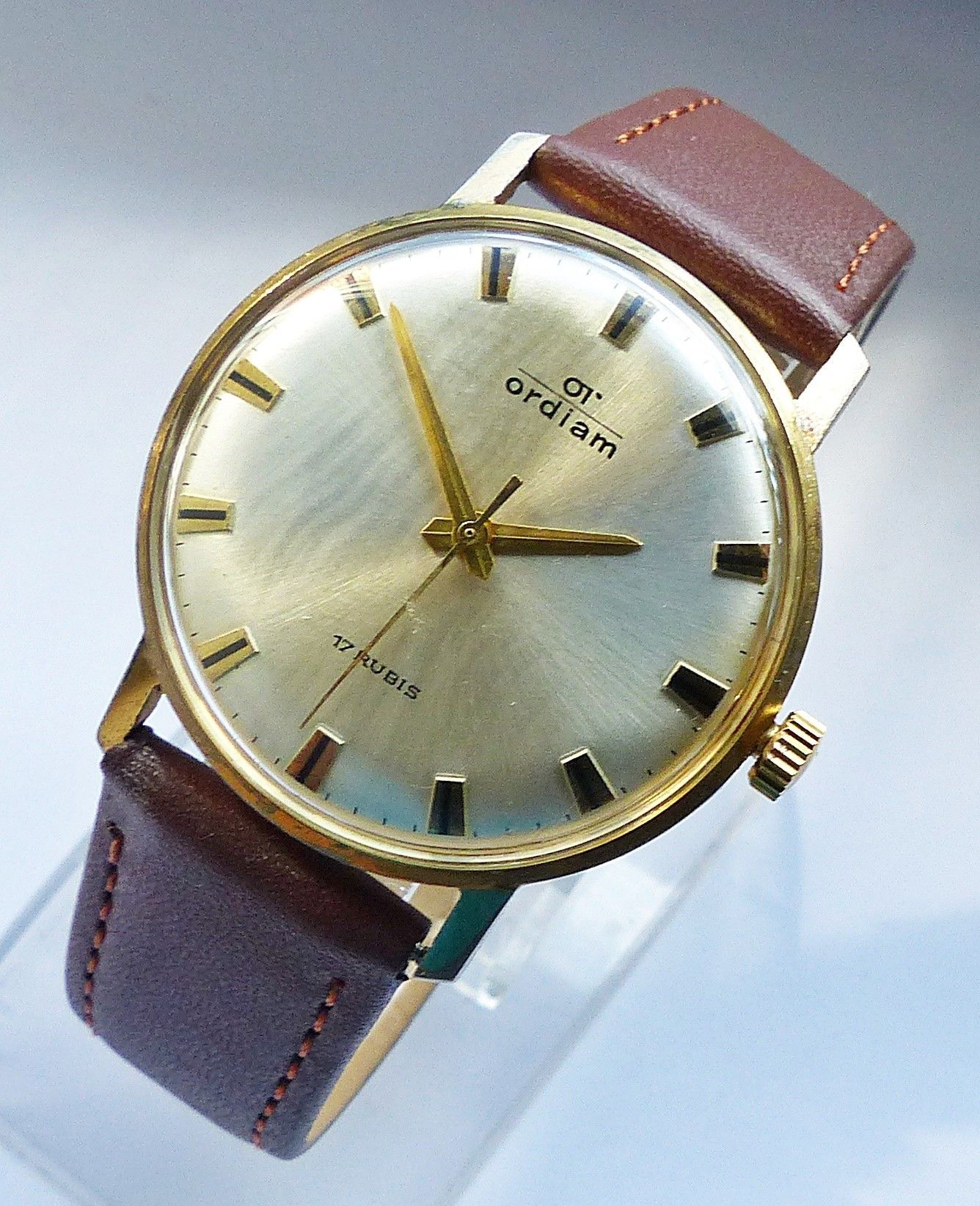 Schöne OT Ordiam ( Ordiam Schmuck-Uhren GmbH ) Herren Vintage Armbanduhr mit Goldenem Zifferblatt und aufgesetzten Schwarz Goldenen Strichindexen, grosser zentraler Sekunde und schönen Goldenen Lanzenzeigern. Die Uhr ist voll funktionsfähig und in sehr guten Zustand s. Fotos Hersteller : OT Ordiam D