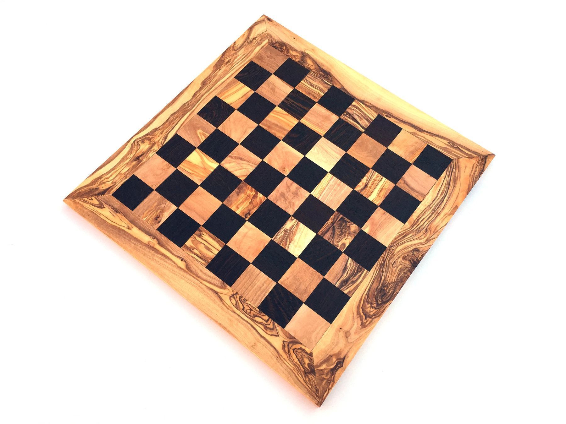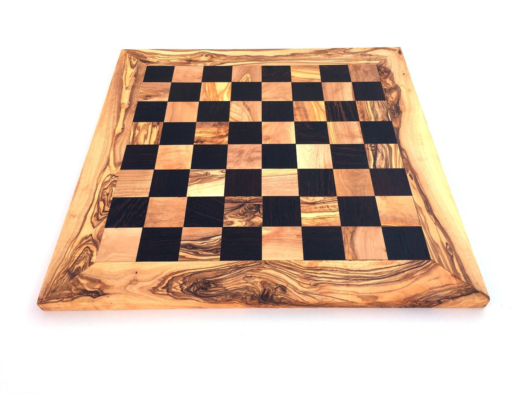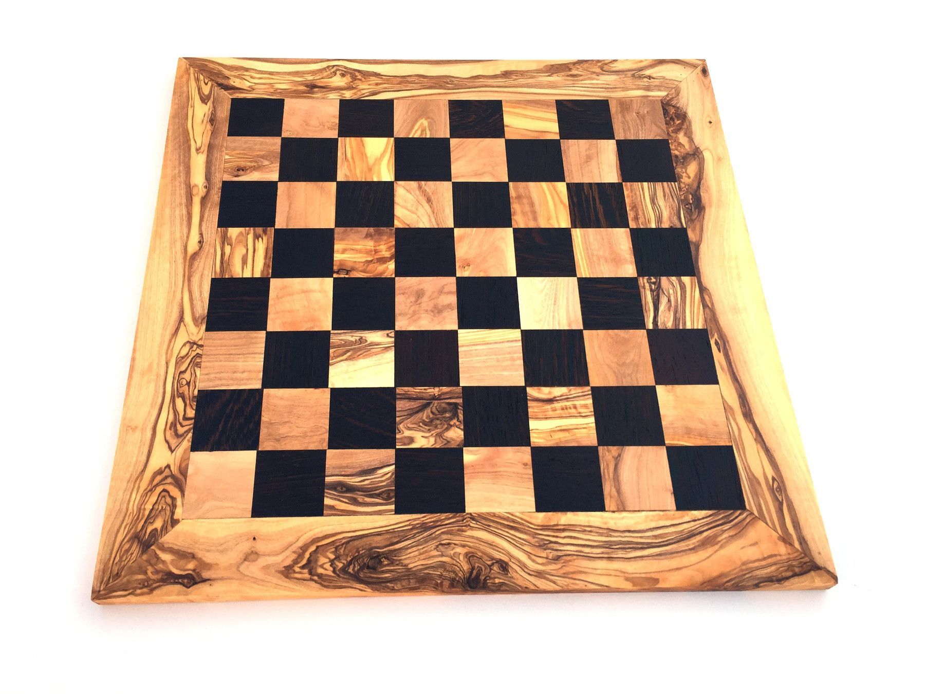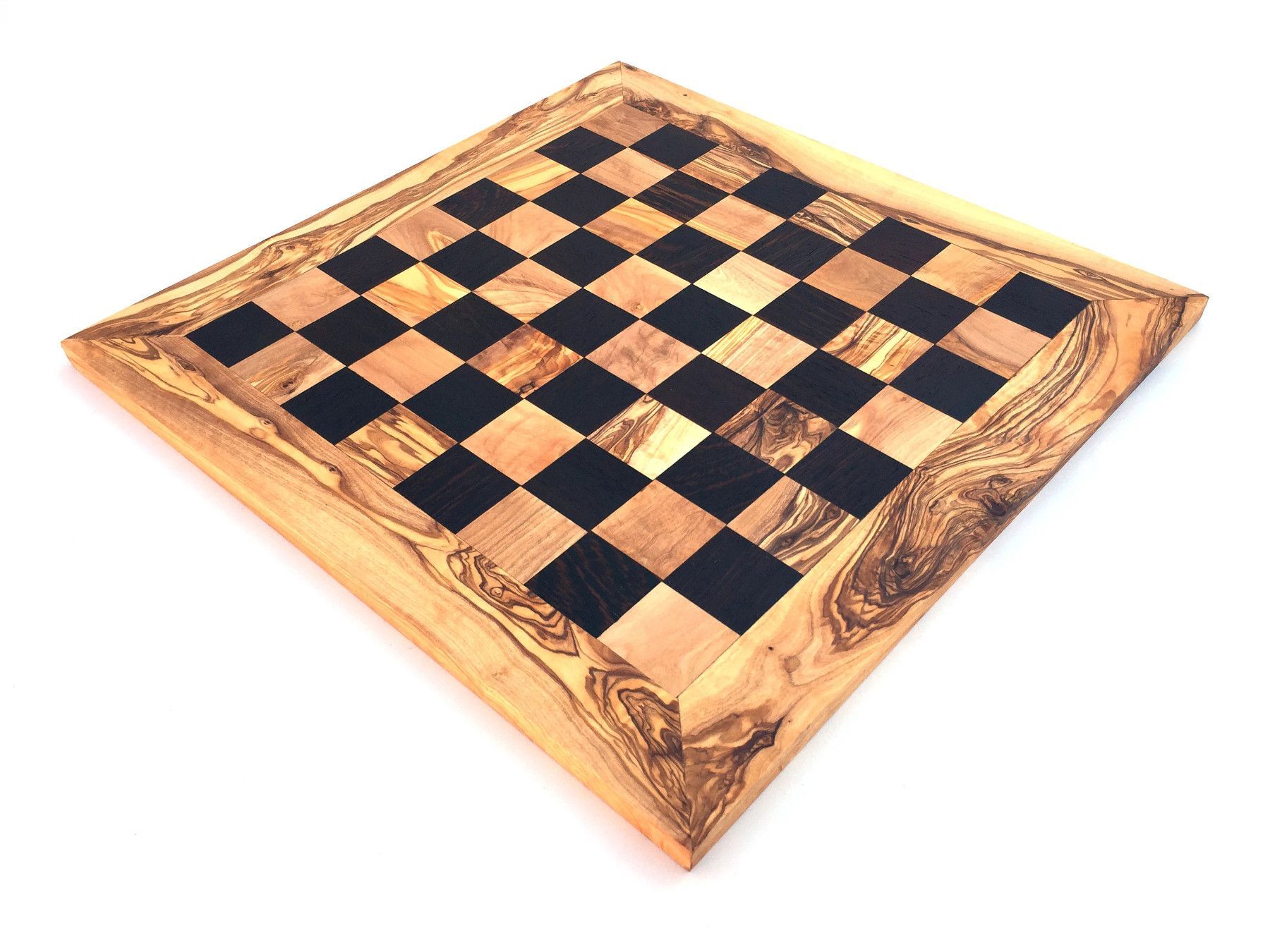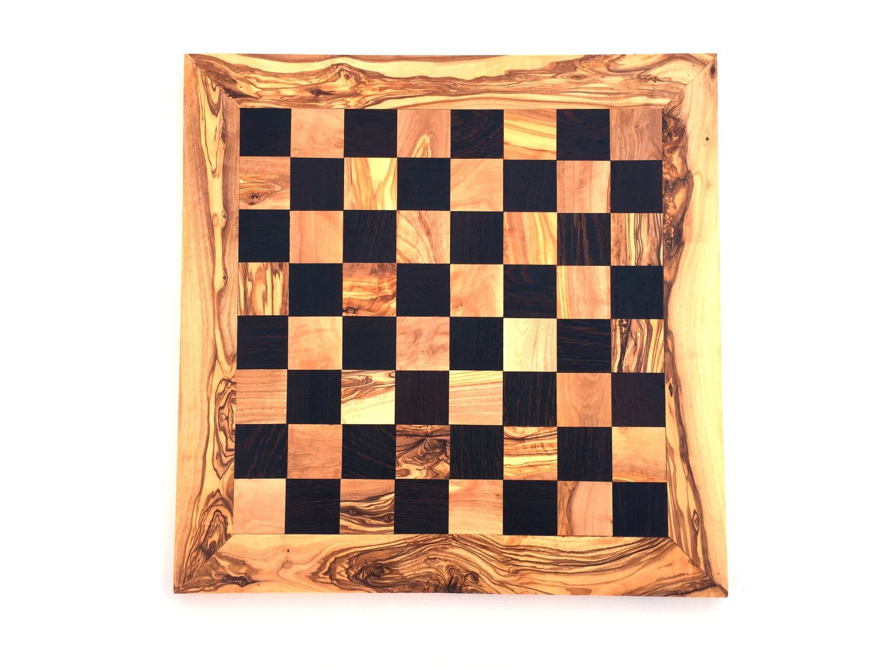 Schachbrett Das Schachbrett ist aus Olivenholz und Wenge in Handarbeit angefertigt. Der künstlerisch begabte Handwerker hat jedes Stück einzeln per Hand hergestellt, was jedes Stück zu einem Unikat macht. Die einzigartige rötlich-braune Maserung mit einem unregelmäßigen Faserverlauf auf glatter Ober