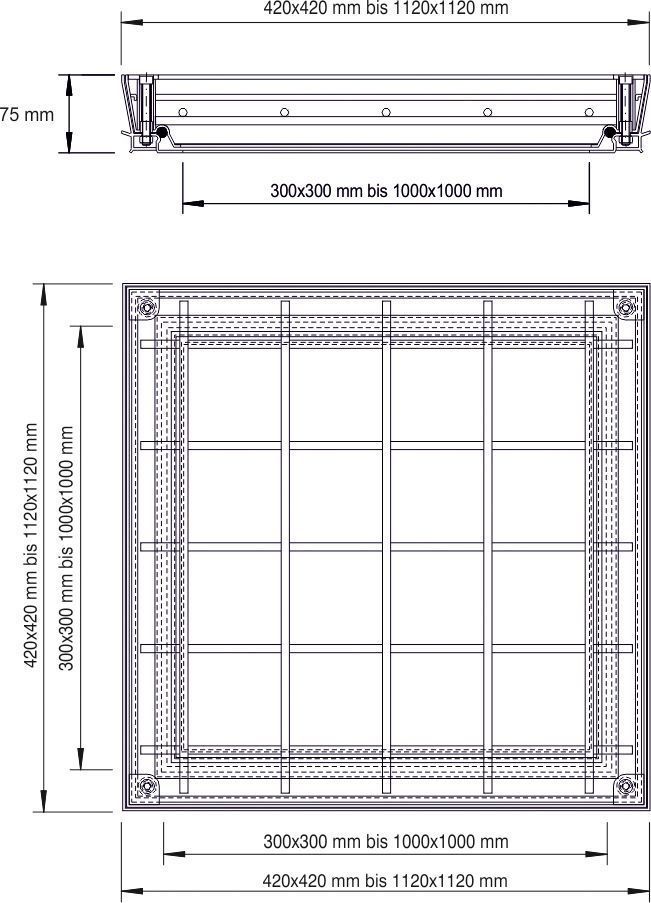 Schachtabdeckung PRO+ Aluminium zum Befüllen, Produktbeschreibung: Die Schachtabdeckung System PRO+ ist aus 2,5 mm Aluminium gefertigt. Die Wannentiefe beträgt 65 mm und die Aufbauhöhe nur 75 mm. Die Zarge ist mit einer umlaufenden frost- und witterungsbeständigen Spezialdichtung versehen, die geruc